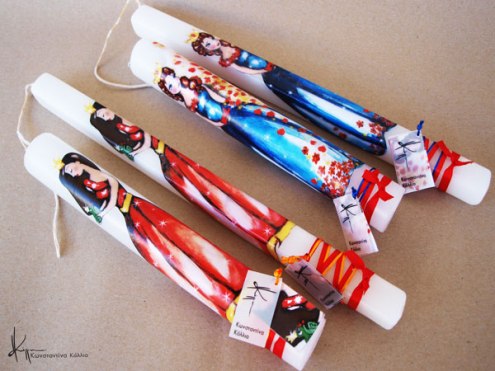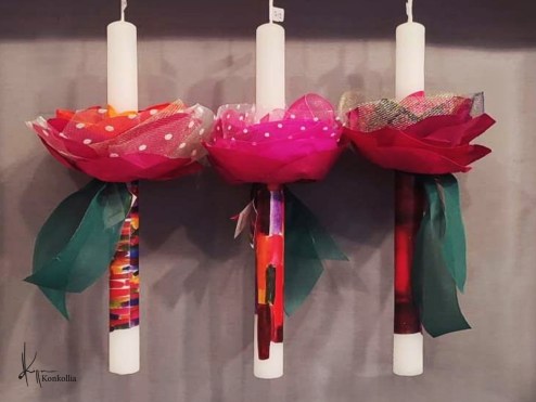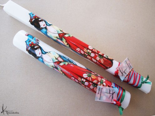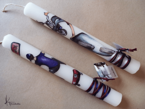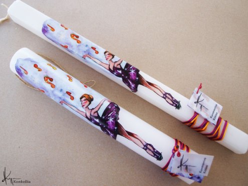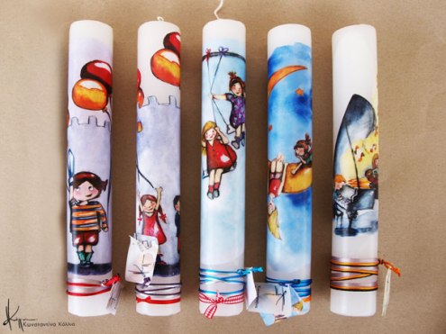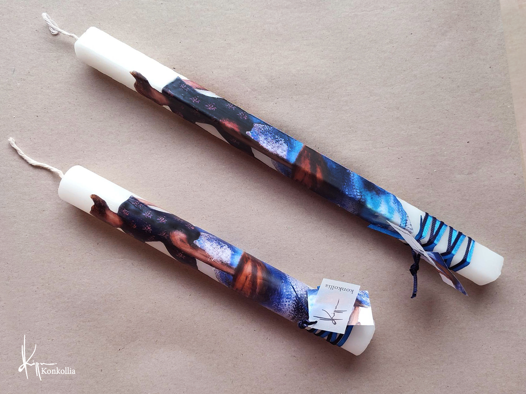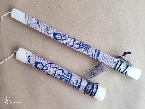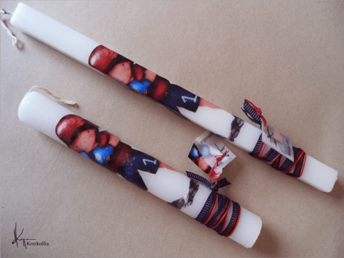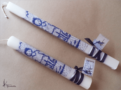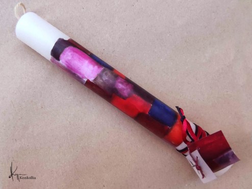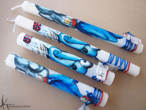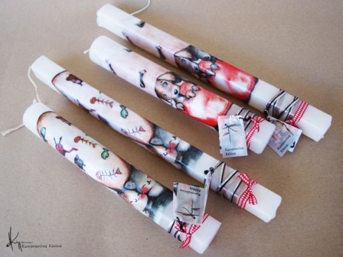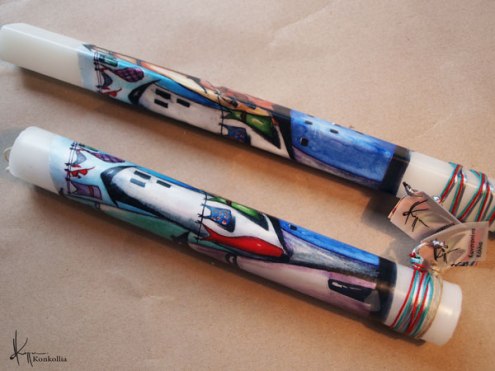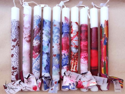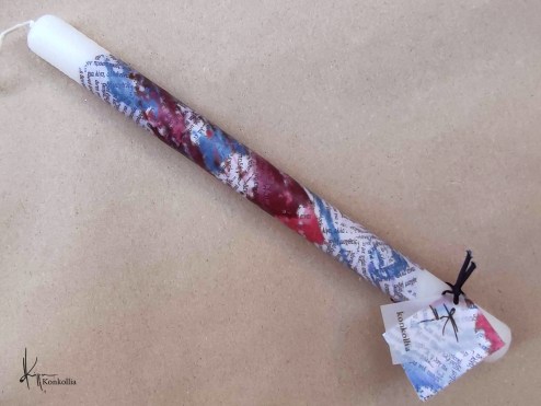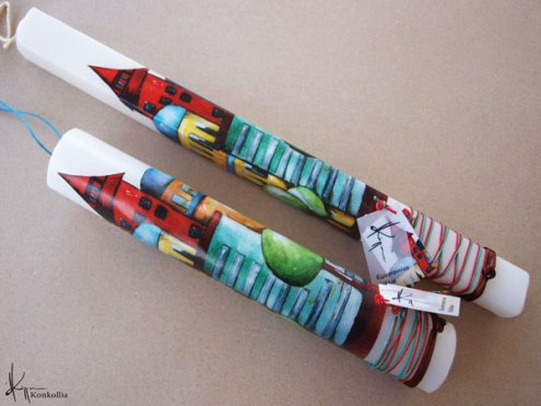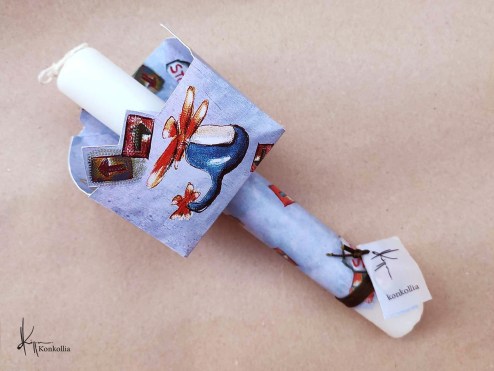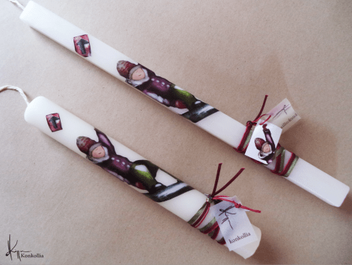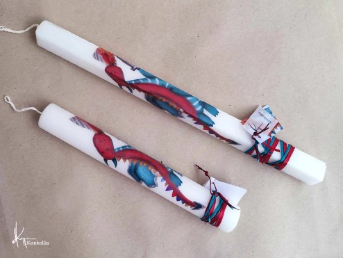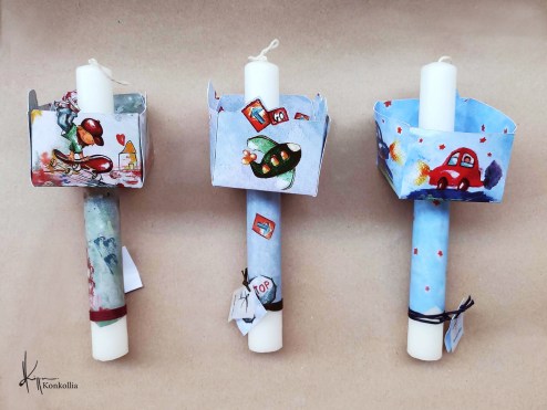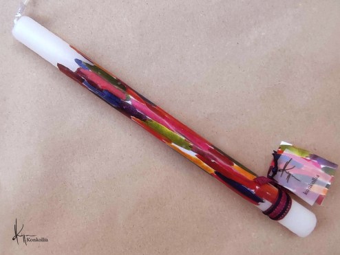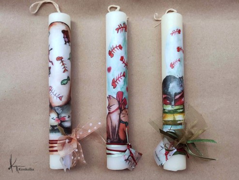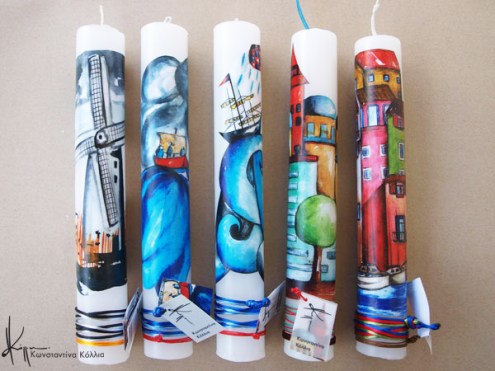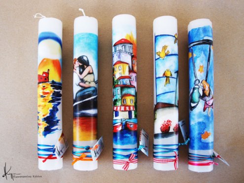 Χειροποίητες πασχαλινές λαμπάδες, κατασκευασμένες με πολύ καλή ποιότητα πρώτης ύλης (παραφίνη). Τα σχέδια τα οποία απεικονίζονται είναι δημιουργίες ζωγραφικής σε ακουαρέλα ή άλλης τεχνικής της Κωνσταντίνας Κόλλια τα οποία ενσωματώνονται μέσα στο κερί. Η συγκεκριμένη τεχνική που έχει επιλέξει η δημιουργός έχει σαν αποτέλεσμα την ευκρίνεια των λεπτομερειών και την καθαρότητα των χρωμάτων των σχεδίων.