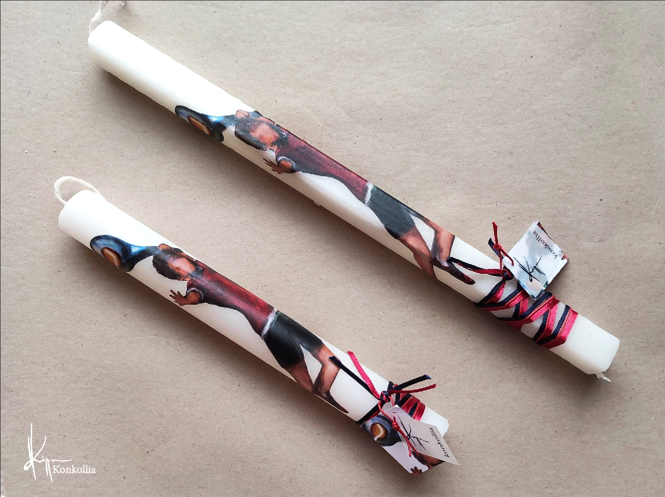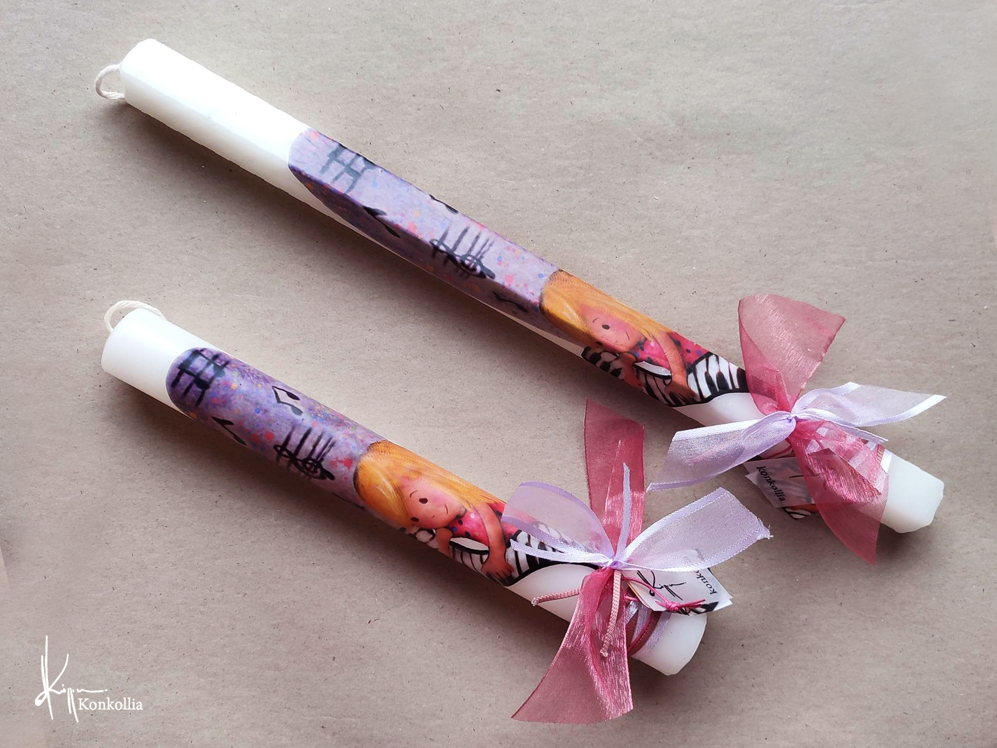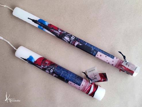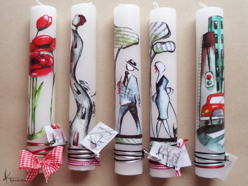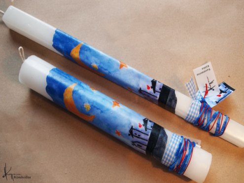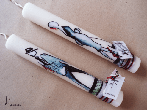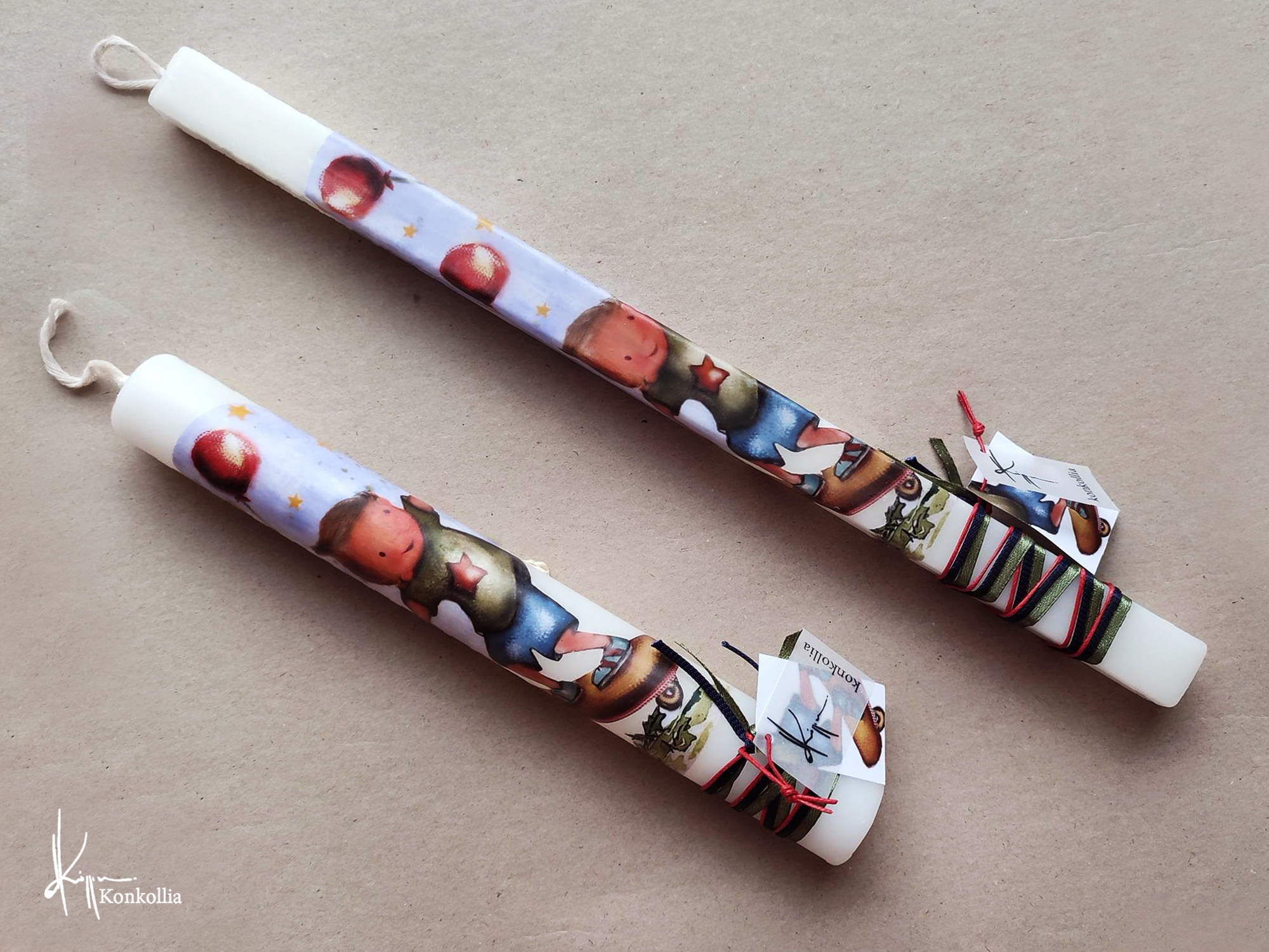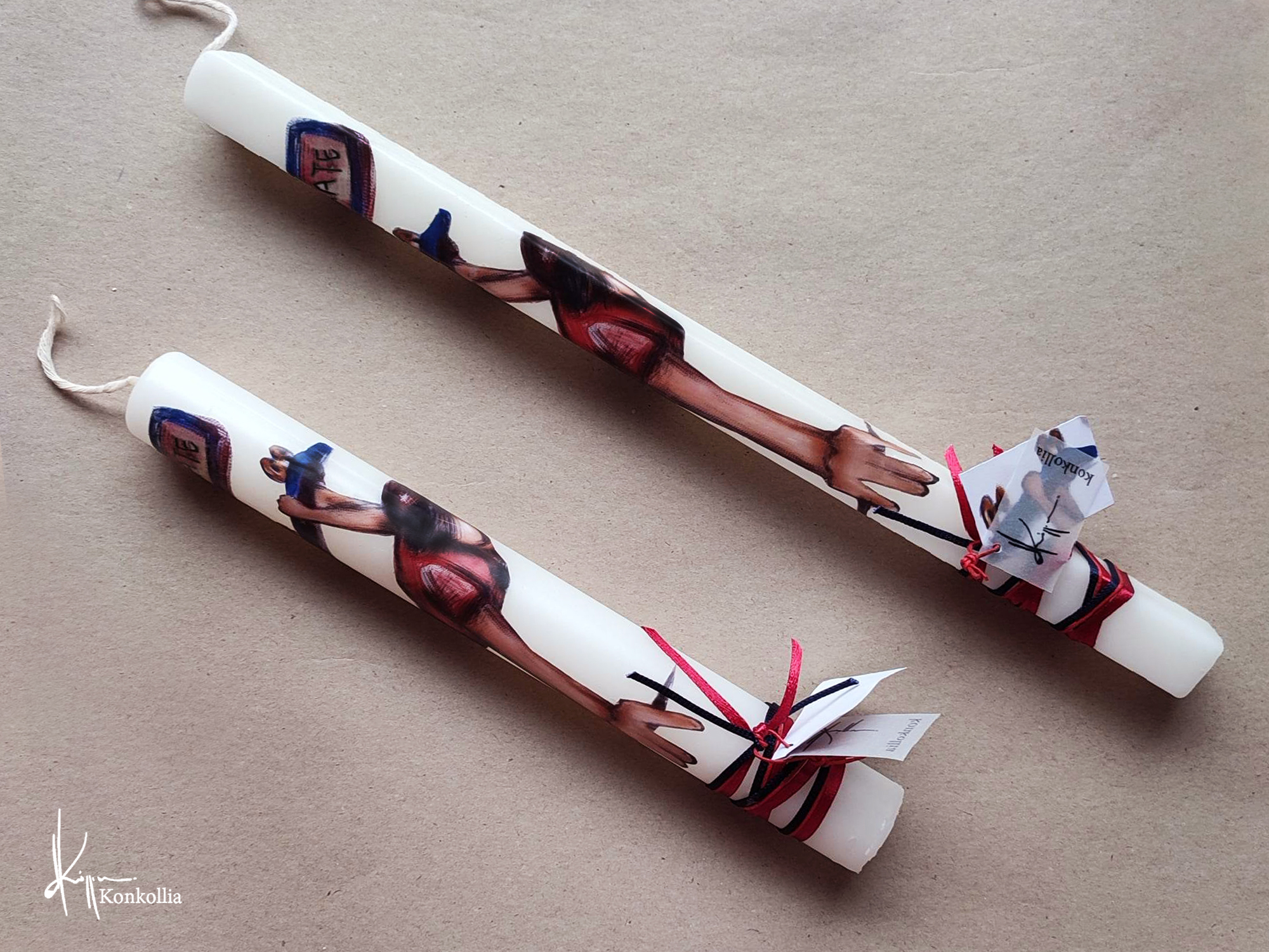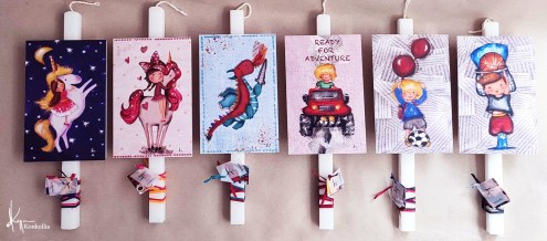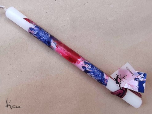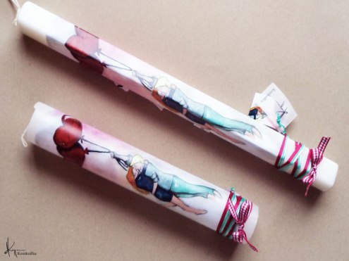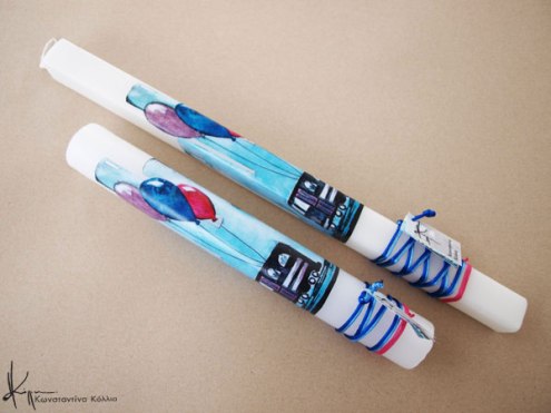 Χειροποίητες πασχαλινές λαμπάδες, κατασκευασμένες με πολύ καλή ποιότητα πρώτης ύλης (παραφίνη). Τα σχέδια τα οποία απεικονίζονται είναι δημιουργίες ζωγραφικής σε ακουαρέλα ή άλλης τεχνικής της Κωνσταντίνας Κόλλια τα οποία ενσωματώνονται μέσα στο κερί. Η συγκεκριμένη τεχνική που έχει επιλέξει η δημιουργός έχει σαν αποτέλεσμα την ευκρίνεια των λεπτομερειών και την καθαρότητα των χρωμάτων των σχεδίων.