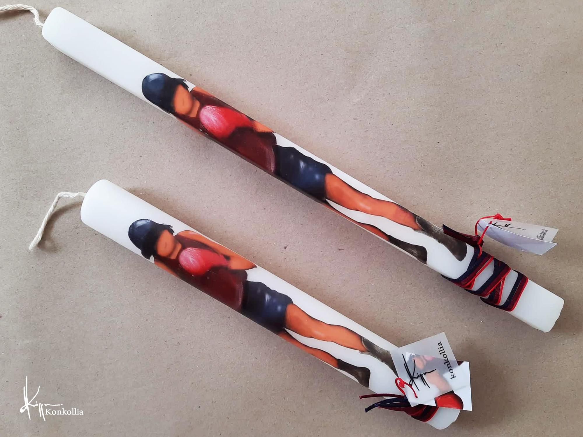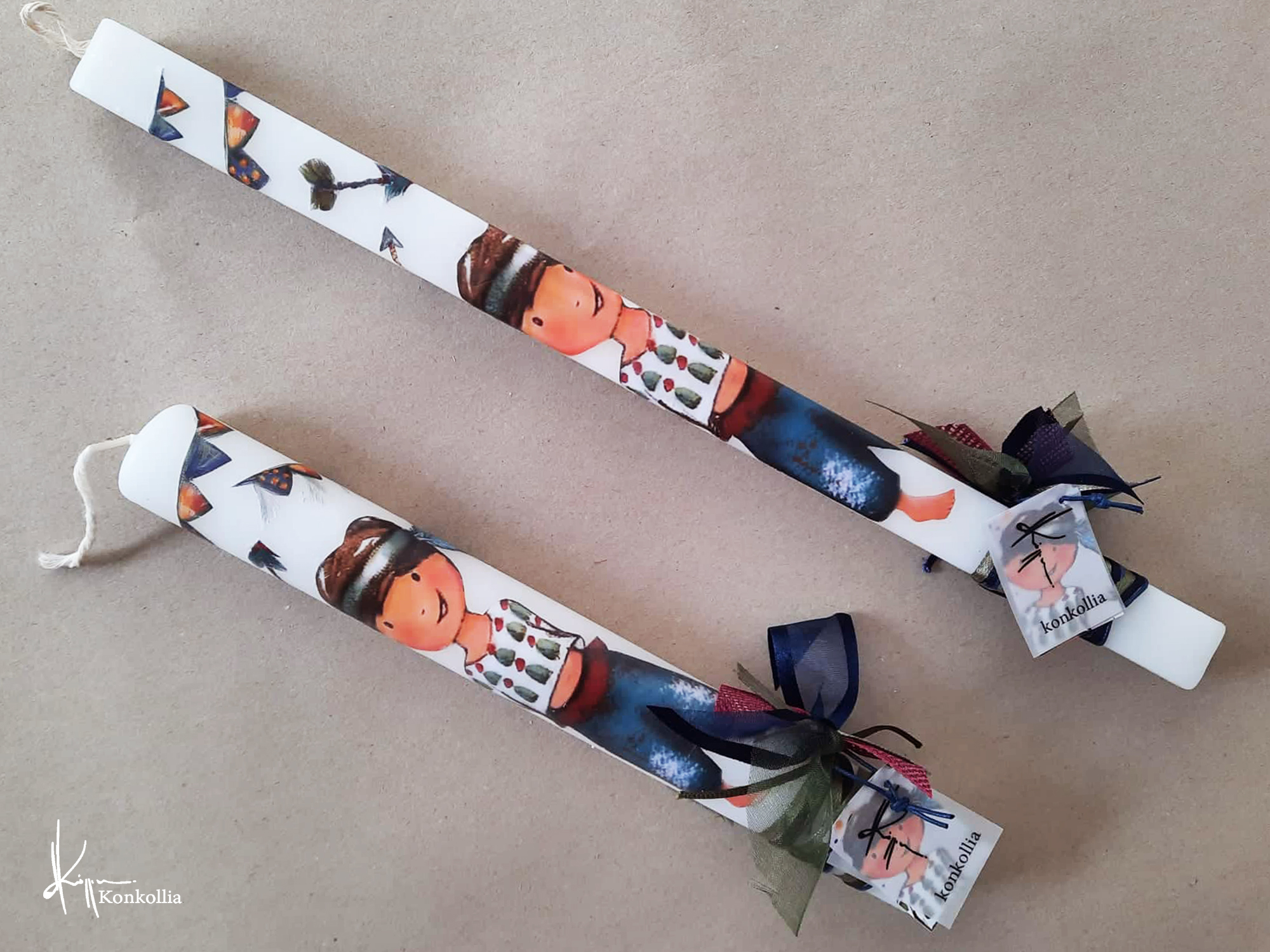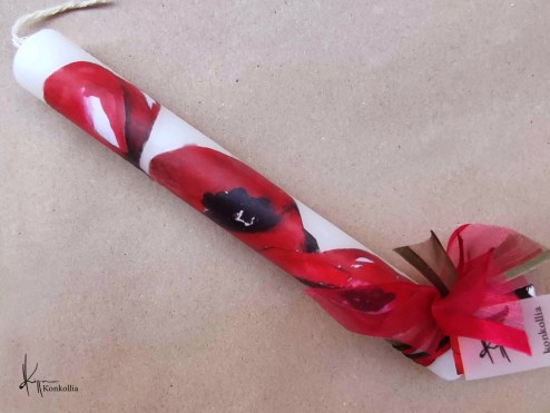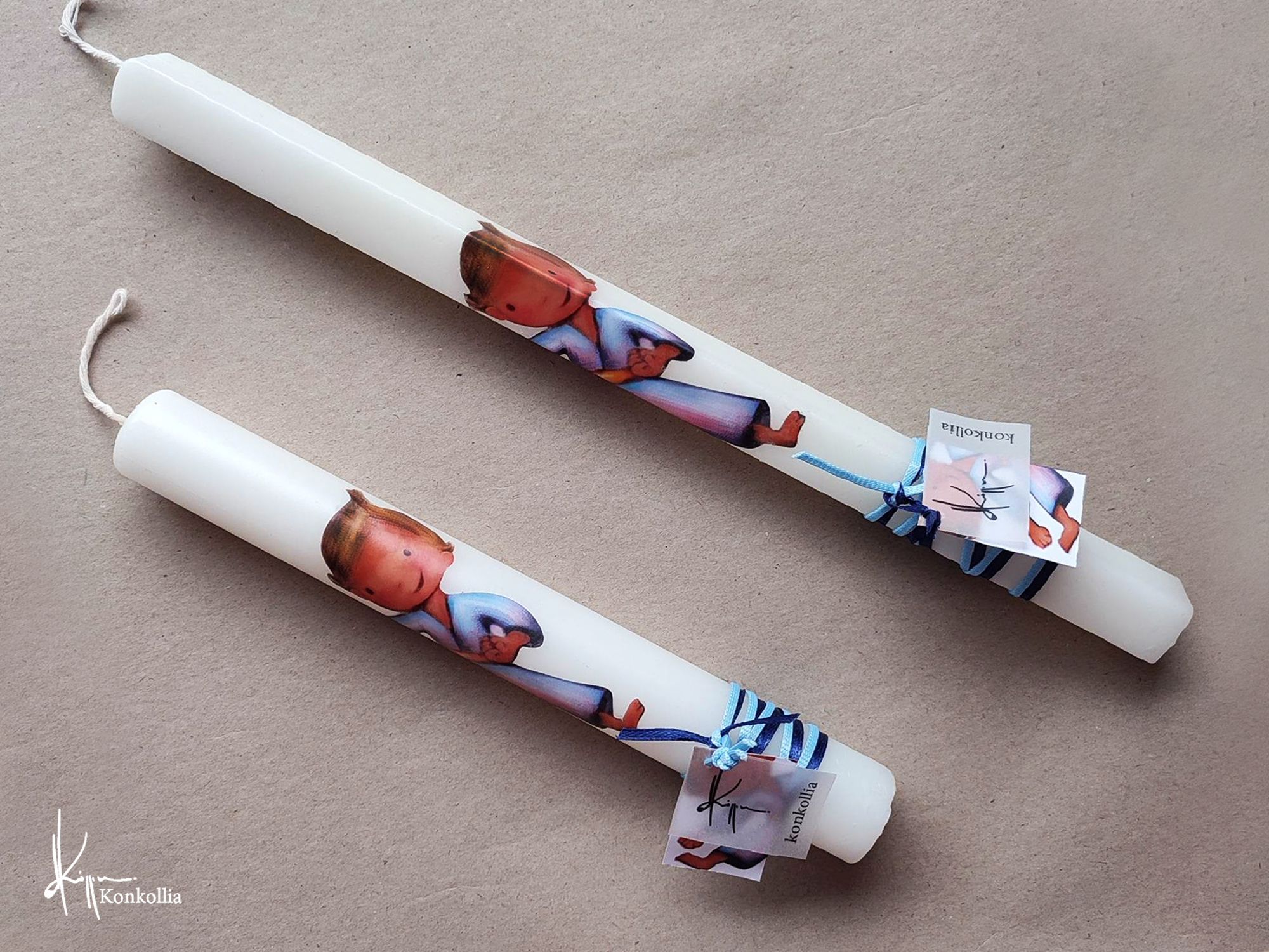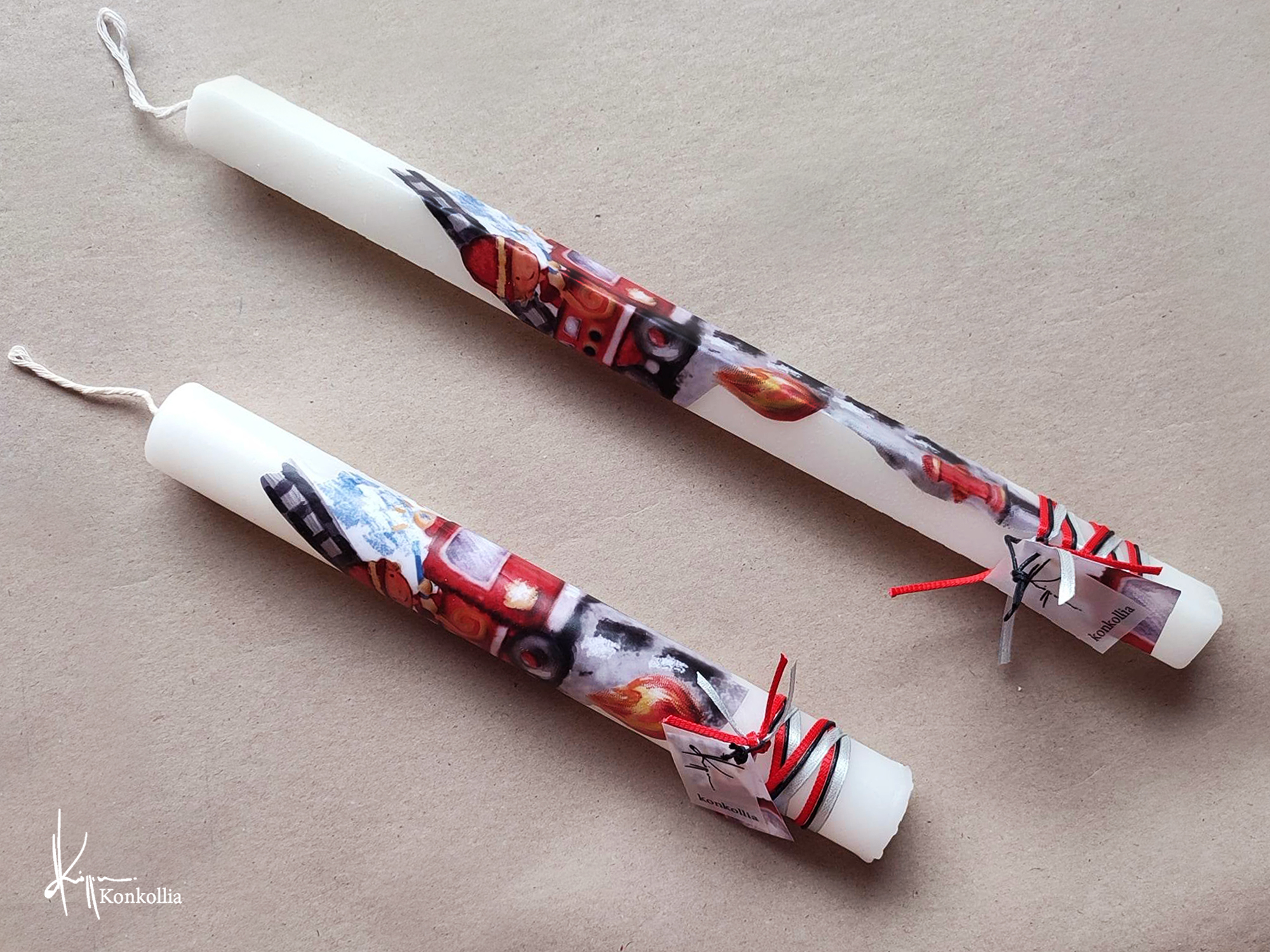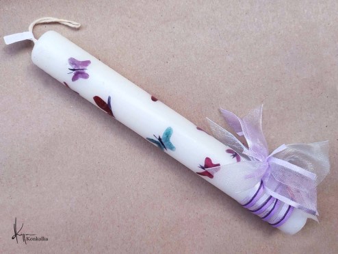 Χειροποίητες πασχαλινές λαμπάδες, κατασκευασμένες με πολύ καλή ποιότητα πρώτης ύλης (παραφίνη). Τα σχέδια τα οποία απεικονίζονται είναι δημιουργίες ζωγραφικής σε ακουαρέλα ή άλλης τεχνικής της Κωνσταντίνας Κόλλια τα οποία ενσωματώνονται μέσα στο κερί. Η συγκεκριμένη τεχνική που έχει επιλέξει η δημιουργός έχει σαν αποτέλεσμα την ευκρίνεια των λεπτομερειών και την καθαρότητα των χρωμάτων των σχεδίων.