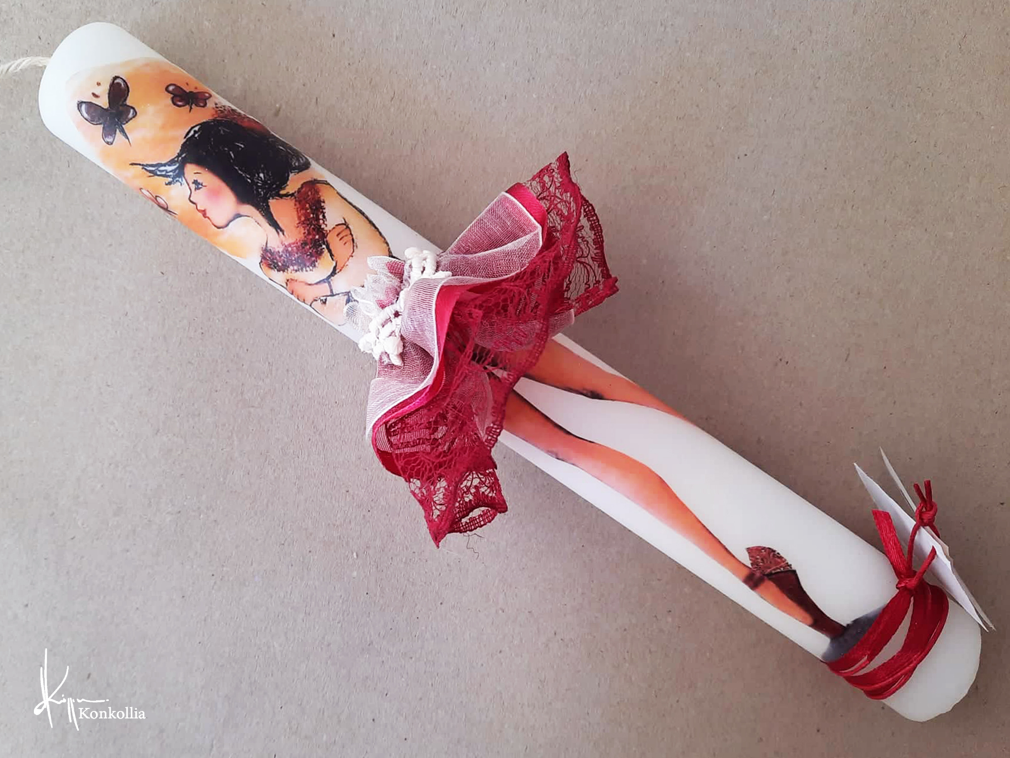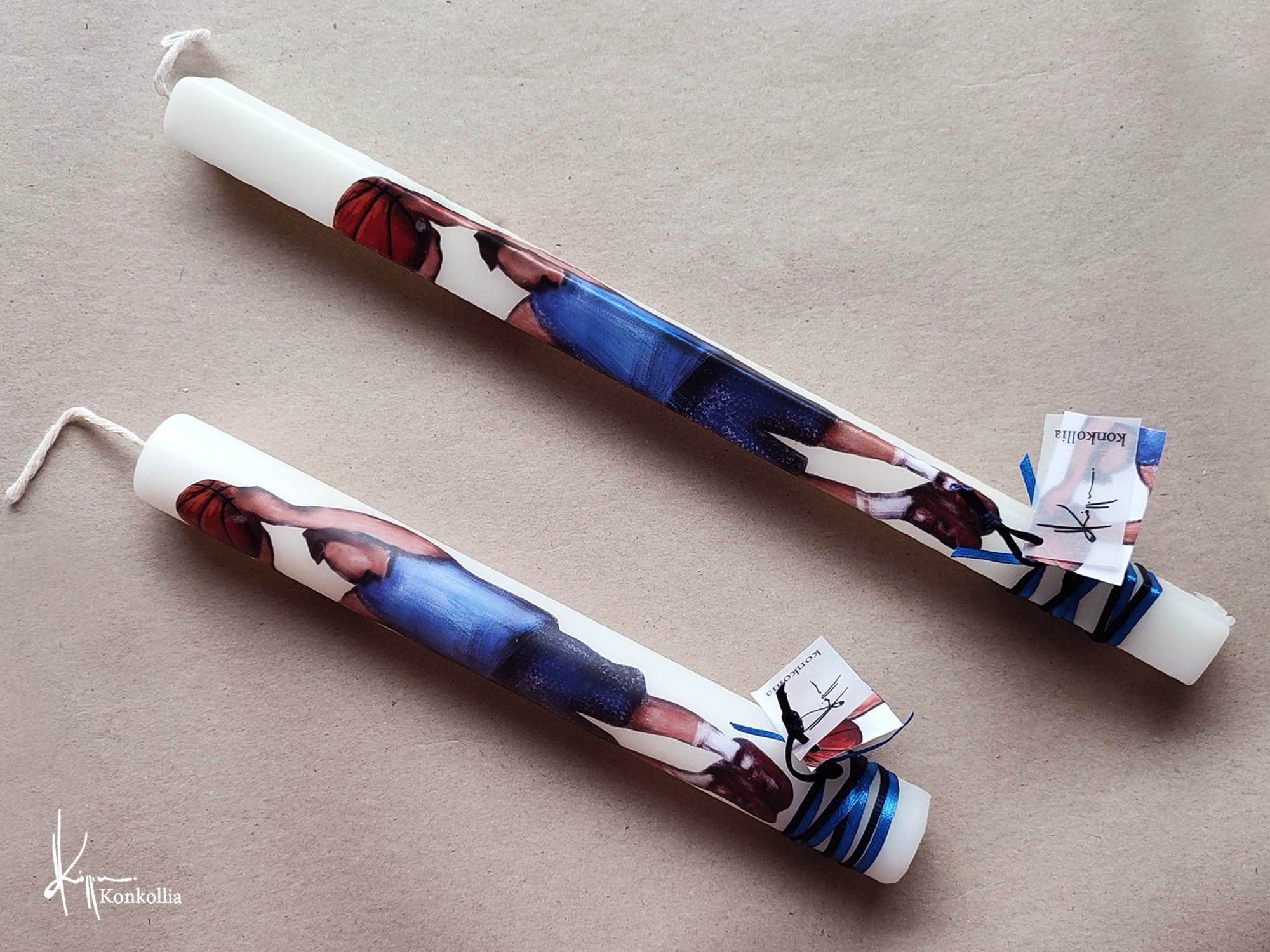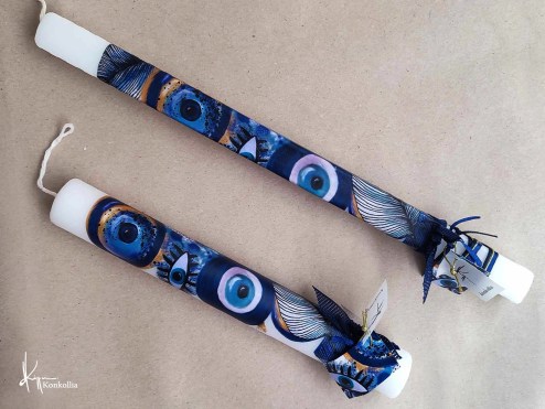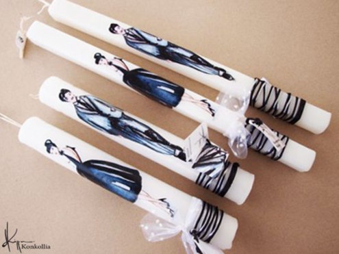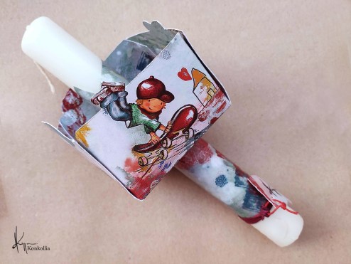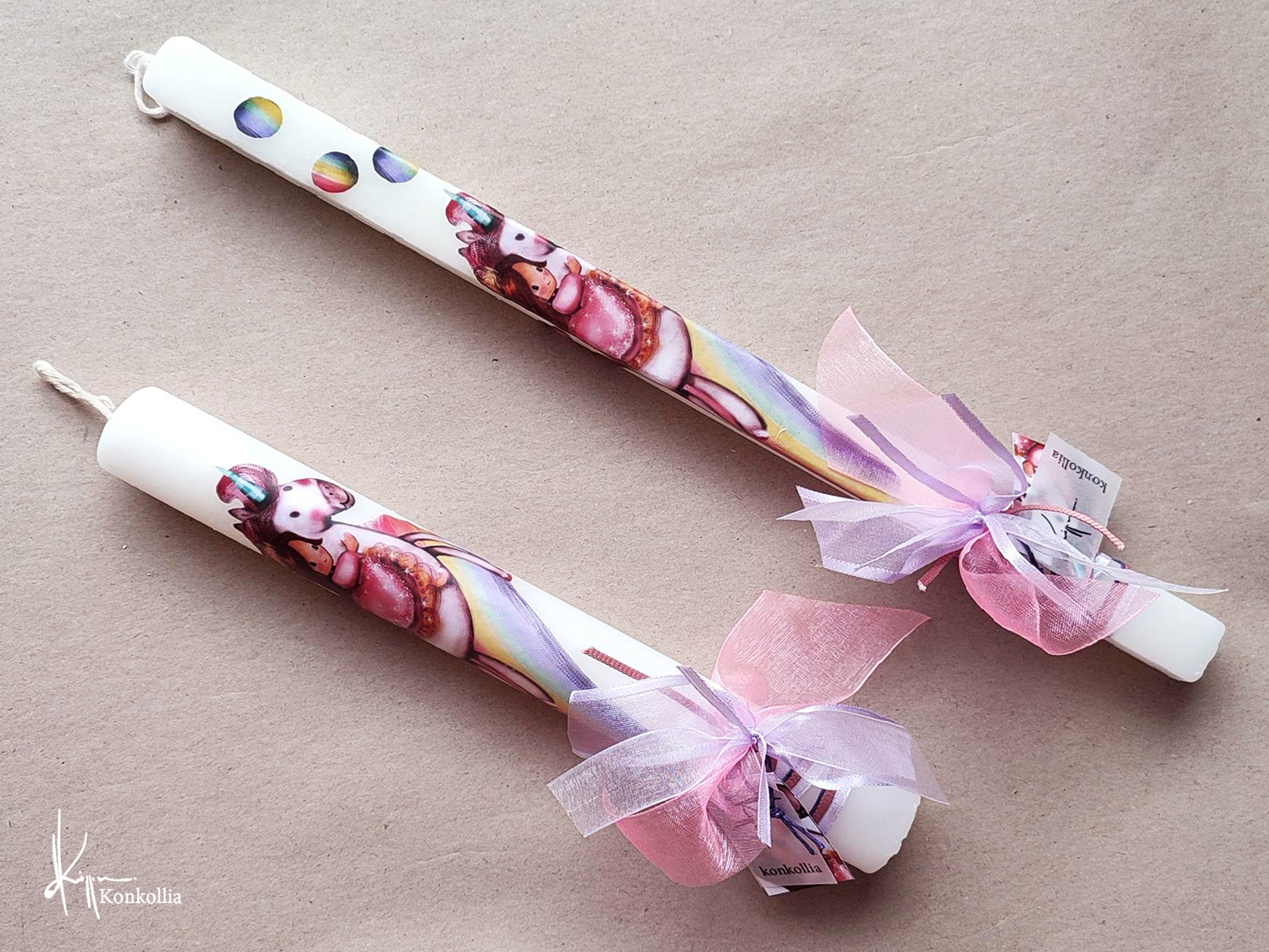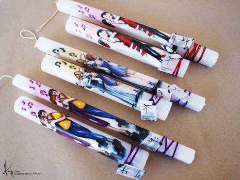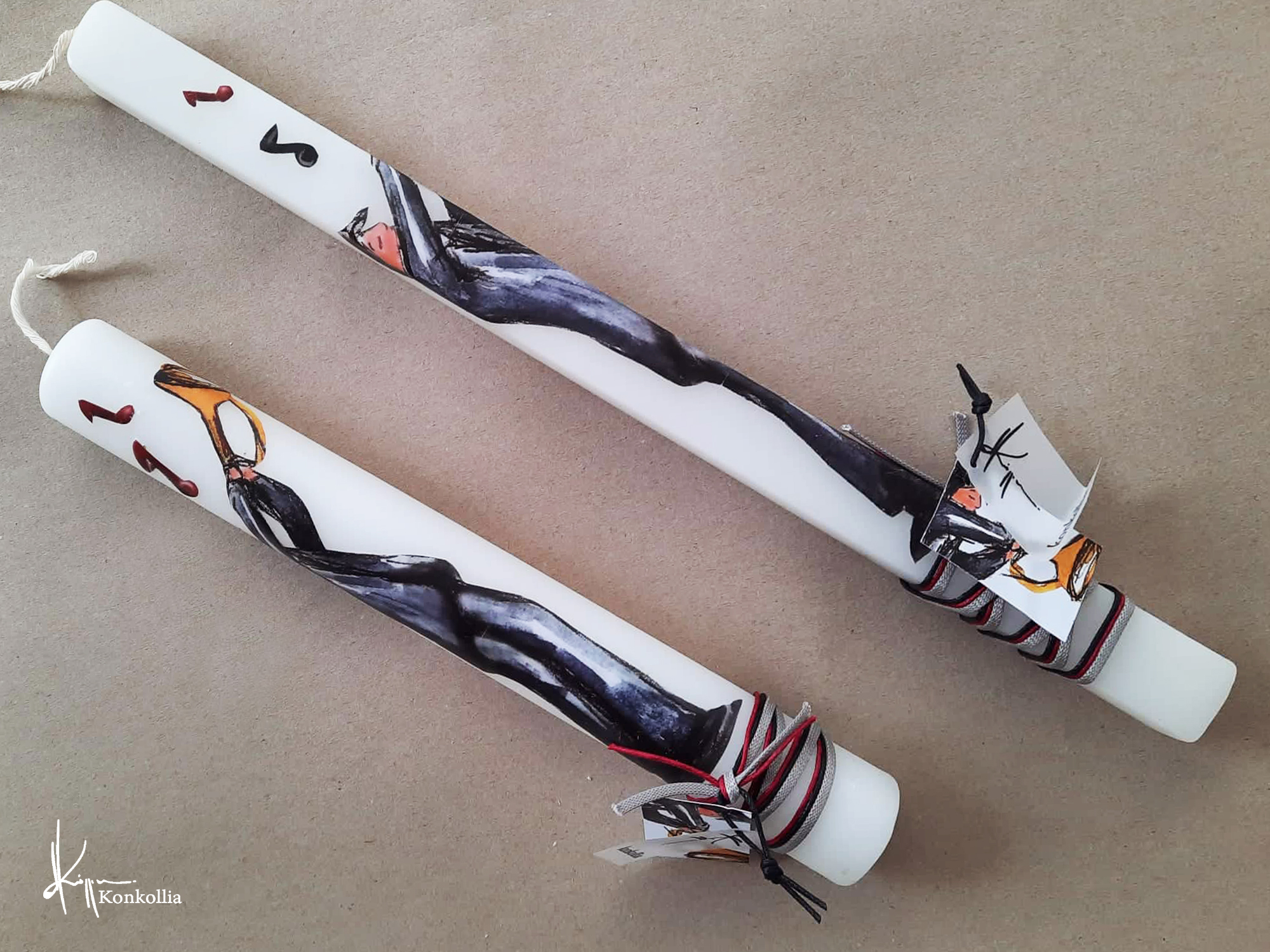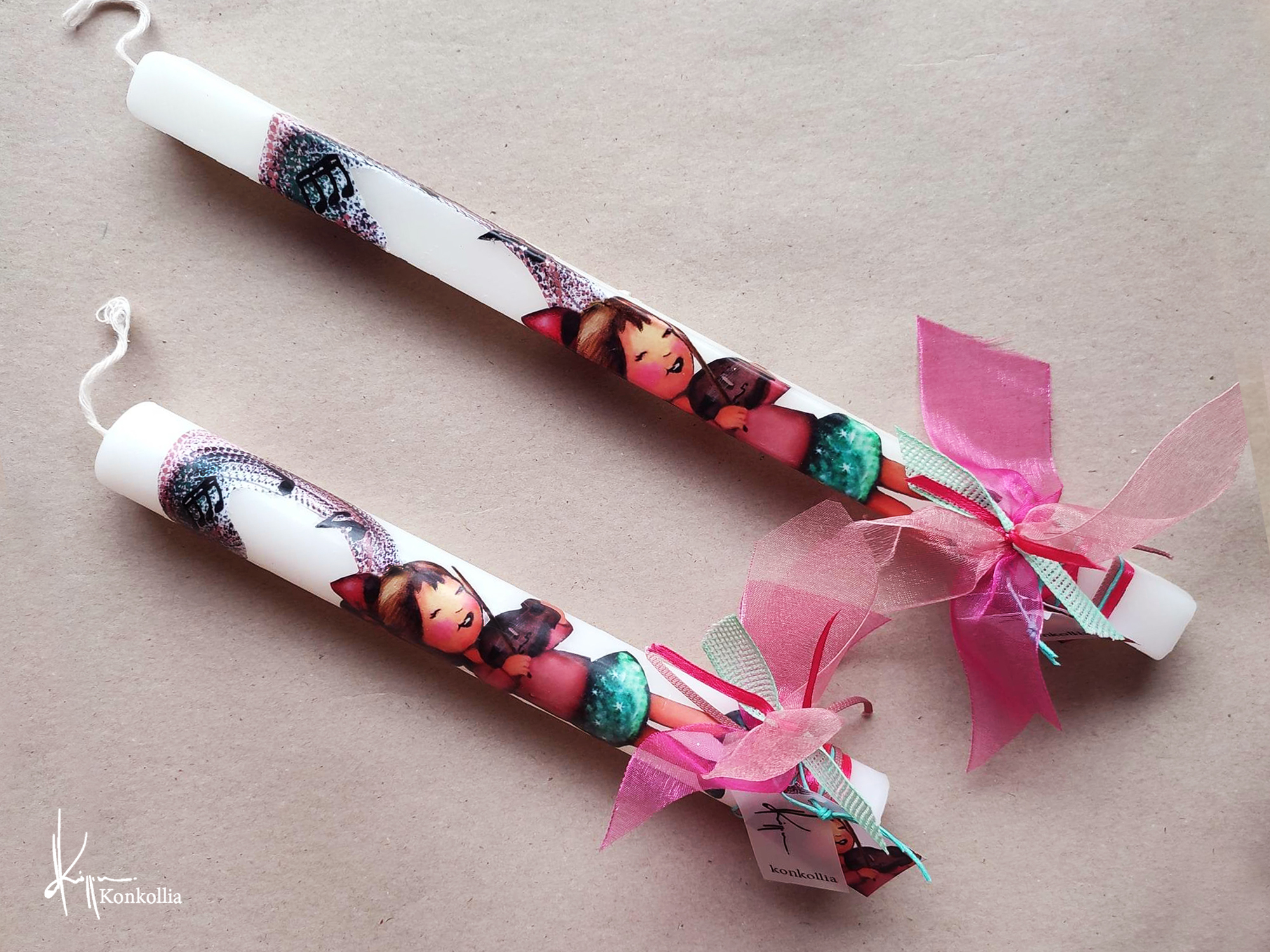 Χειροποίητες πασχαλινές λαμπάδες, κατασκευασμένες με πολύ καλή ποιότητα πρώτης ύλης (παραφίνη). Τα σχέδια τα οποία απεικονίζονται είναι δημιουργίες ζωγραφικής σε ακουαρέλα ή άλλης τεχνικής της Κωνσταντίνας Κόλλια τα οποία ενσωματώνονται μέσα στο κερί. Η συγκεκριμένη τεχνική που έχει επιλέξει η δημιουργός έχει σαν αποτέλεσμα την ευκρίνεια των λεπτομερειών και την καθαρότητα των χρωμάτων των σχεδίων.