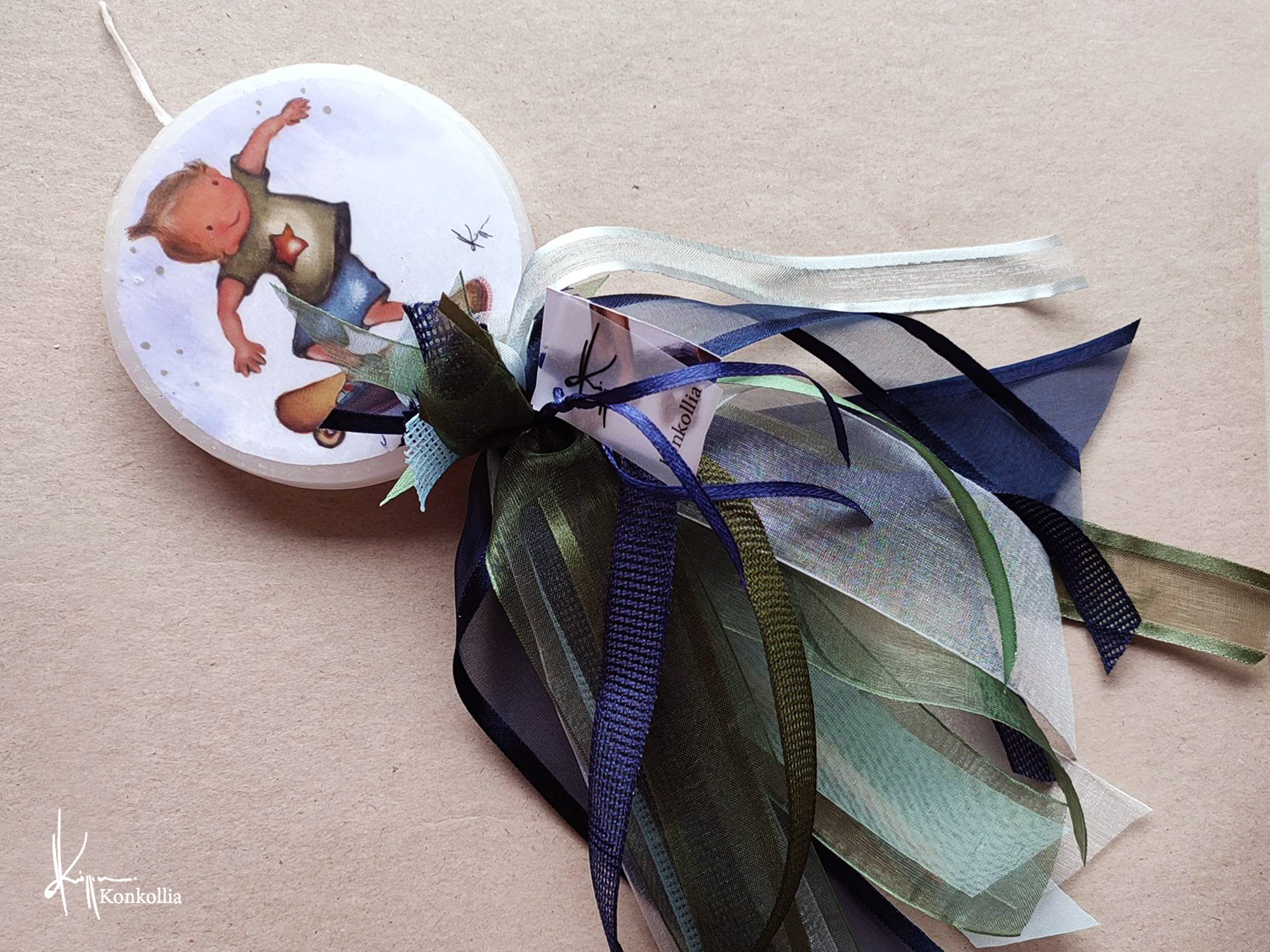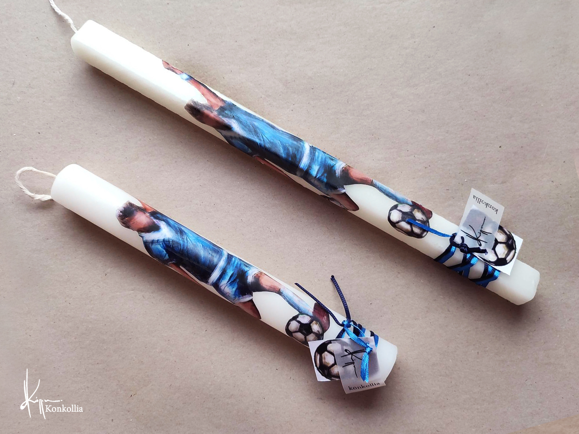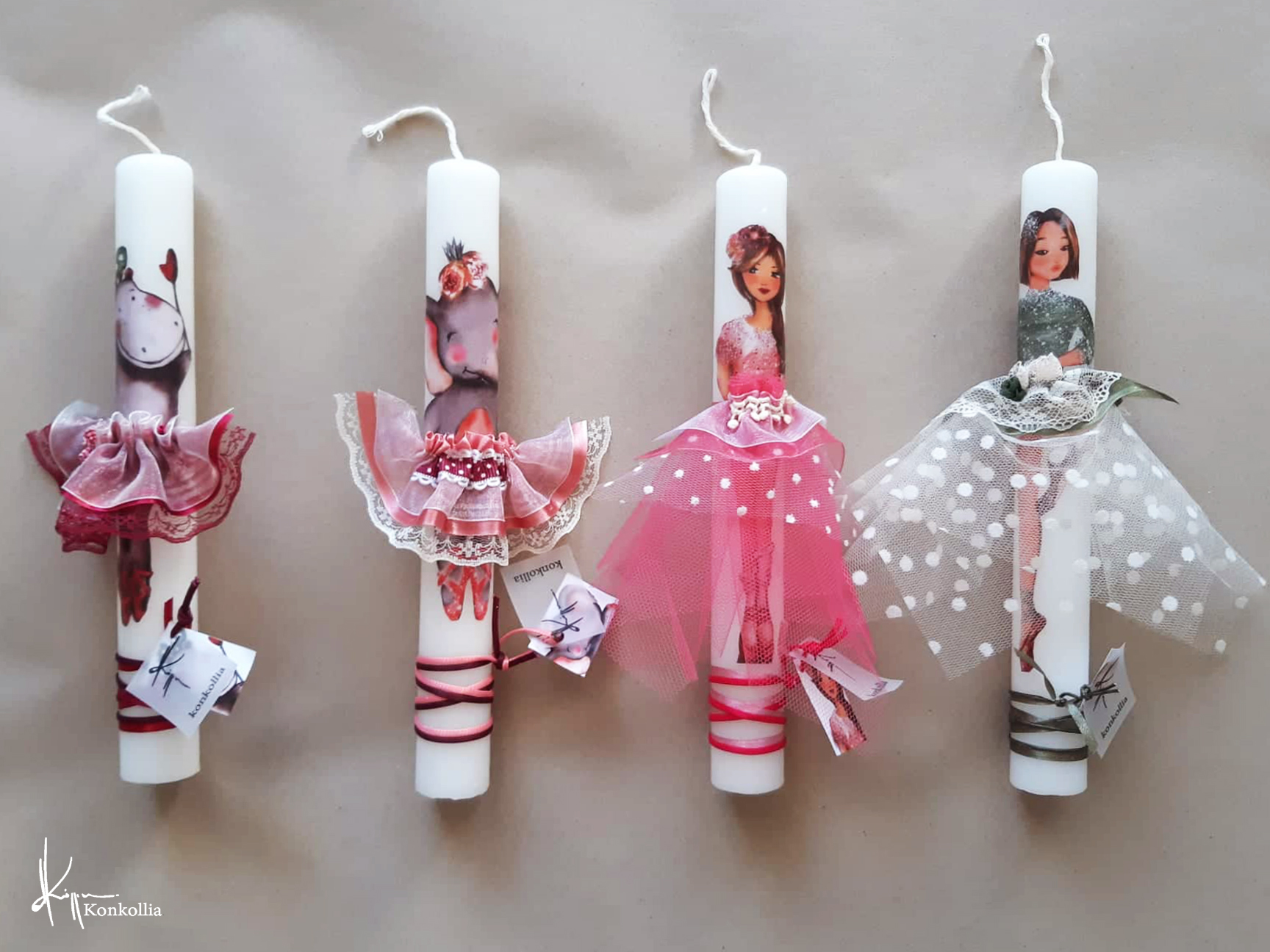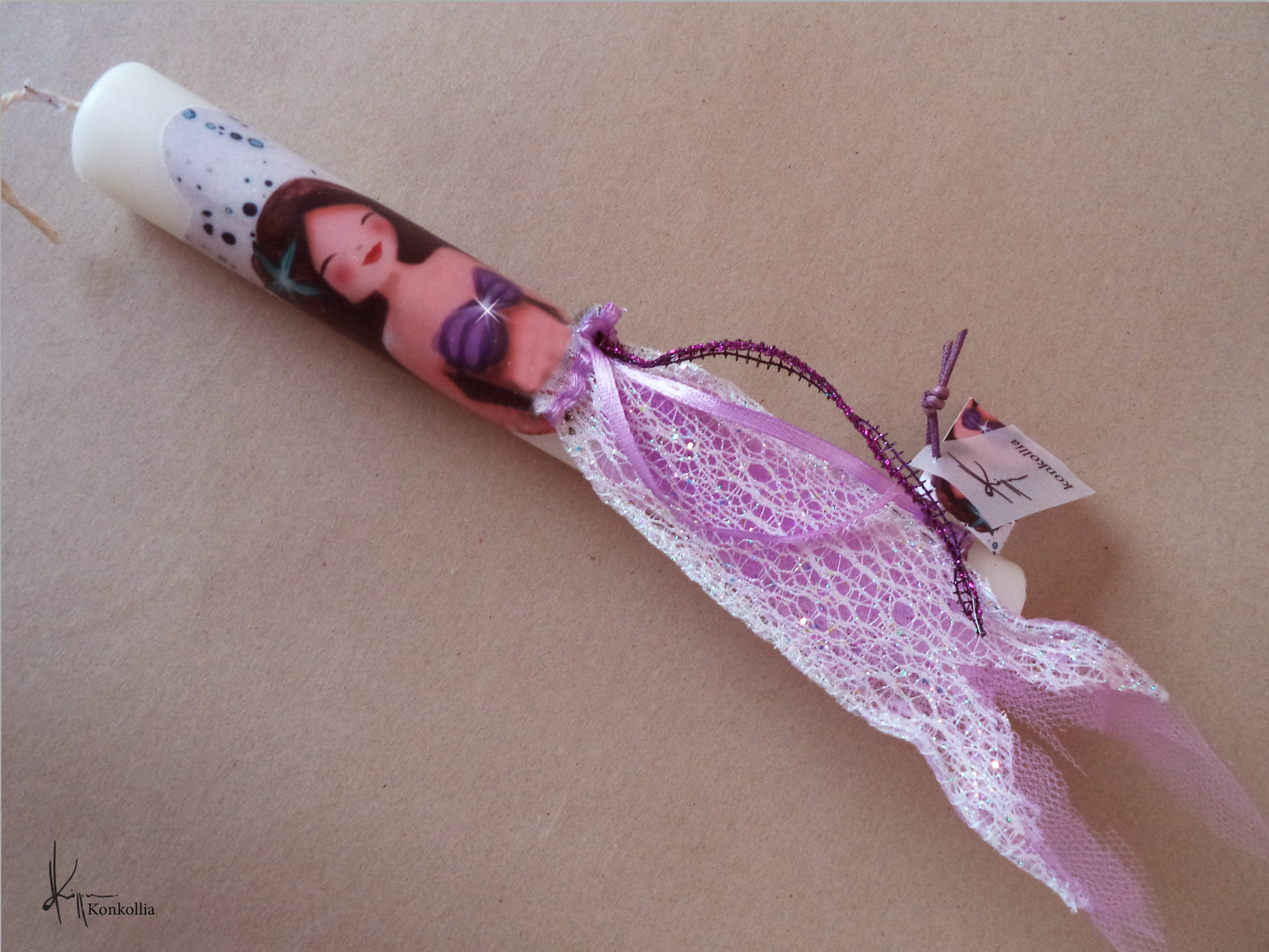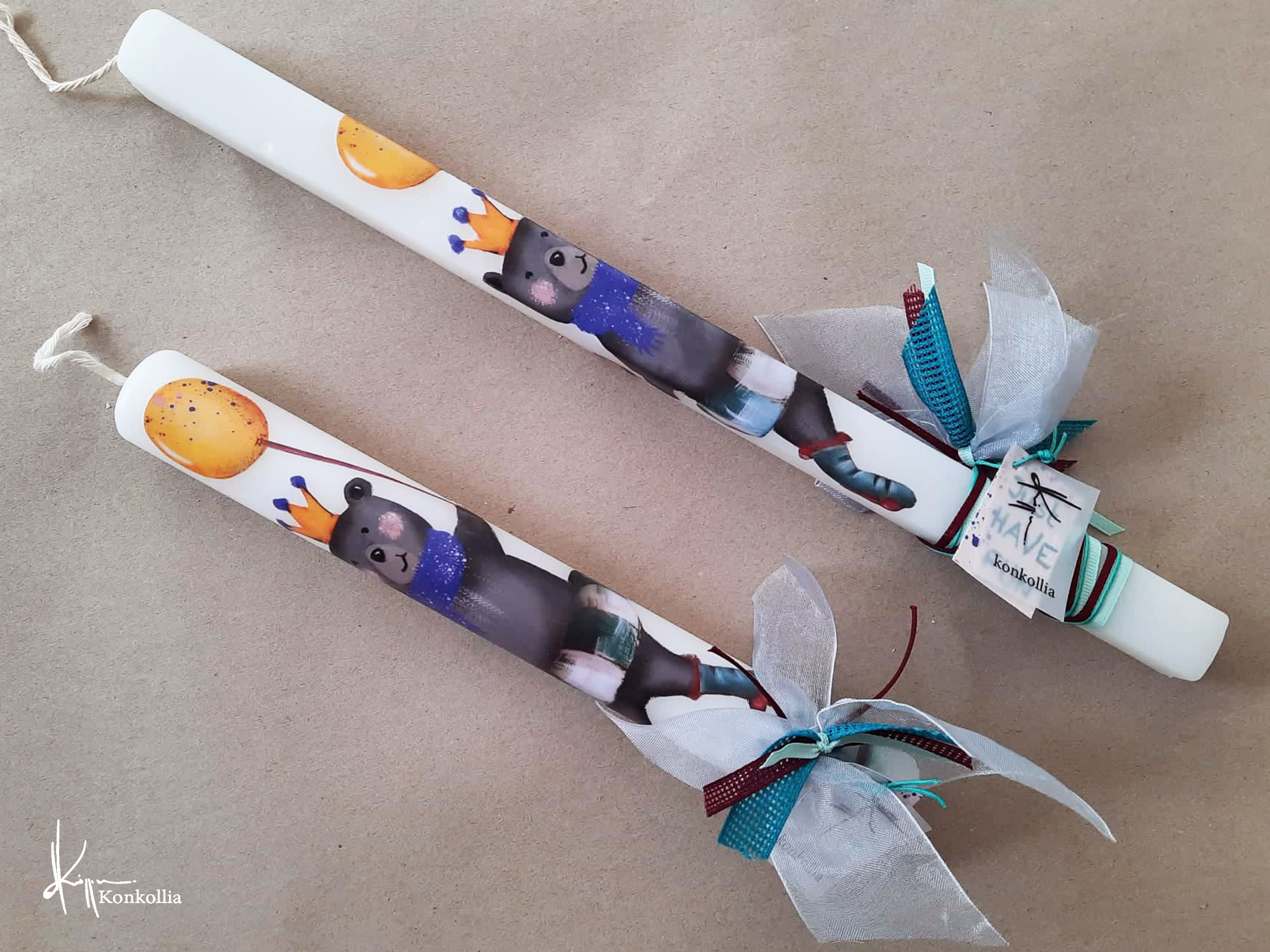 Χειροποίητες πασχαλινές λαμπάδες, κατασκευασμένες με πολύ καλή ποιότητα πρώτης ύλης (παραφίνη). Τα σχέδια τα οποία απεικονίζονται είναι δημιουργίες ζωγραφικής σε ακουαρέλα ή άλλης τεχνικής της Κωνσταντίνας Κόλλια τα οποία ενσωματώνονται μέσα στο κερί. Η συγκεκριμένη τεχνική που έχει επιλέξει η δημιουργός έχει σαν αποτέλεσμα την ευκρίνεια των λεπτομερειών και την καθαρότητα των χρωμάτων των σχεδίων.