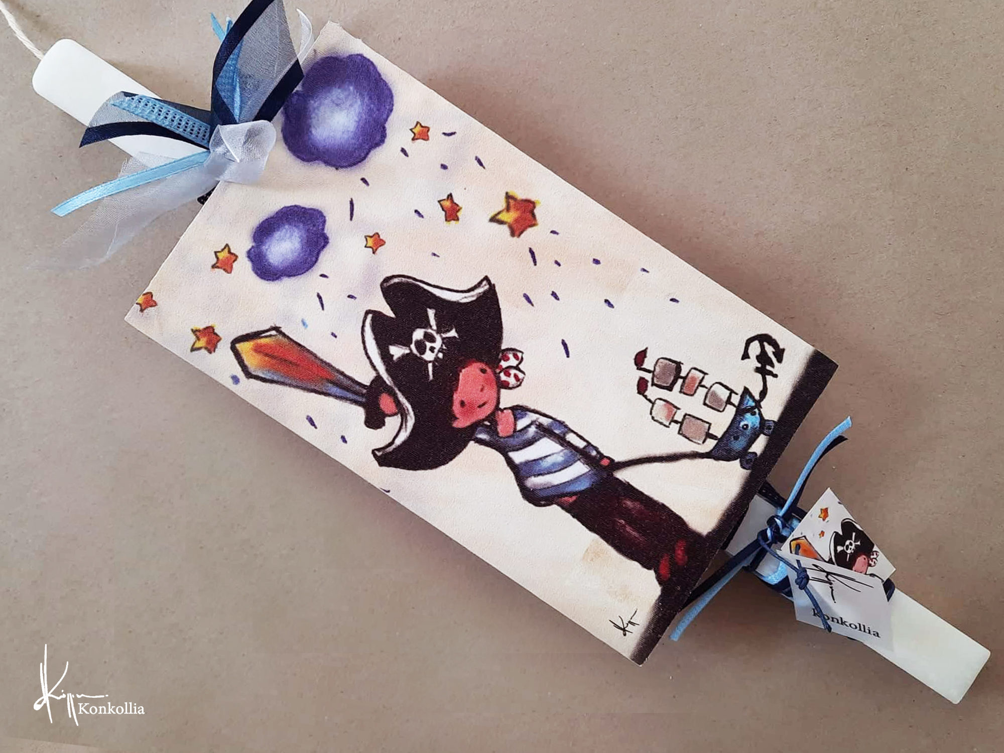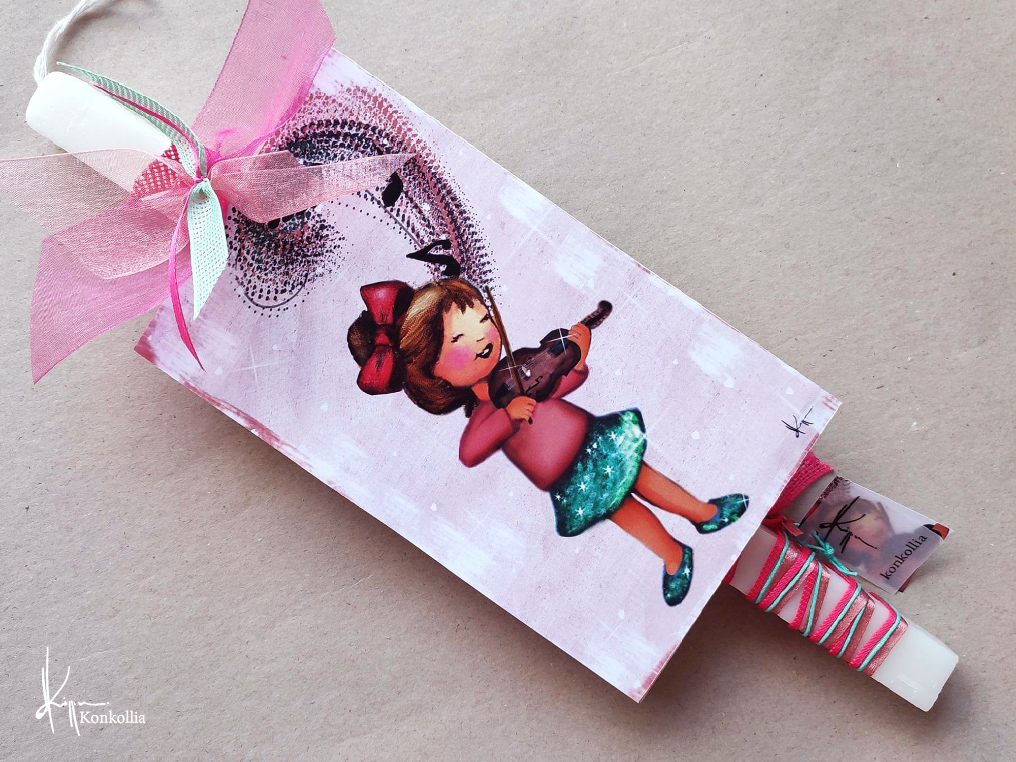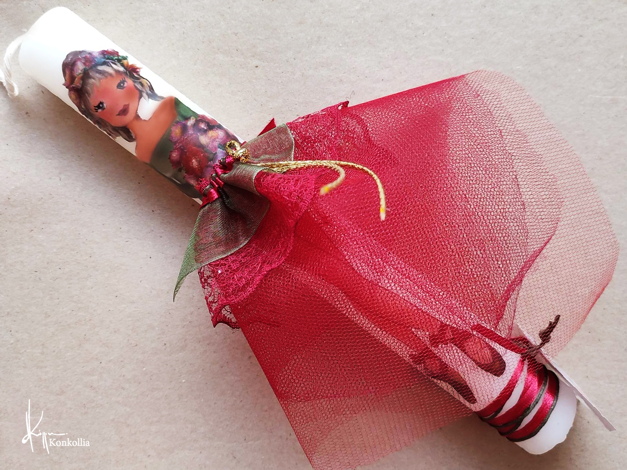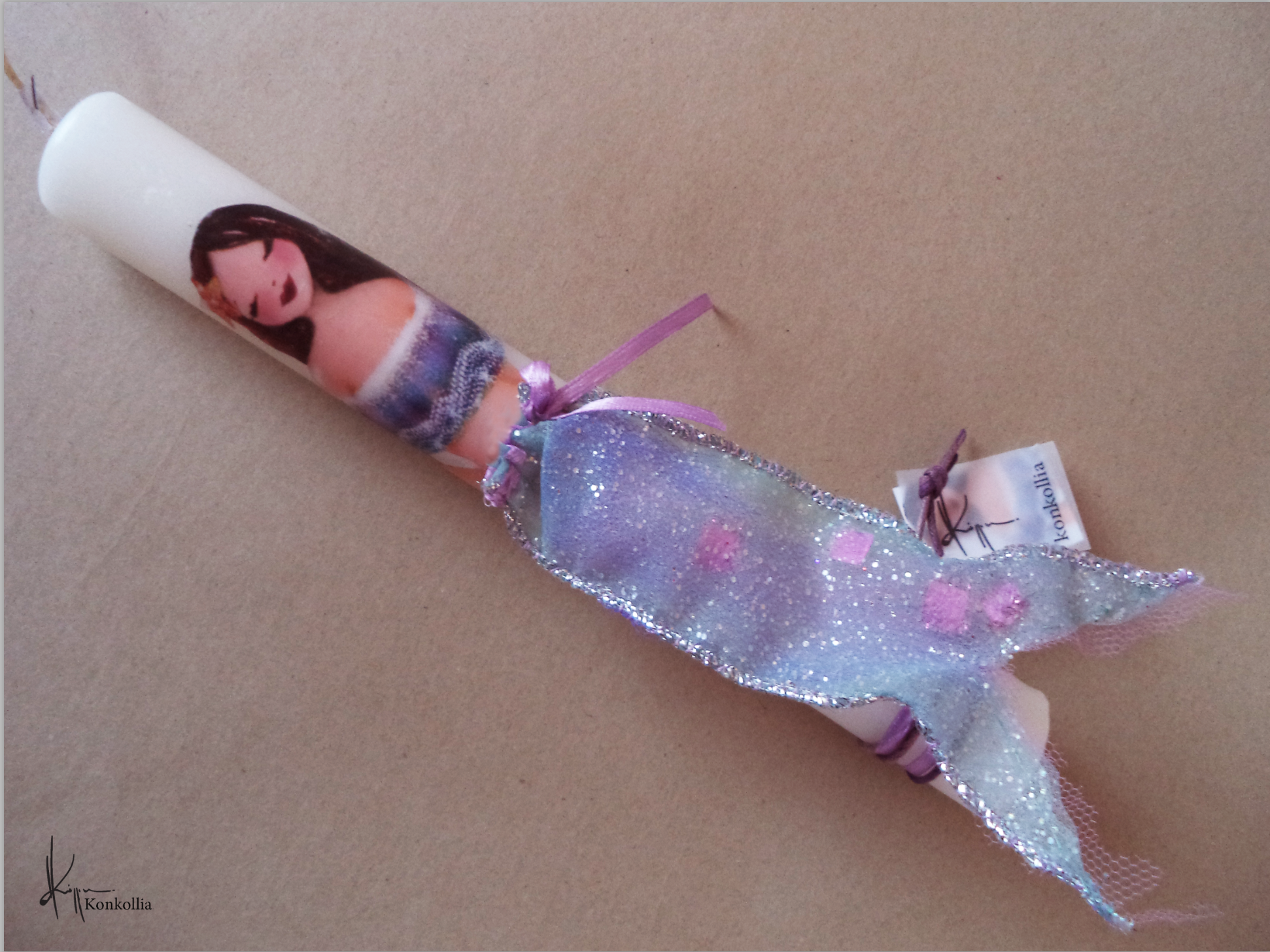 Χειροποίητες πασχαλινές λαμπάδες, κατασκευασμένες με πολύ καλή ποιότητα πρώτης ύλης (παραφίνη). Τα σχέδια τα οποία απεικονίζονται είναι δημιουργίες ζωγραφικής σε ακουαρέλα ή άλλης τεχνικής της Κωνσταντίνας Κόλλια τα οποία ενσωματώνονται μέσα στο κερί. Η συγκεκριμένη τεχνική που έχει επιλέξει η δημιουργός έχει σαν αποτέλεσμα την ευκρίνεια των λεπτομερειών και την καθαρότητα των χρωμάτων των σχεδίων.