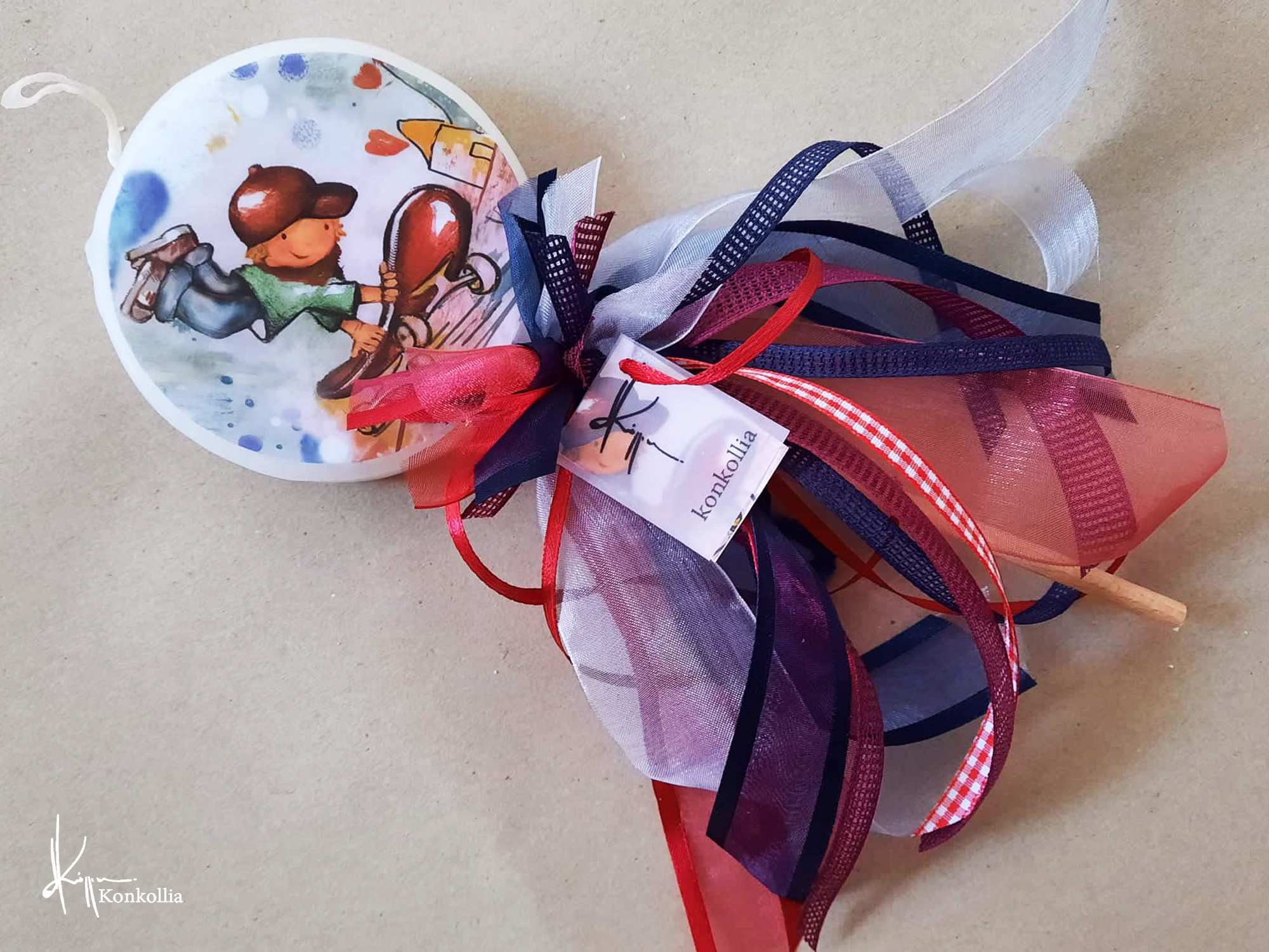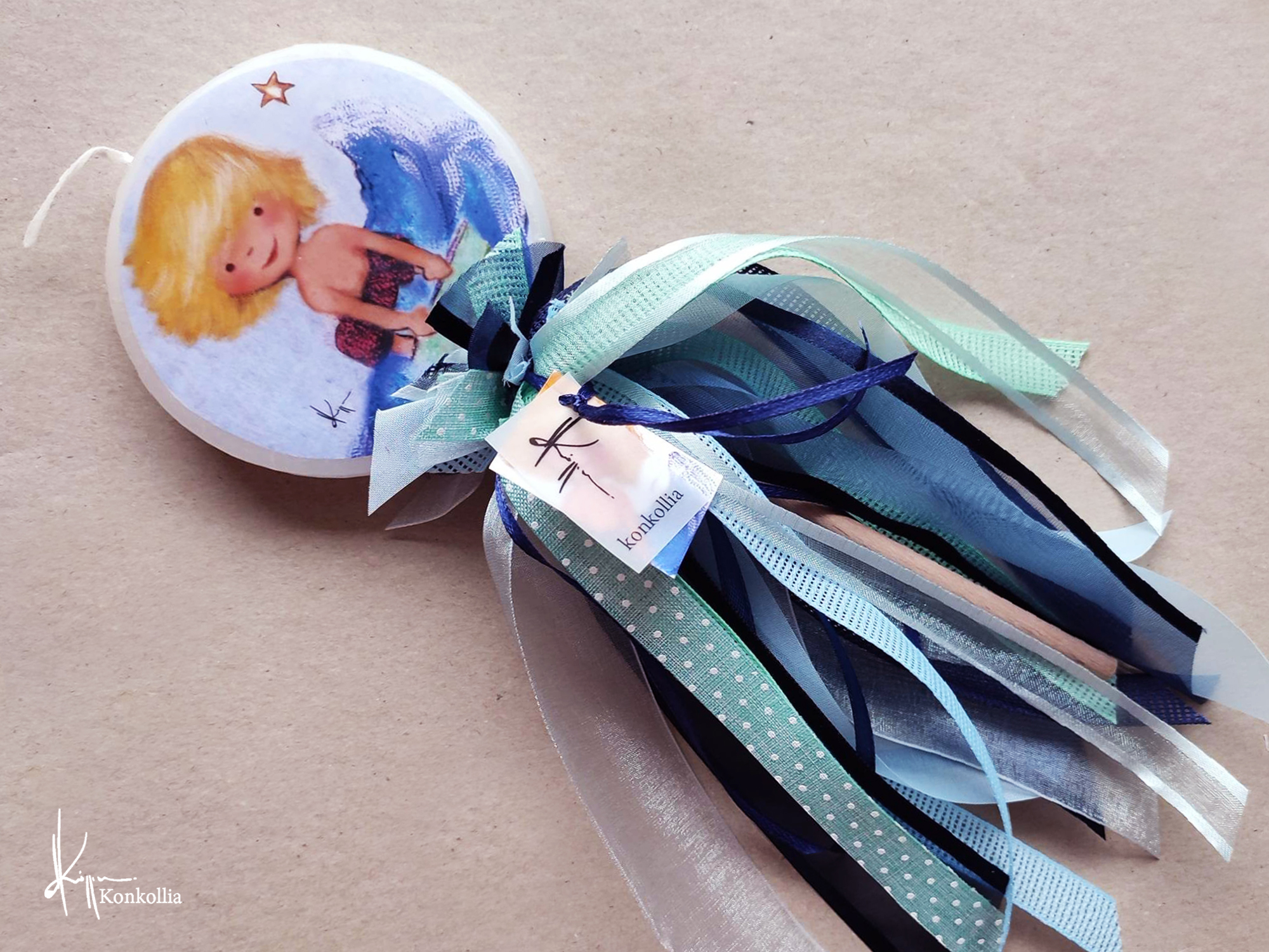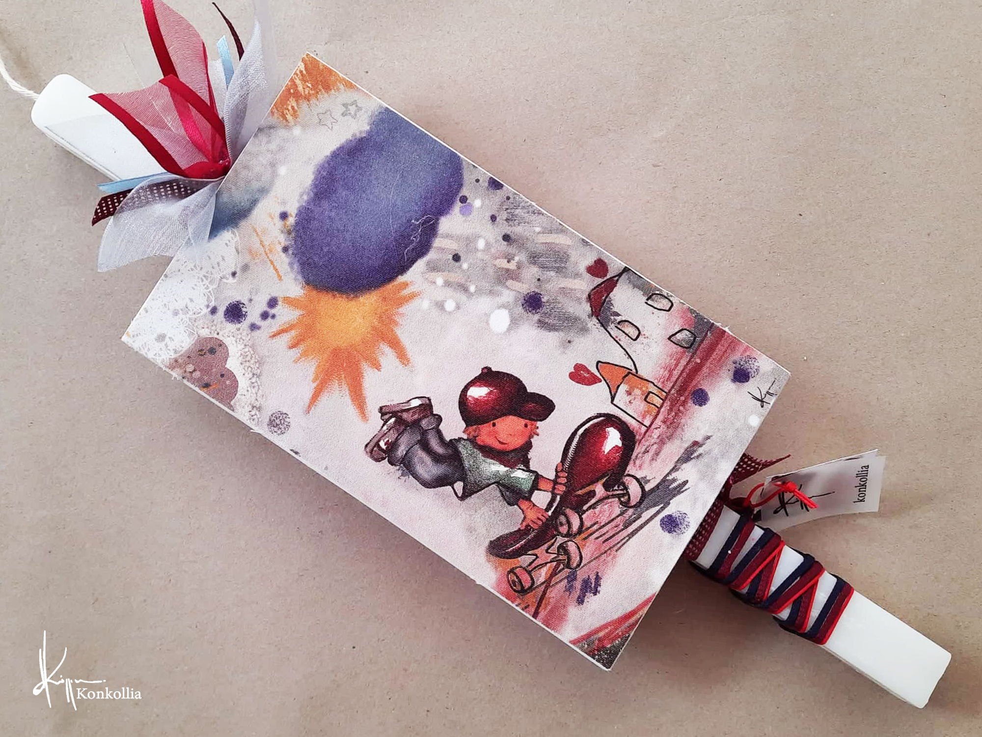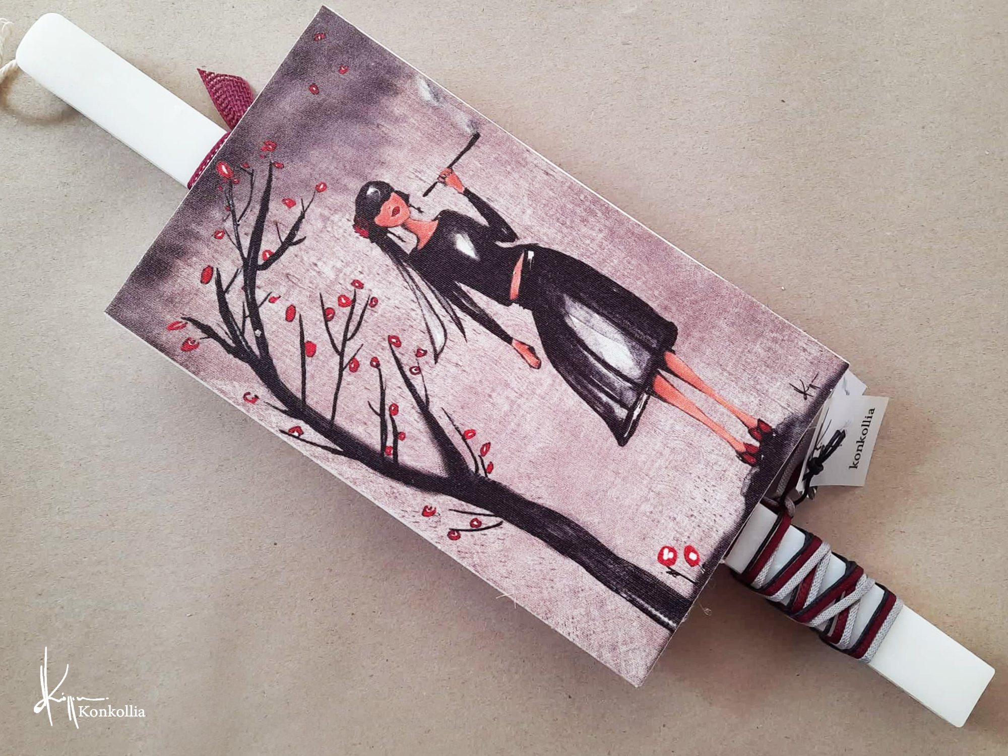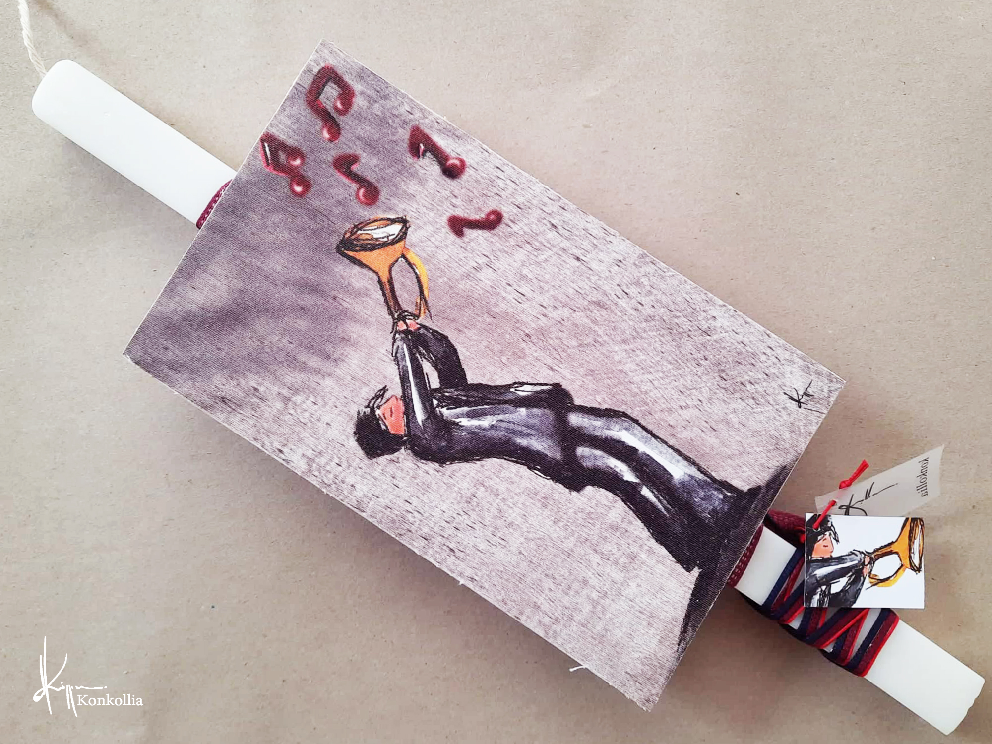 Χειροποίητες πασχαλινές λαμπάδες, κατασκευασμένες με πολύ καλή ποιότητα πρώτης ύλης (παραφίνη). Τα σχέδια τα οποία απεικονίζονται είναι δημιουργίες ζωγραφικής σε ακουαρέλα ή άλλης τεχνικής της Κωνσταντίνας Κόλλια τα οποία ενσωματώνονται μέσα στο κερί. Η συγκεκριμένη τεχνική που έχει επιλέξει η δημιουργός έχει σαν αποτέλεσμα την ευκρίνεια των λεπτομερειών και την καθαρότητα των χρωμάτων των σχεδίων.