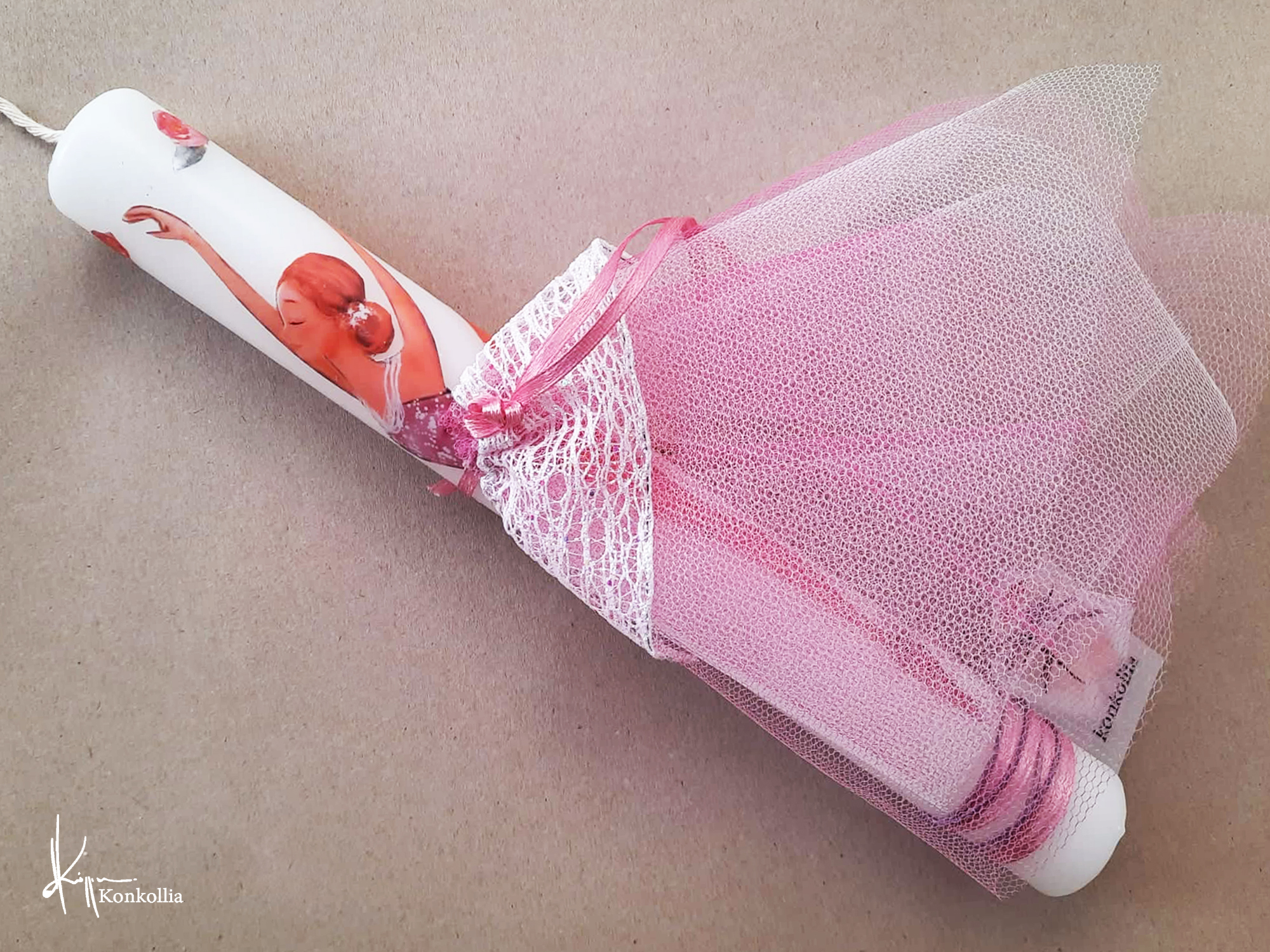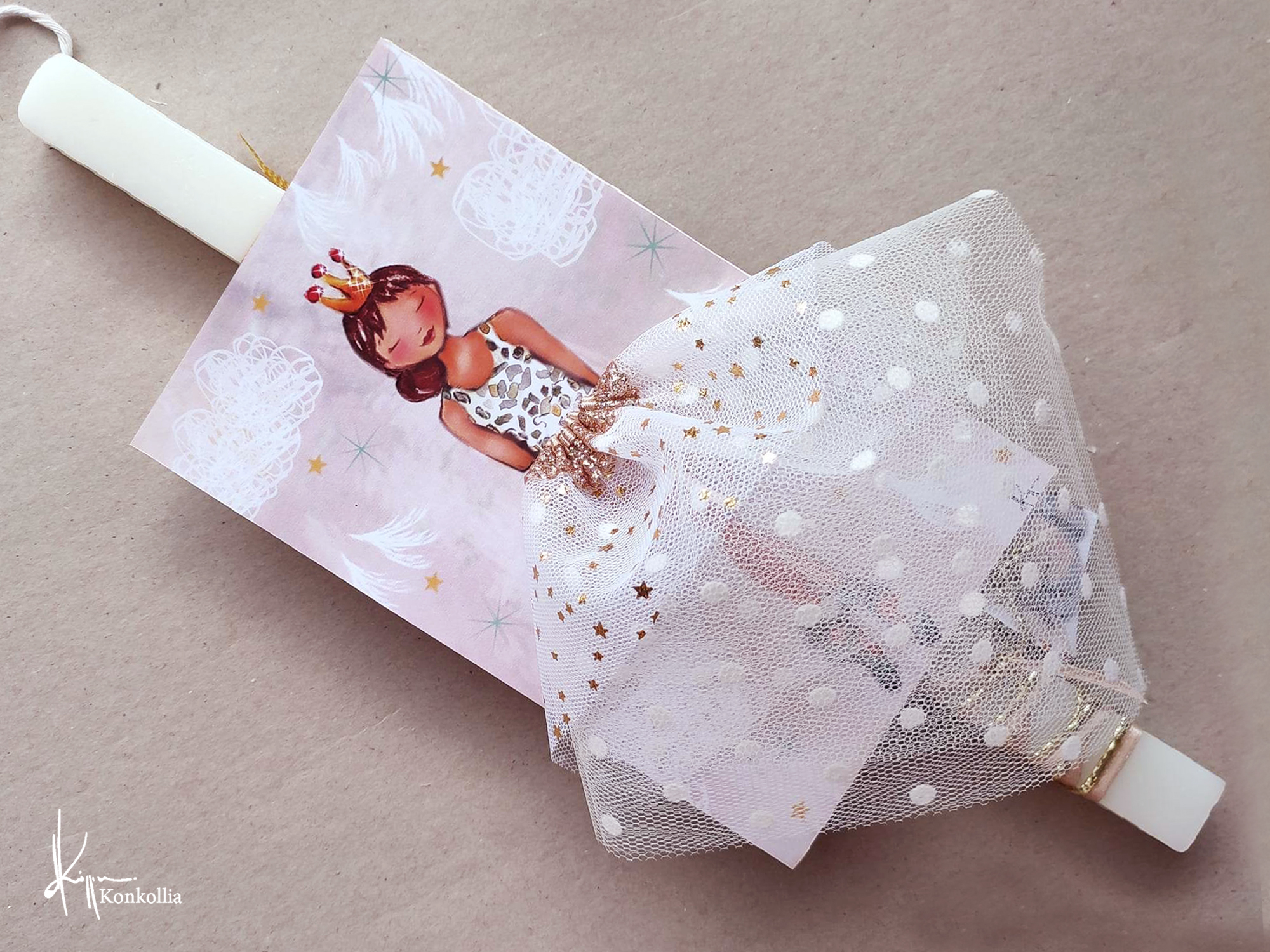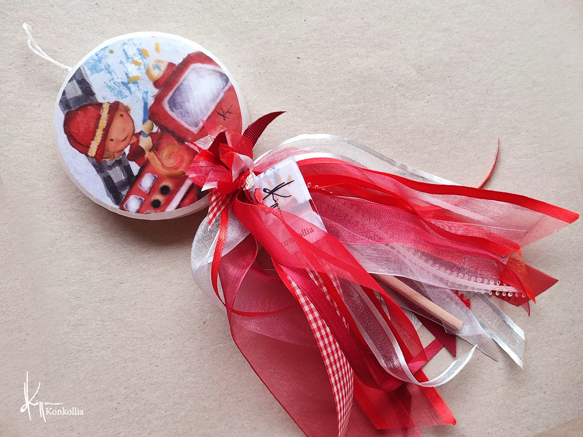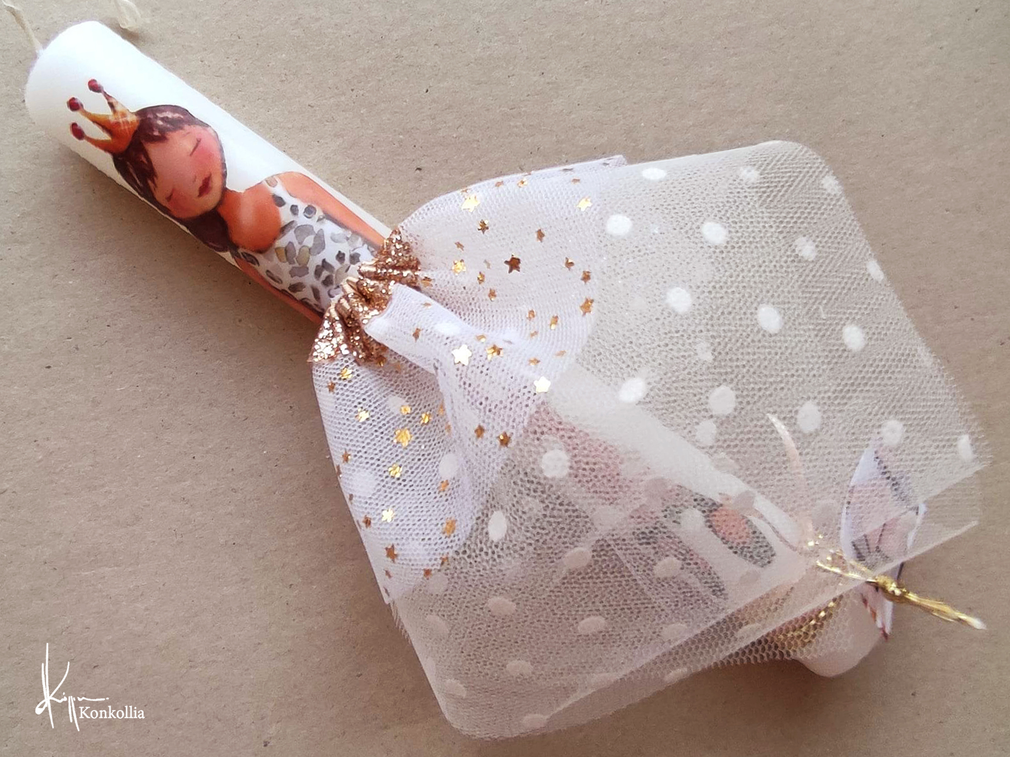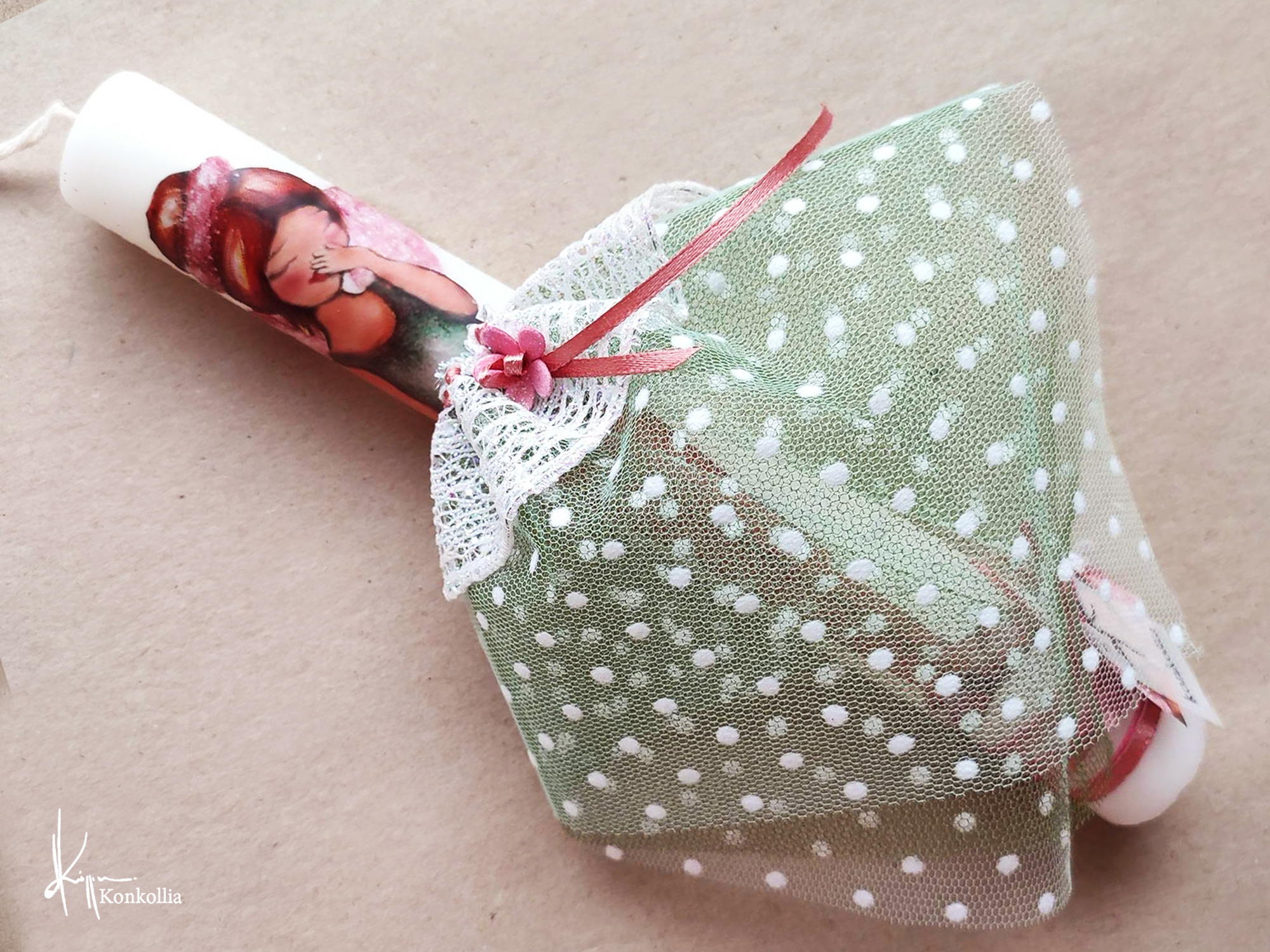Χειροποίητες πασχαλινές λαμπάδες, κατασκευασμένες με πολύ καλή ποιότητα πρώτης ύλης (παραφίνη). Τα σχέδια τα οποία απεικονίζονται είναι δημιουργίες ζωγραφικής σε ακουαρέλα ή άλλης τεχνικής της Κωνσταντίνας Κόλλια τα οποία ενσωματώνονται μέσα στο κερί. Η συγκεκριμένη τεχνική που έχει επιλέξει η δημιουργός έχει σαν αποτέλεσμα την ευκρίνεια των λεπτομερειών και την καθαρότητα των χρωμάτων των σχεδίων.
