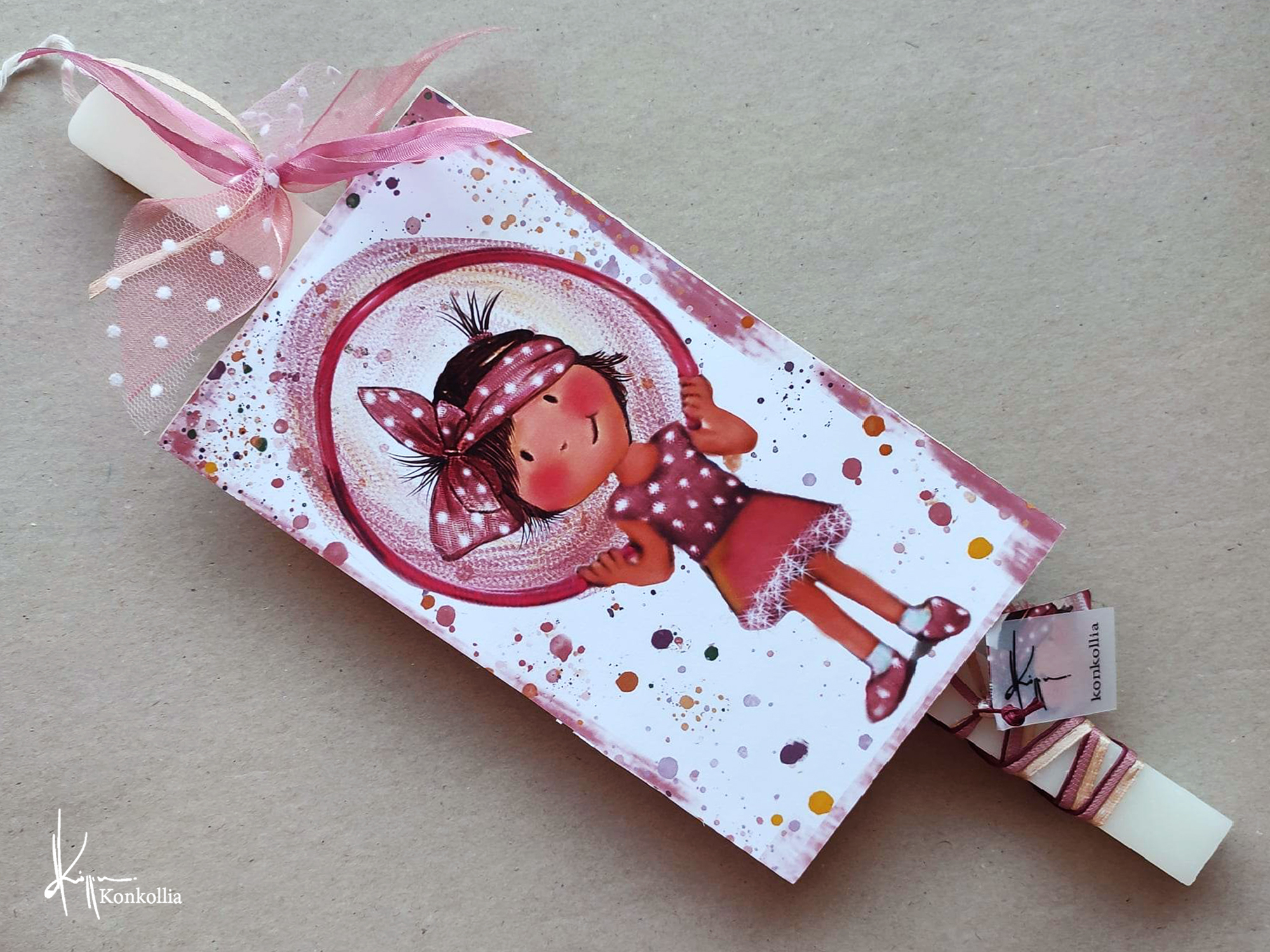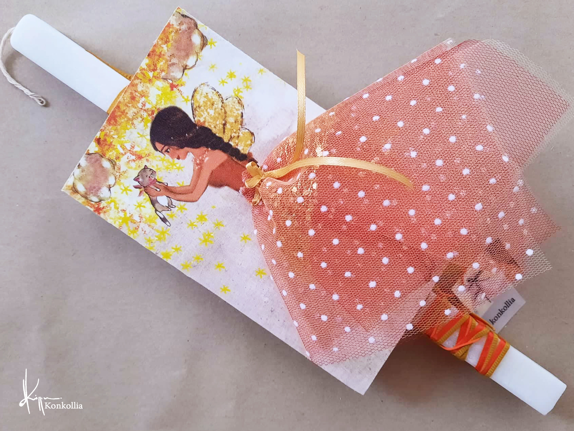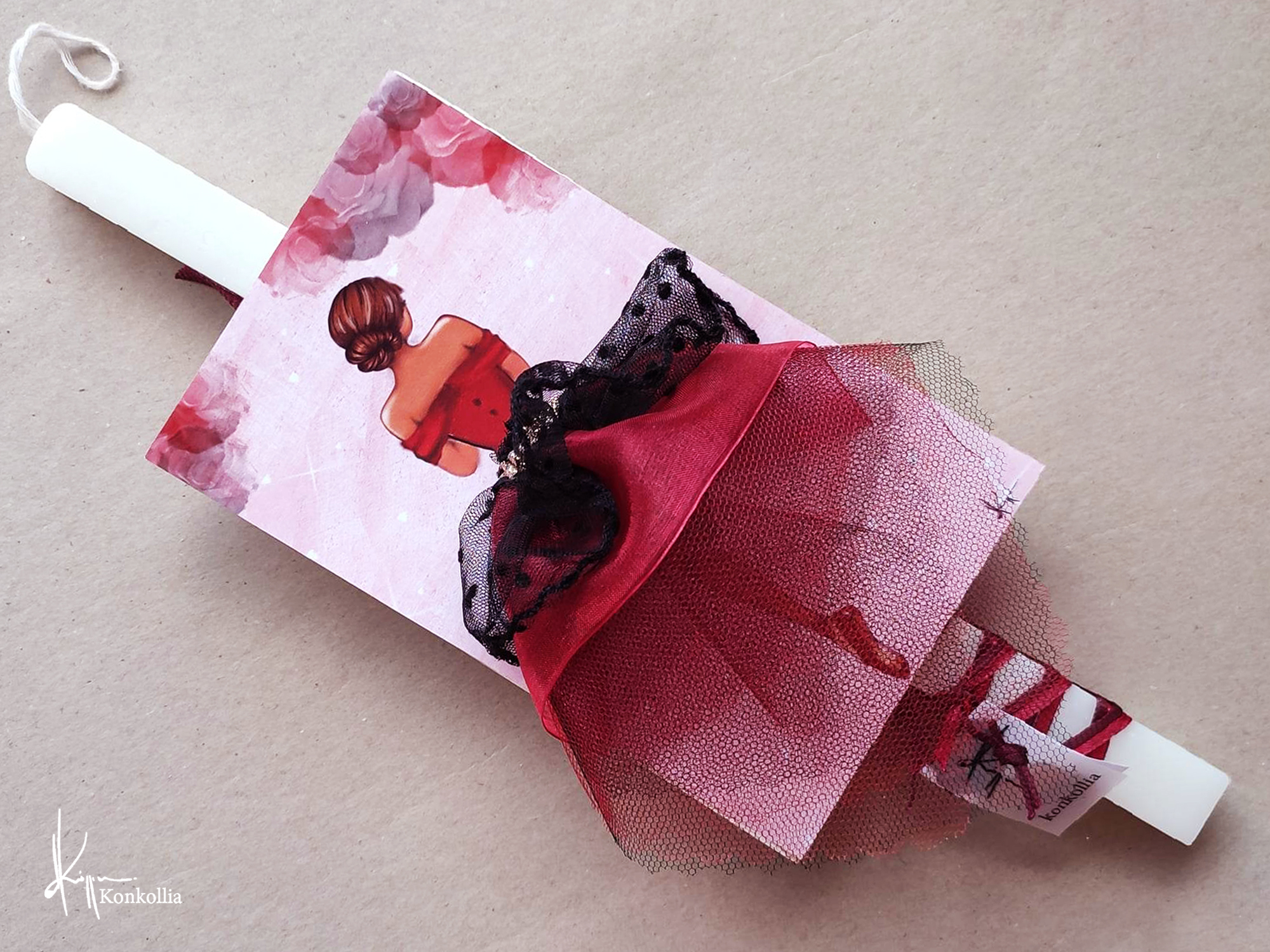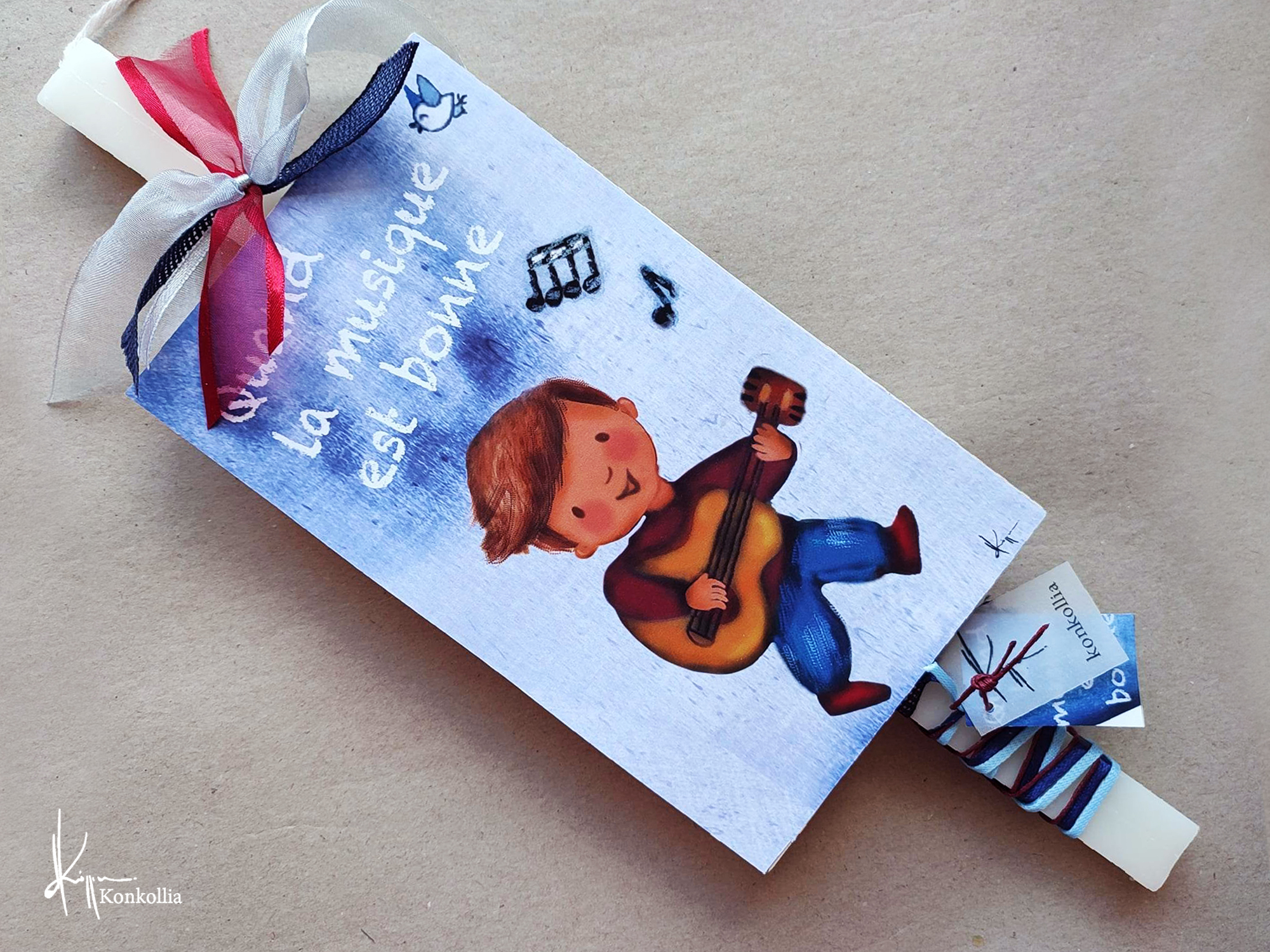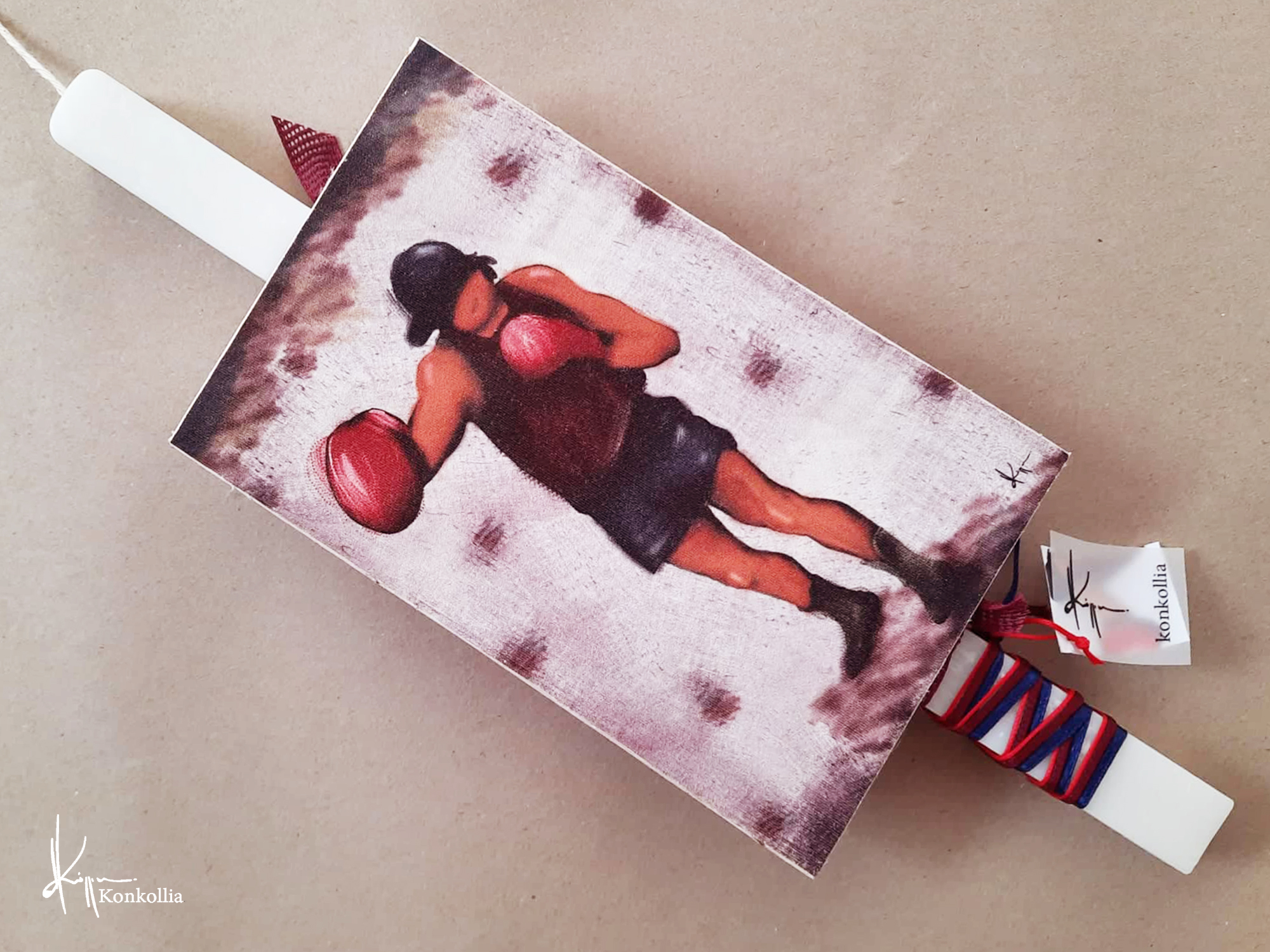 Χειροποίητες πασχαλινές λαμπάδες, κατασκευασμένες με πολύ καλή ποιότητα πρώτης ύλης (παραφίνη). Τα σχέδια τα οποία απεικονίζονται είναι δημιουργίες ζωγραφικής σε ακουαρέλα ή άλλης τεχνικής της Κωνσταντίνας Κόλλια τα οποία ενσωματώνονται μέσα στο κερί. Η συγκεκριμένη τεχνική που έχει επιλέξει η δημιουργός έχει σαν αποτέλεσμα την ευκρίνεια των λεπτομερειών και την καθαρότητα των χρωμάτων των σχεδίων.