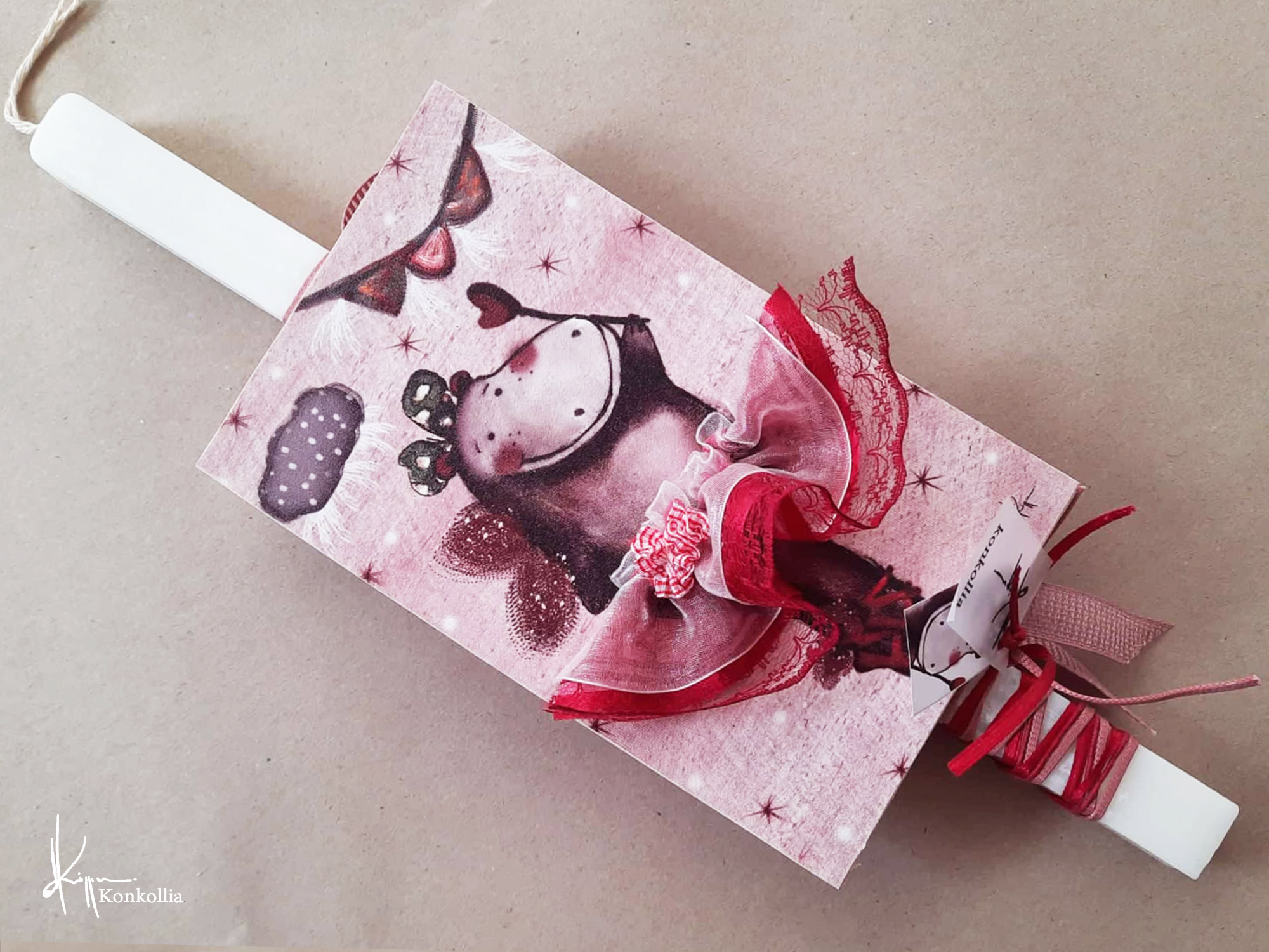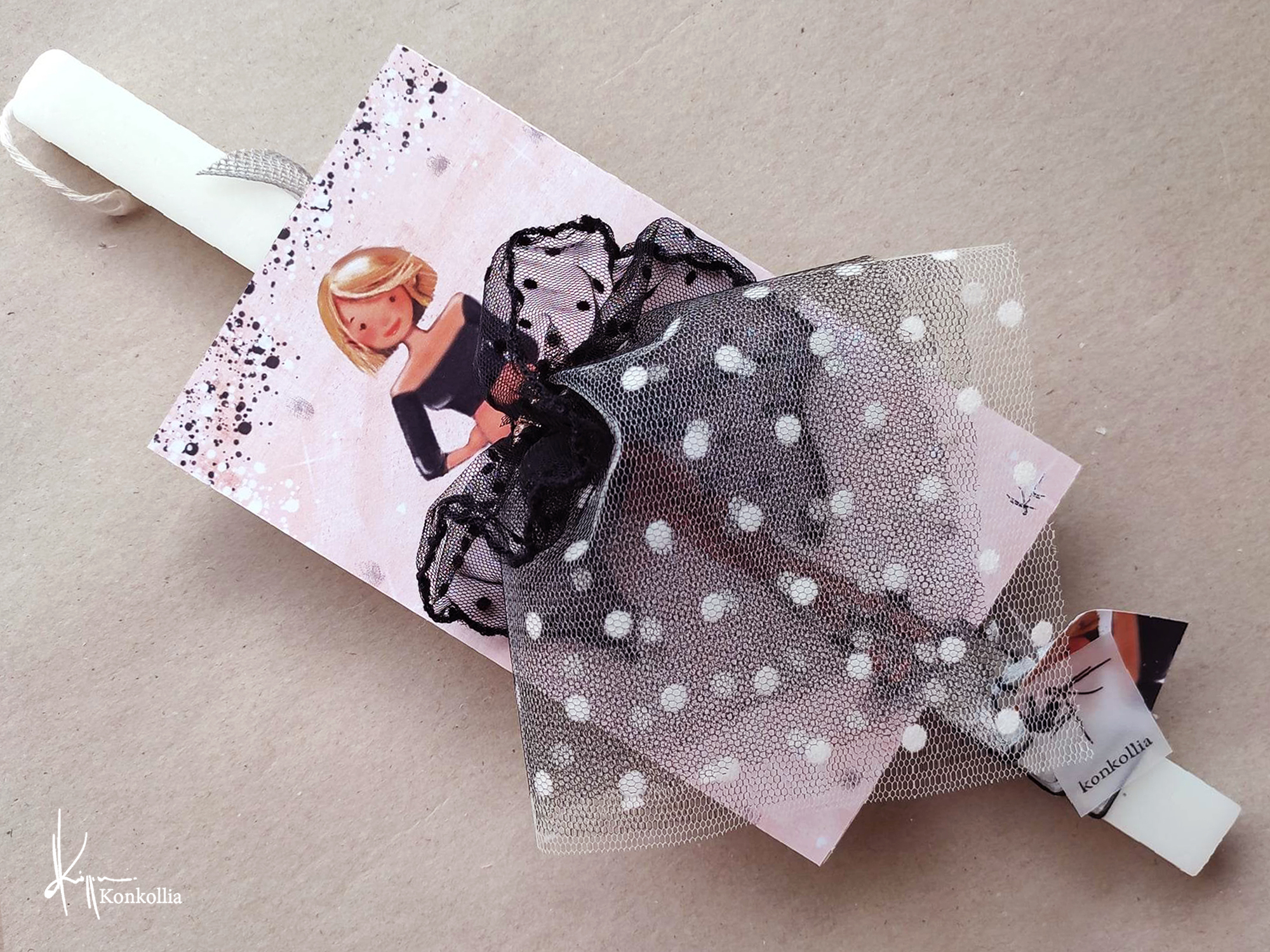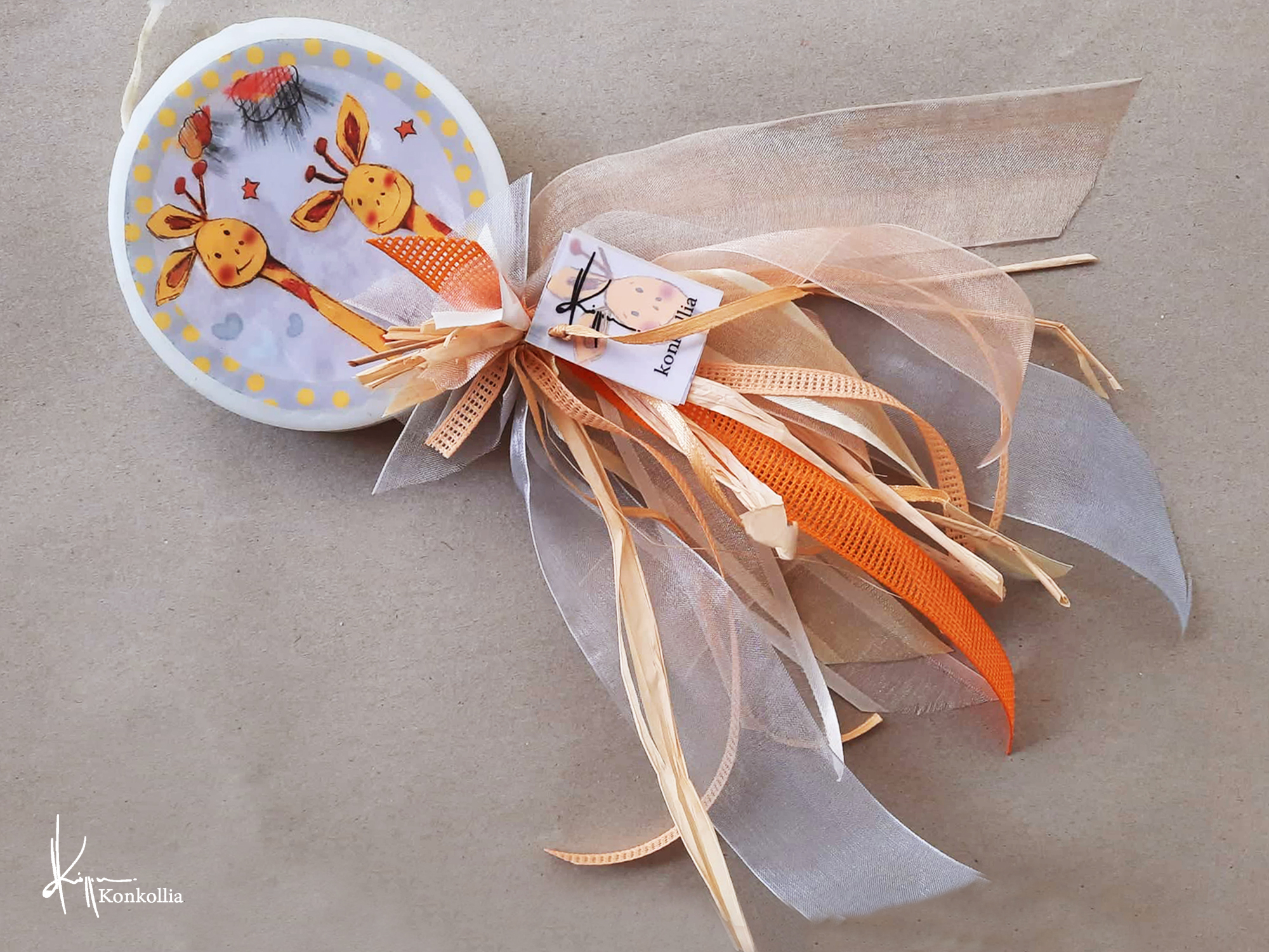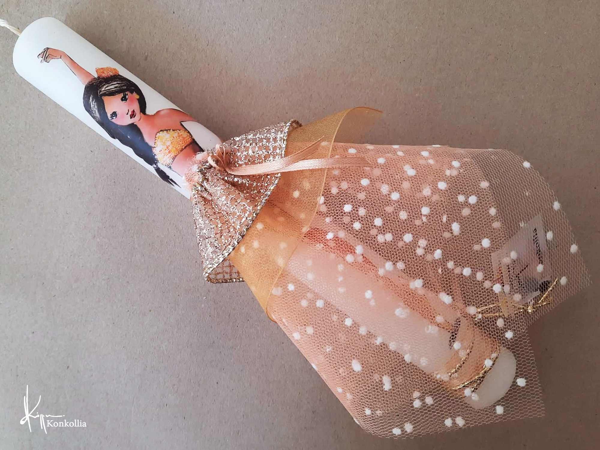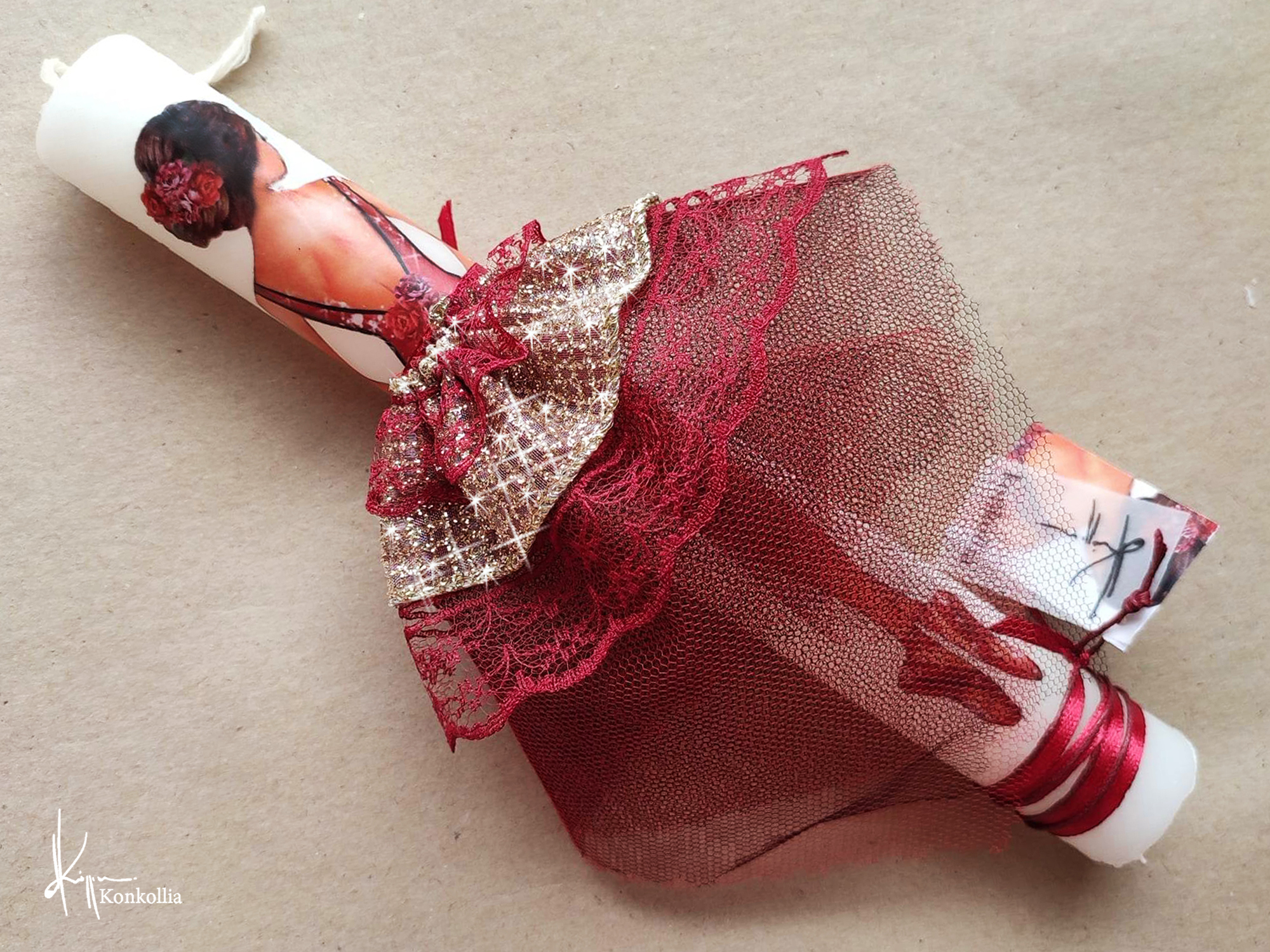 Χειροποίητες πασχαλινές λαμπάδες, κατασκευασμένες με πολύ καλή ποιότητα πρώτης ύλης (παραφίνη). Τα σχέδια τα οποία απεικονίζονται είναι δημιουργίες ζωγραφικής σε ακουαρέλα ή άλλης τεχνικής της Κωνσταντίνας Κόλλια τα οποία ενσωματώνονται μέσα στο κερί. Η συγκεκριμένη τεχνική που έχει επιλέξει η δημιουργός έχει σαν αποτέλεσμα την ευκρίνεια των λεπτομερειών και την καθαρότητα των χρωμάτων των σχεδίων.