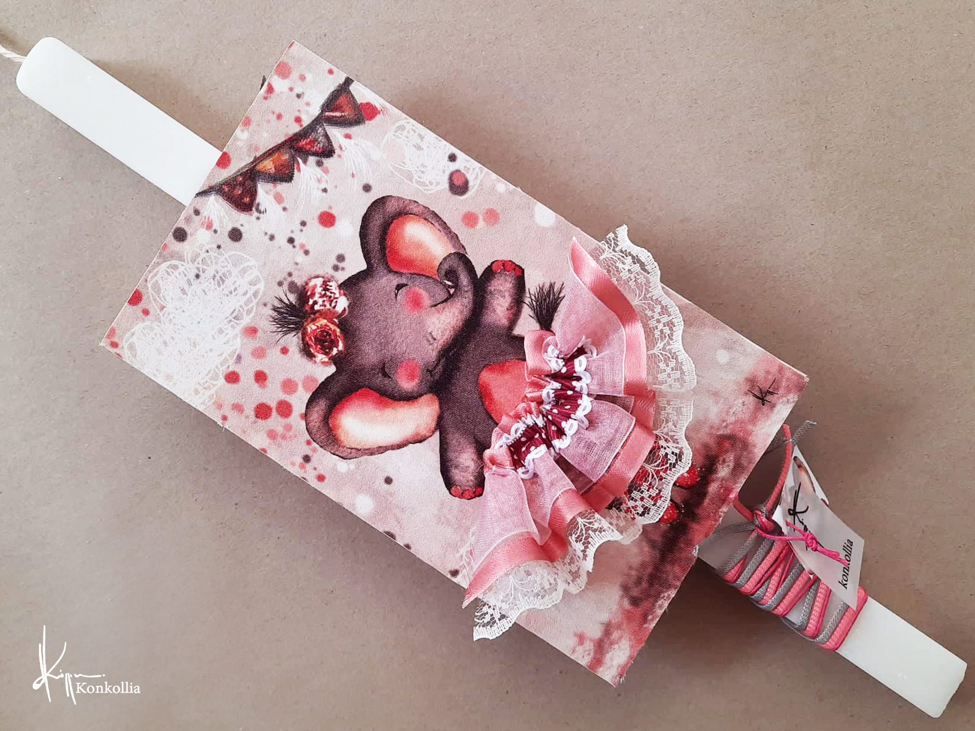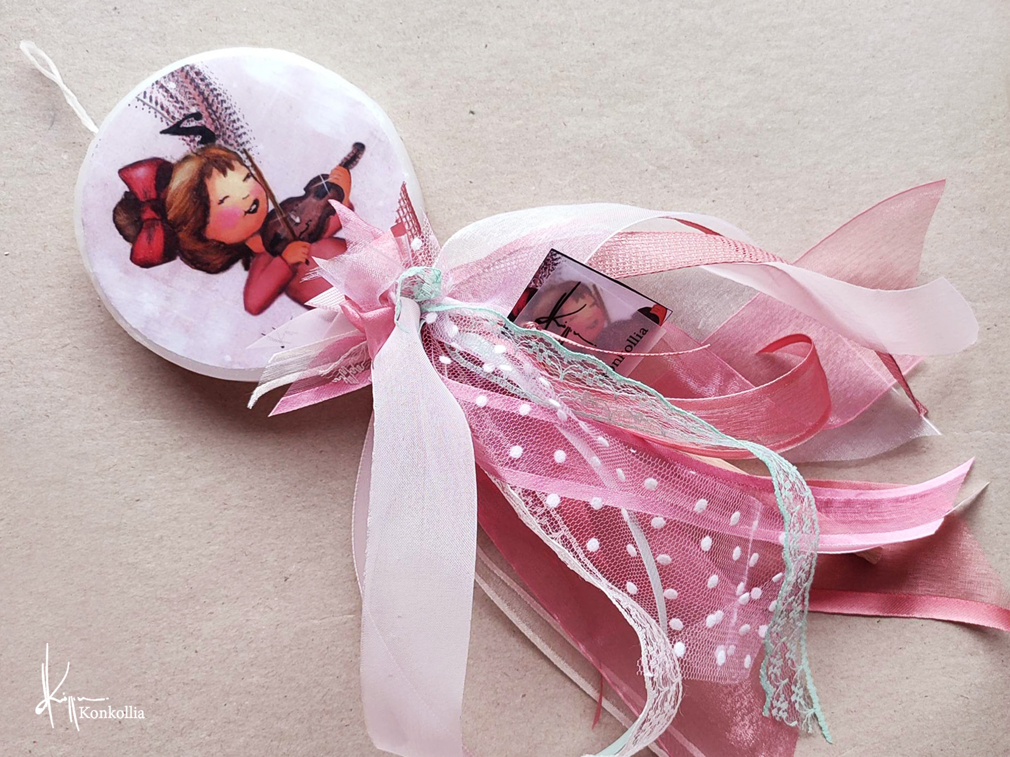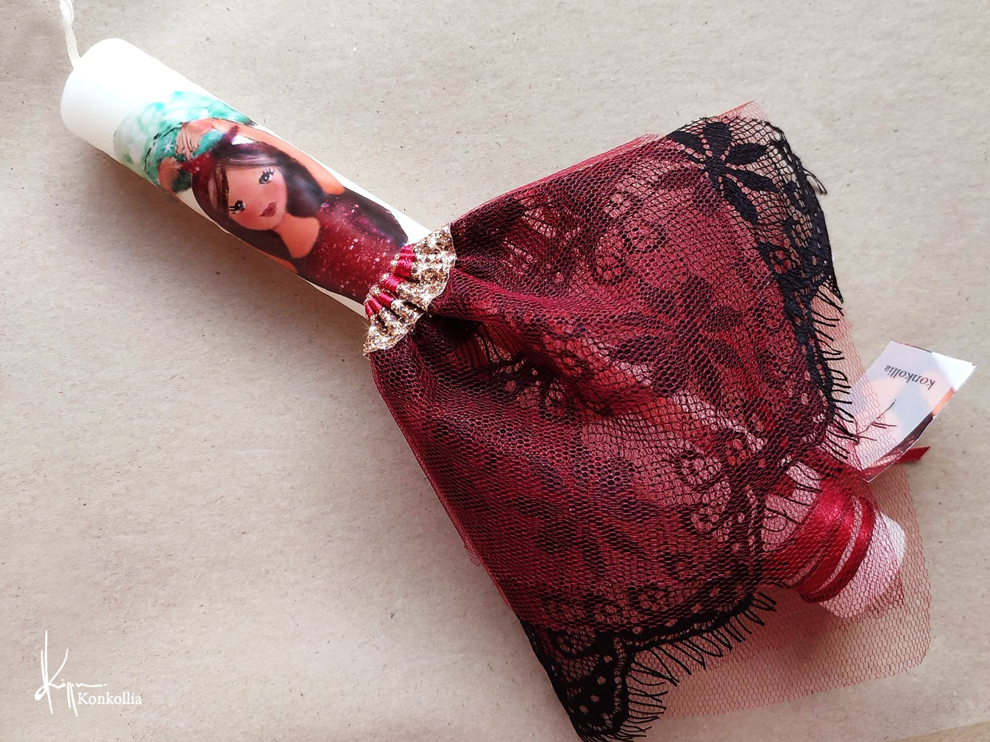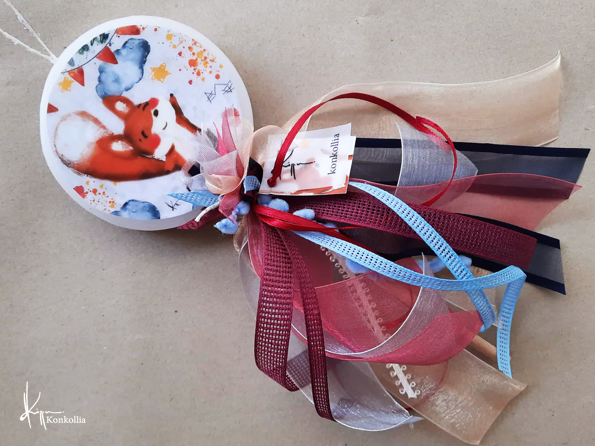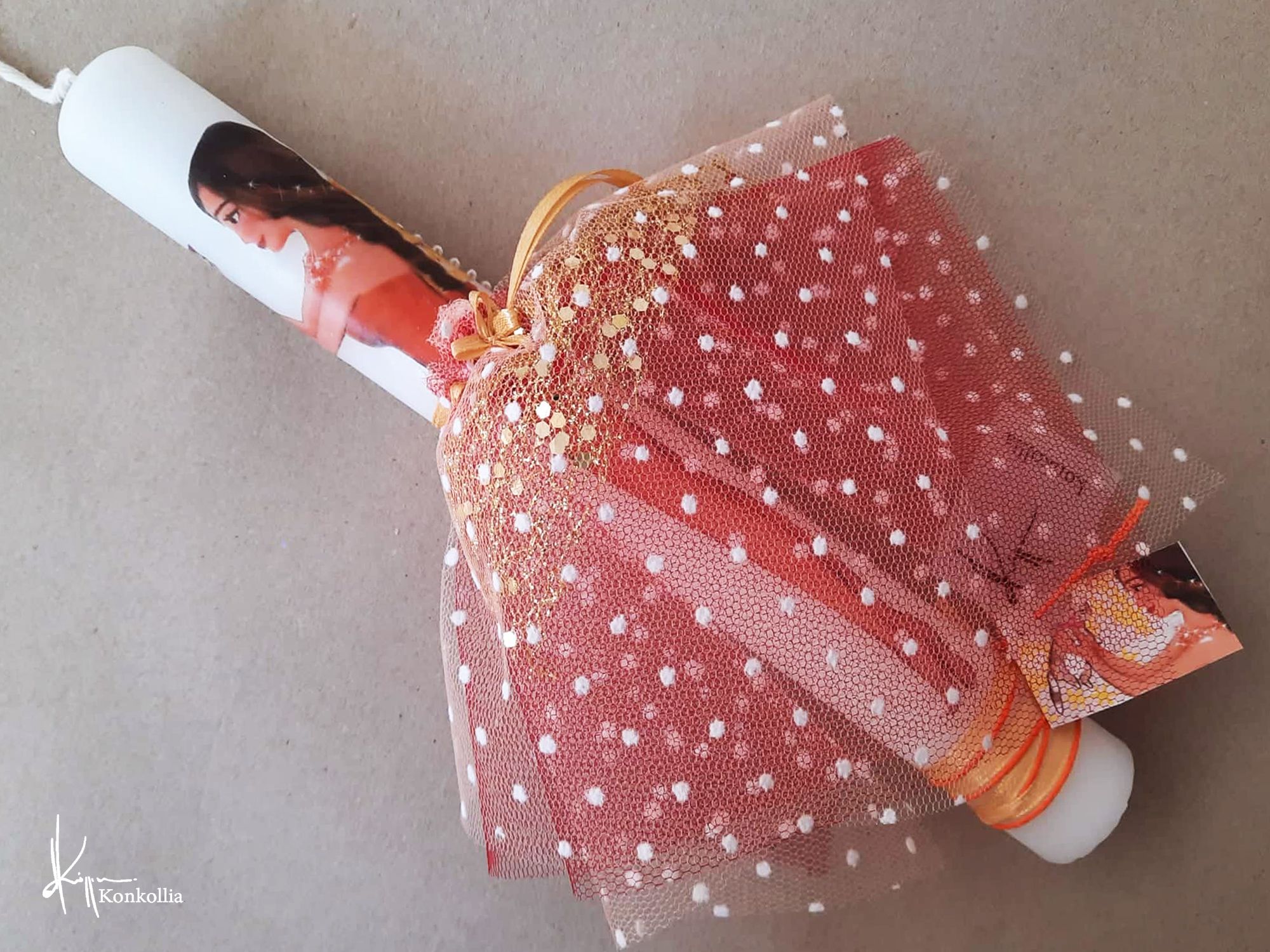 Χειροποίητες πασχαλινές λαμπάδες, κατασκευασμένες με πολύ καλή ποιότητα πρώτης ύλης (παραφίνη). Τα σχέδια τα οποία απεικονίζονται είναι δημιουργίες ζωγραφικής σε ακουαρέλα ή άλλης τεχνικής της Κωνσταντίνας Κόλλια τα οποία ενσωματώνονται μέσα στο κερί. Η συγκεκριμένη τεχνική που έχει επιλέξει η δημιουργός έχει σαν αποτέλεσμα την ευκρίνεια των λεπτομερειών και την καθαρότητα των χρωμάτων των σχεδίων.