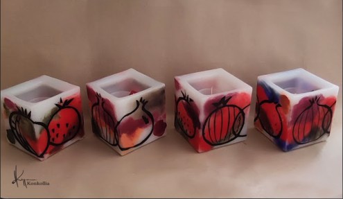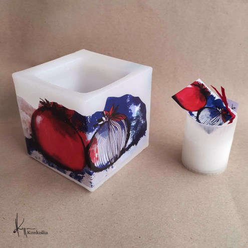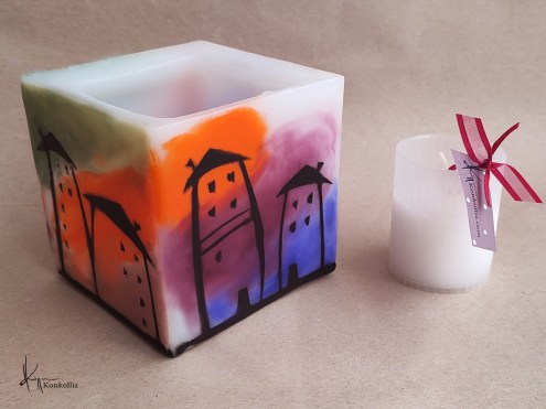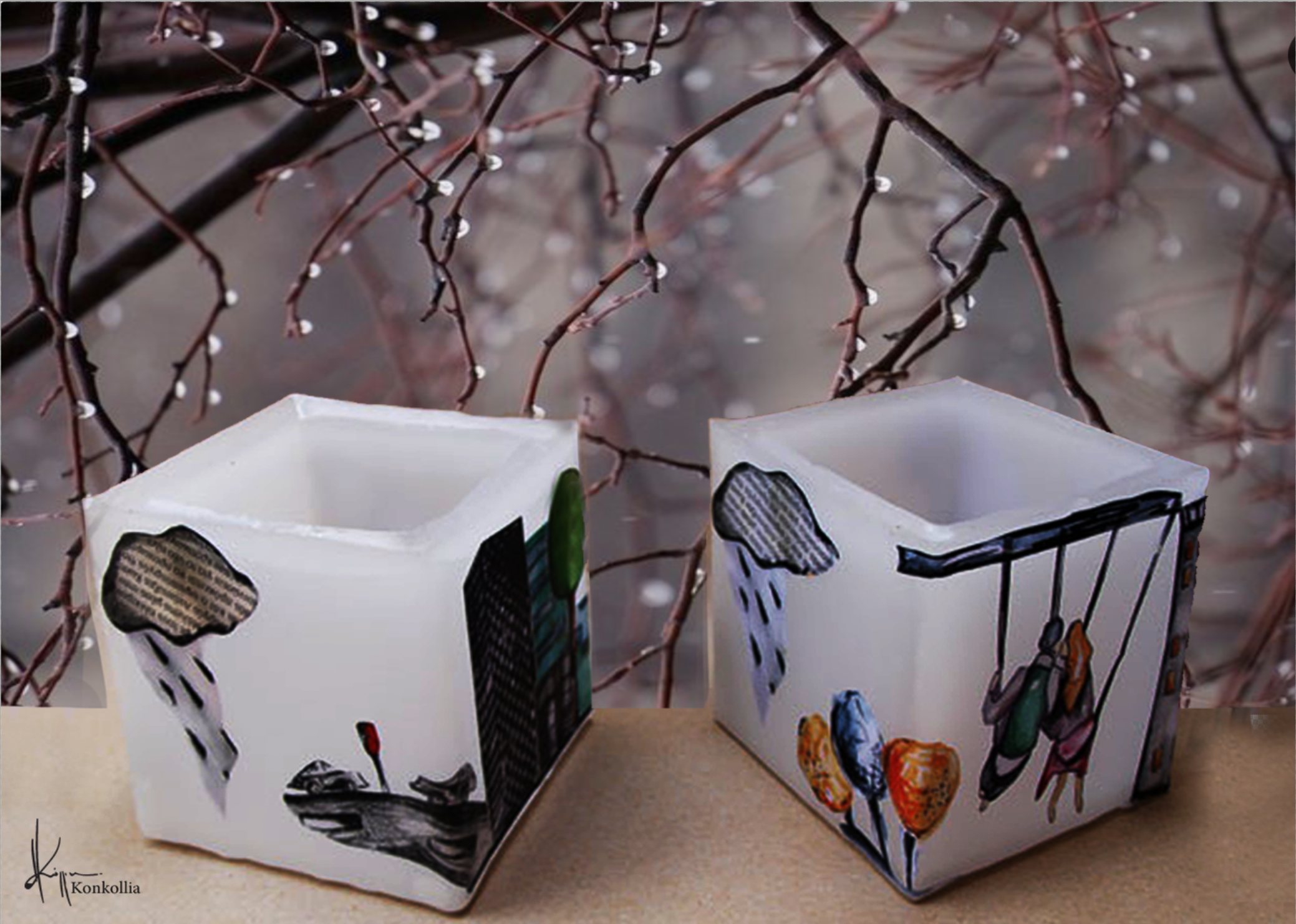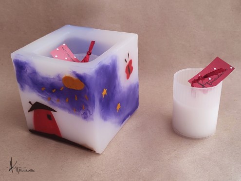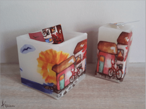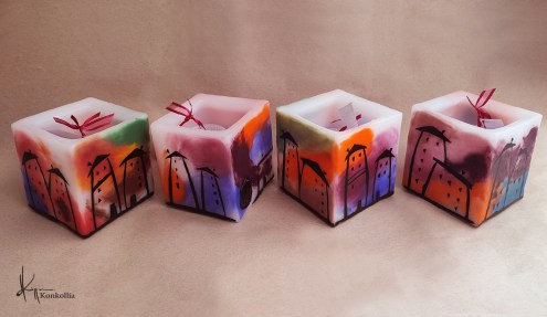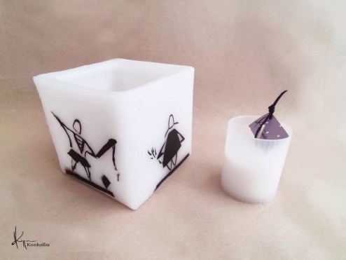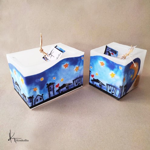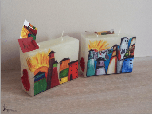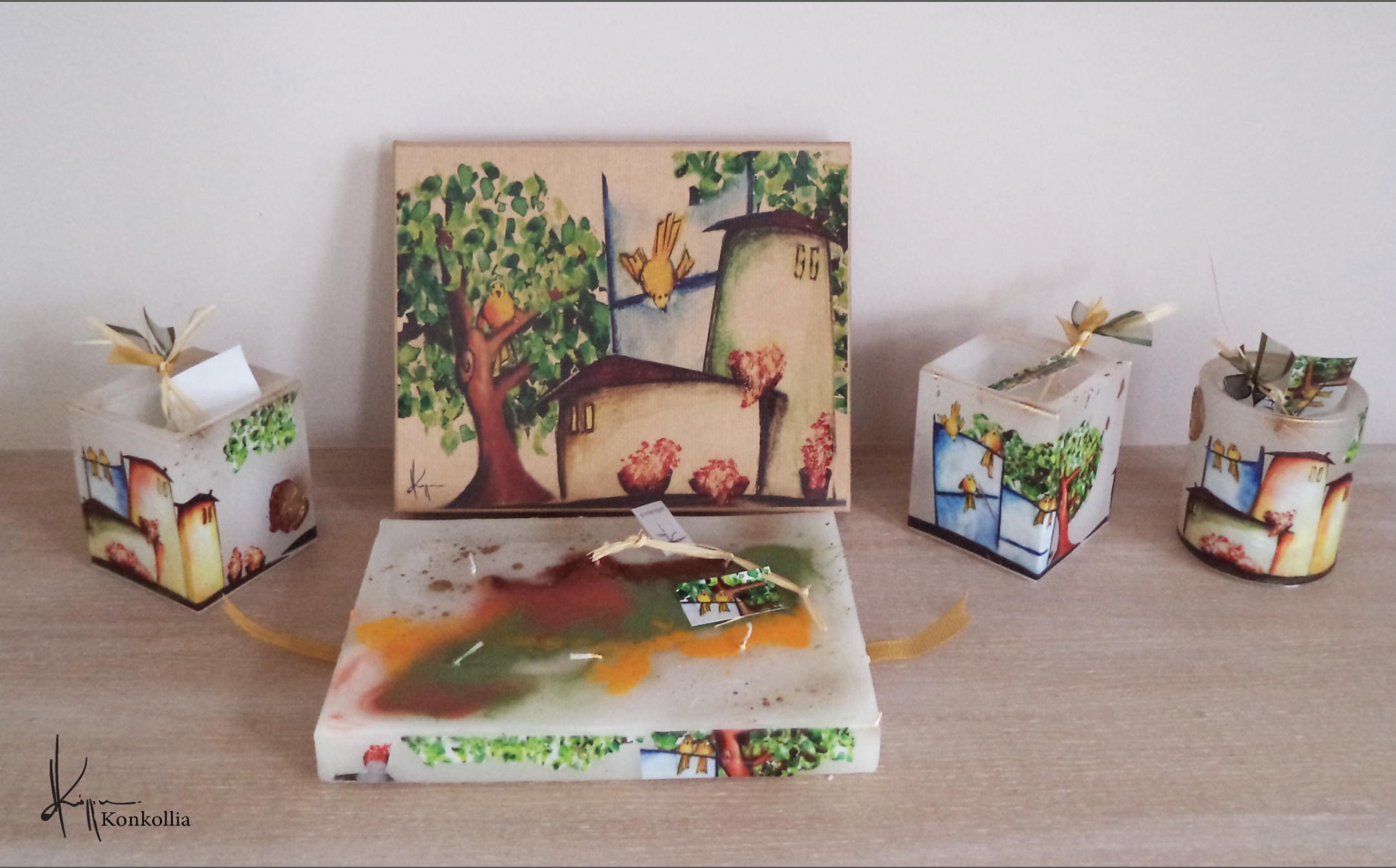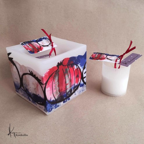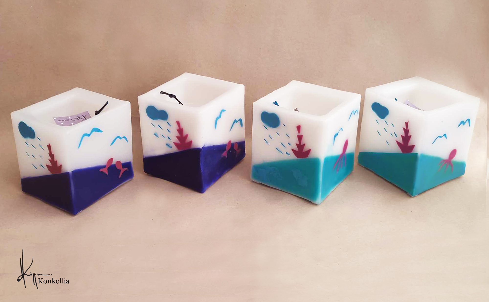 Τα κεριά της Κωνσταντίνας Κόλλια είναι χειροποίητα, κατασκευασμένα με πολύ καλή ποιότητα πρώτης ύλης (παραφίνη). Τα σχέδια τα οποία απεικονίζονται σε αυτές τις δύο κατηγορίες ειναι δικές της δημιουργίες ζωγραφικής σε ακουαρέλα ή άλλης τεχνικής τα οποία ενσωματώνονται μέσα στο κερί. Η συγκεκριμένη τεχνική που έχει επιλέξει η δημιουργός έχει σαν αποτέλεσμα την ευκρίνεια των λεπτομερειών και την καθαρότητα των χρωμάτων των σχεδίων.