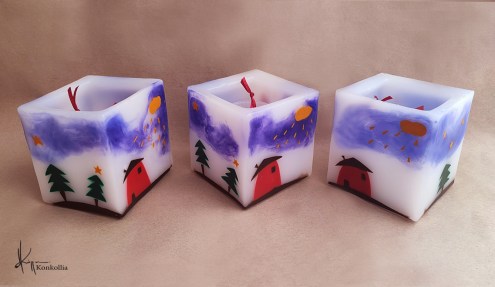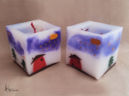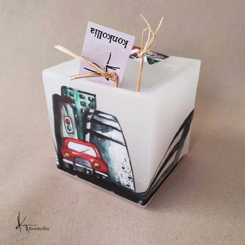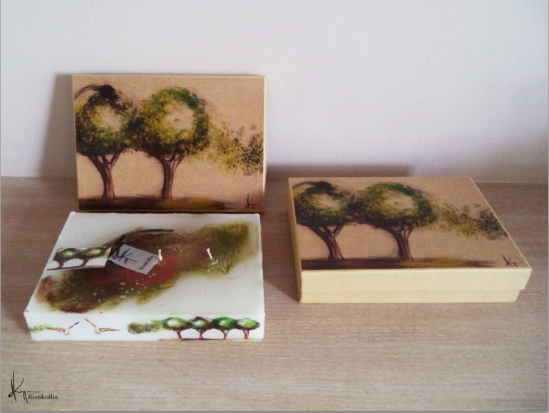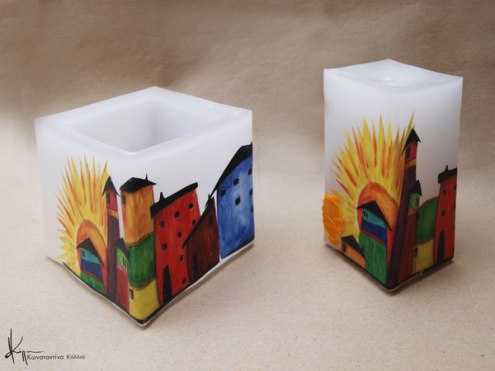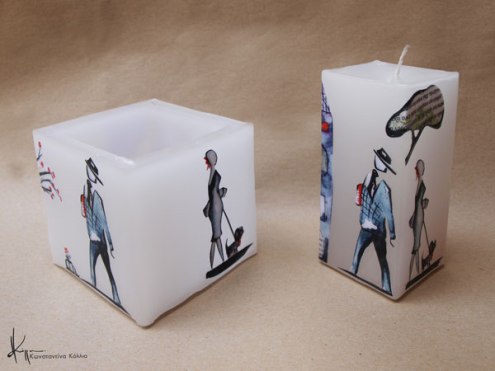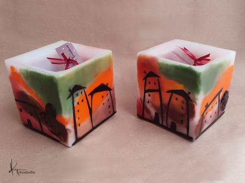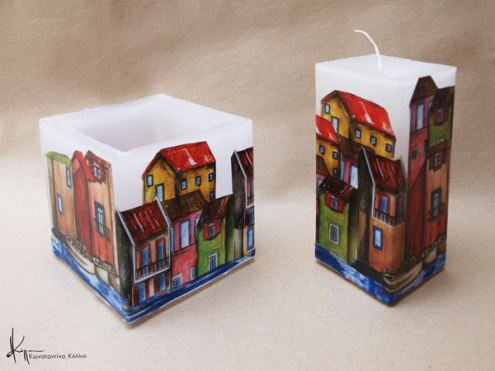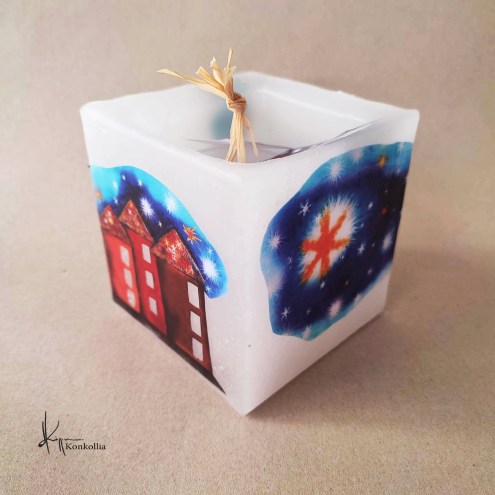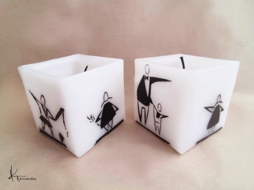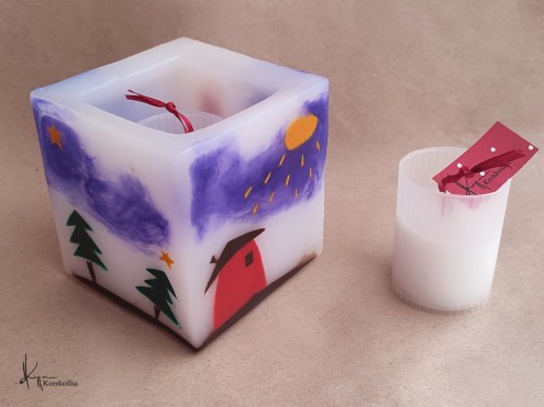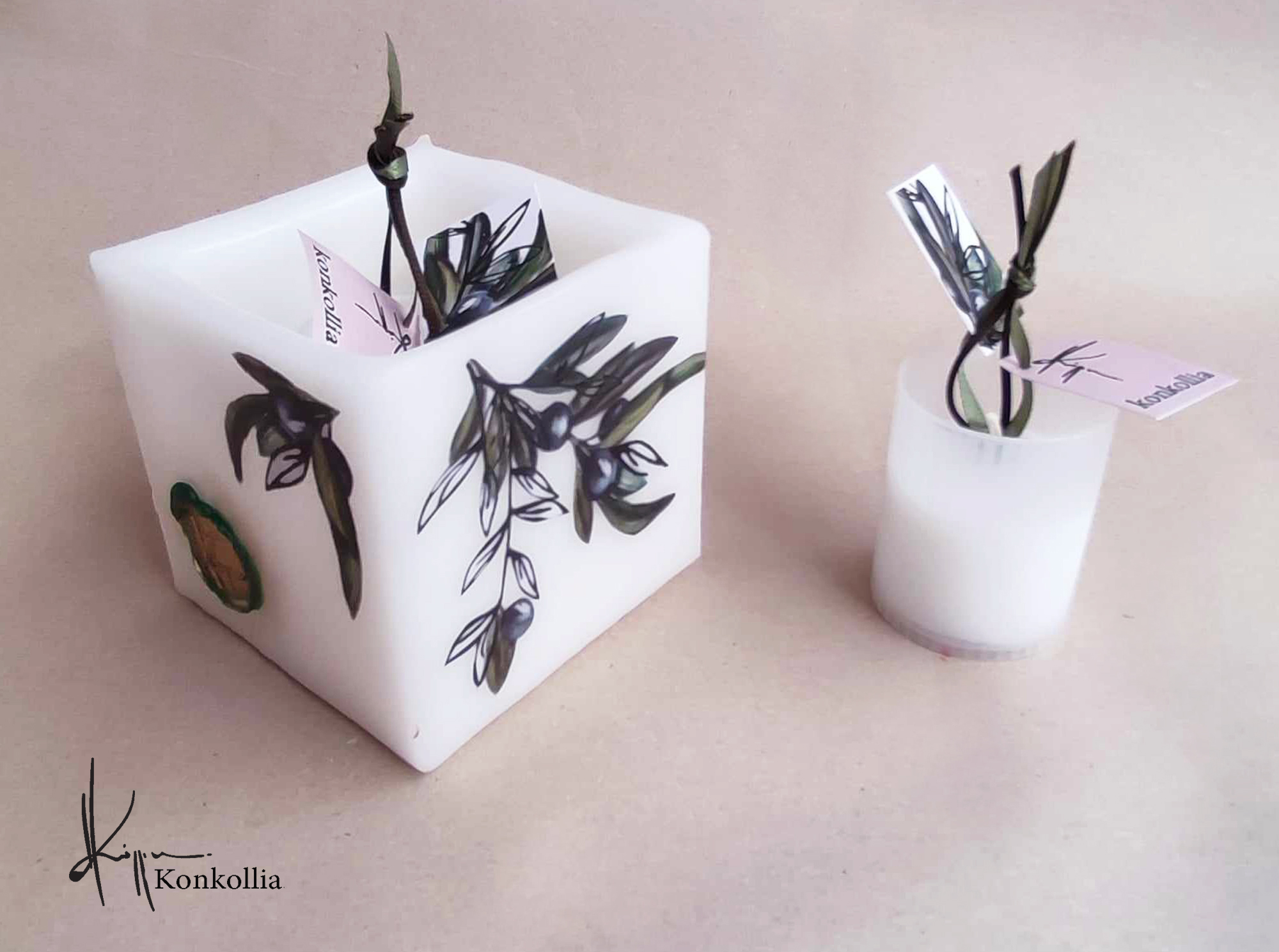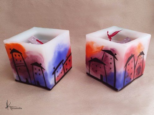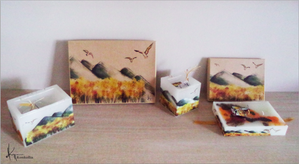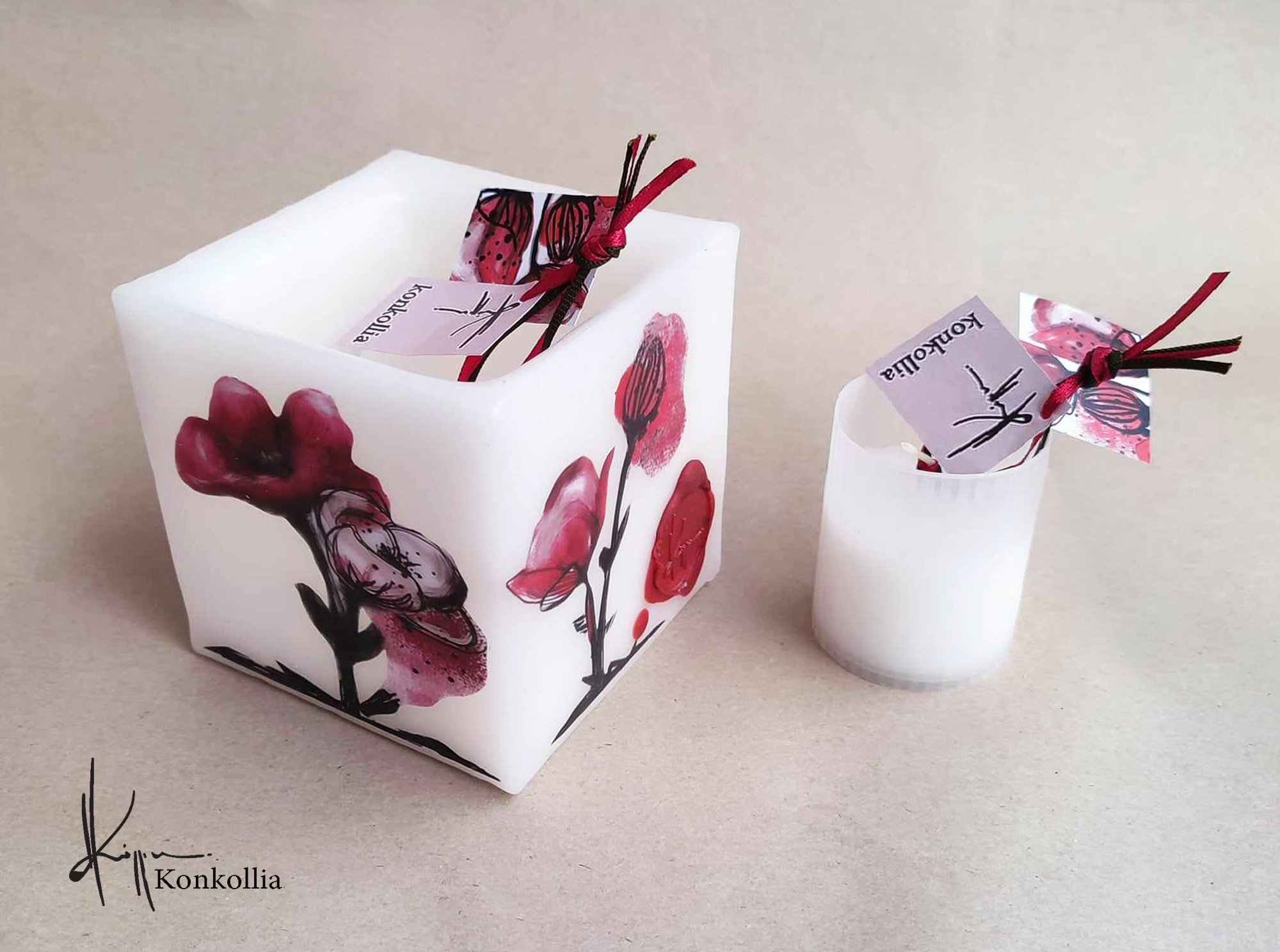 Τα κεριά της Κωνσταντίνας Κόλλια είναι χειροποίητα, κατασκευασμένα με πολύ καλή ποιότητα πρώτης ύλης (παραφίνη). Τα σχέδια τα οποία απεικονίζονται σε αυτές τις δύο κατηγορίες ειναι δικές της δημιουργίες ζωγραφικής σε ακουαρέλα ή άλλης τεχνικής τα οποία ενσωματώνονται μέσα στο κερί. Η συγκεκριμένη τεχνική που έχει επιλέξει η δημιουργός έχει σαν αποτέλεσμα την ευκρίνεια των λεπτομερειών και την καθαρότητα των χρωμάτων των σχεδίων.