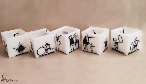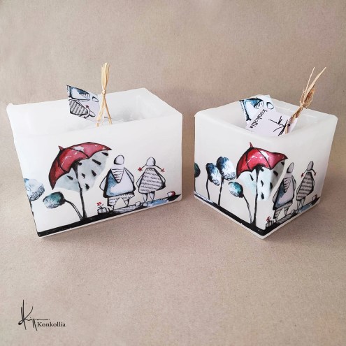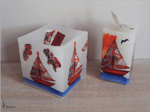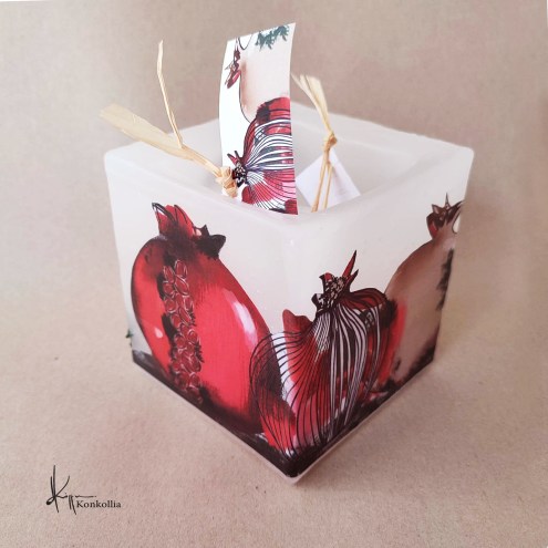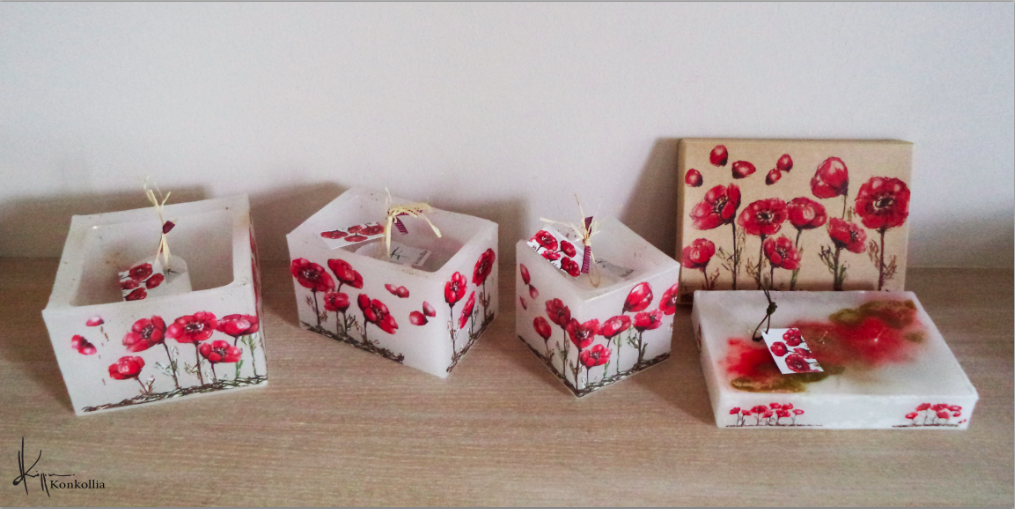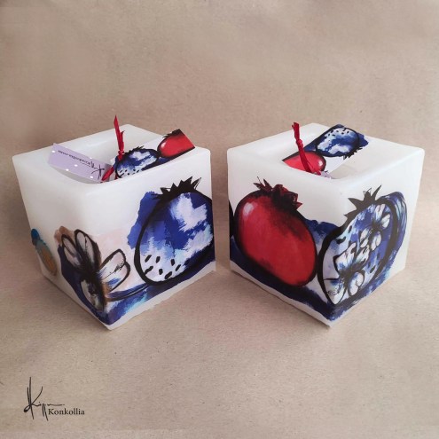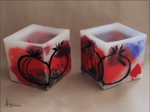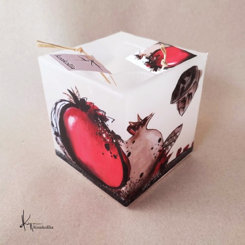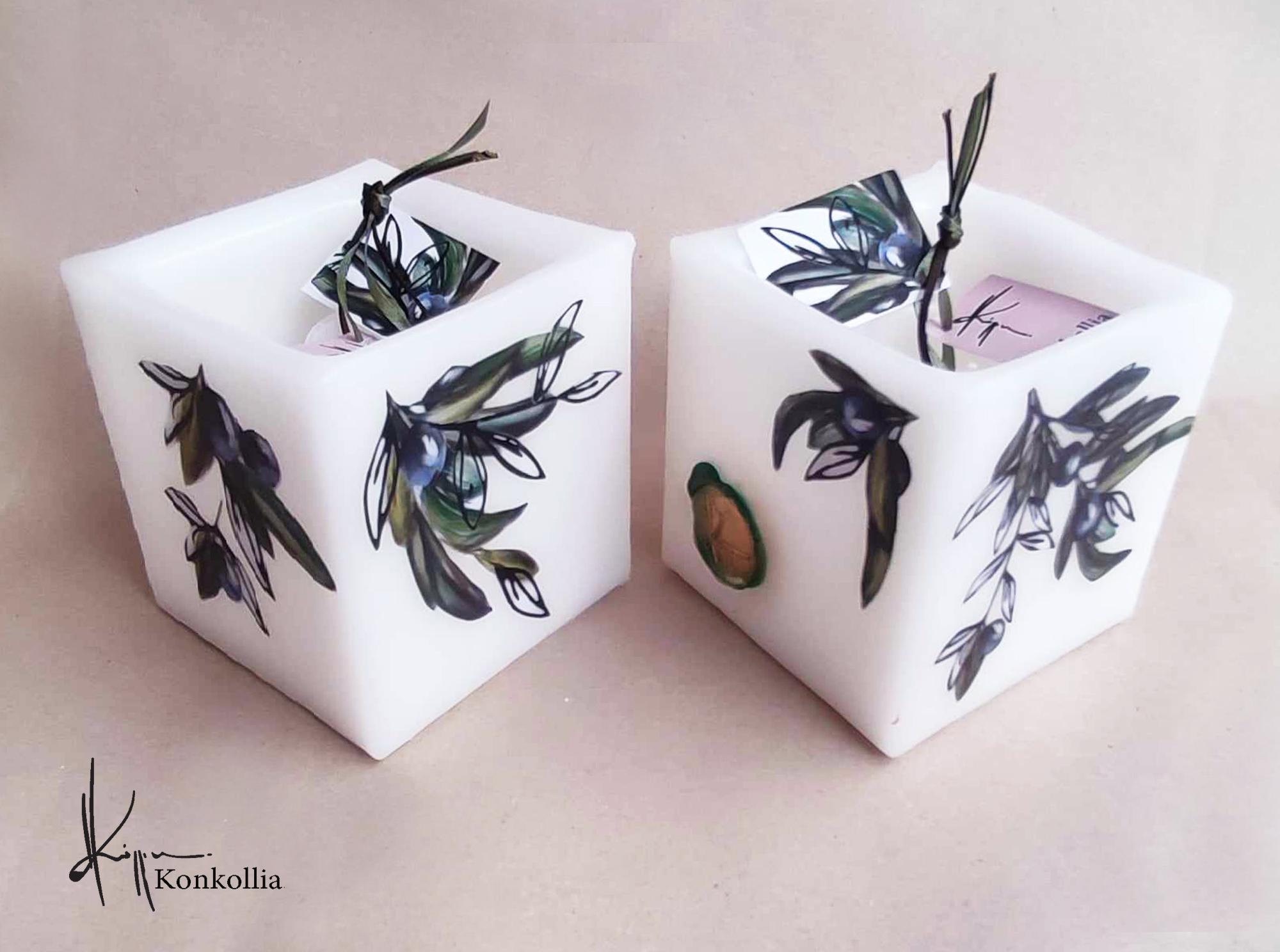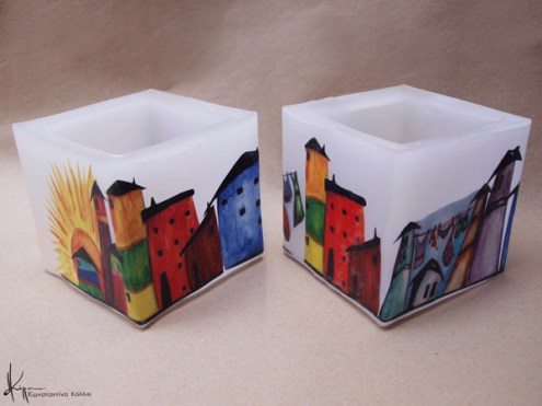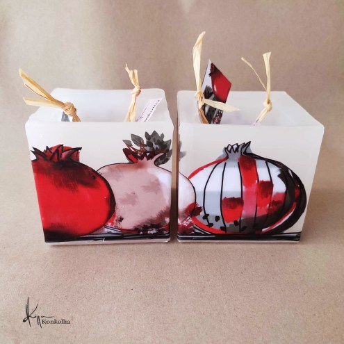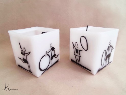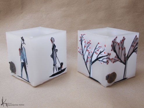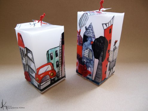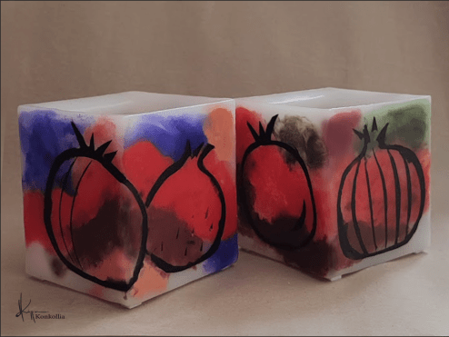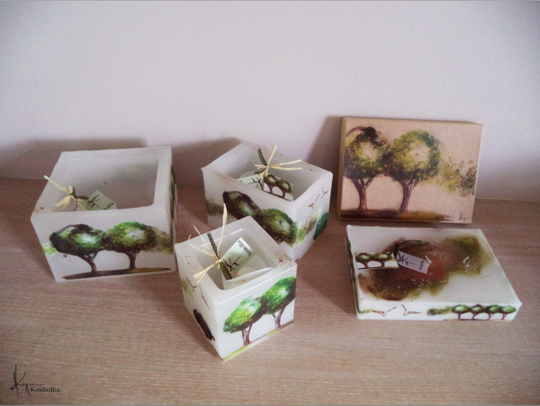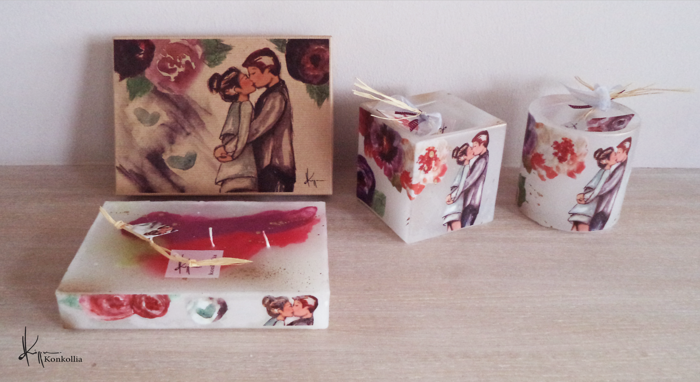 Τα κεριά της Κωνσταντίνας Κόλλια είναι χειροποίητα, κατασκευασμένα με πολύ καλή ποιότητα πρώτης ύλης (παραφίνη). Τα σχέδια τα οποία απεικονίζονται σε αυτές τις δύο κατηγορίες ειναι δικές της δημιουργίες ζωγραφικής σε ακουαρέλα ή άλλης τεχνικής τα οποία ενσωματώνονται μέσα στο κερί. Η συγκεκριμένη τεχνική που έχει επιλέξει η δημιουργός έχει σαν αποτέλεσμα την ευκρίνεια των λεπτομερειών και την καθαρότητα των χρωμάτων των σχεδίων.
