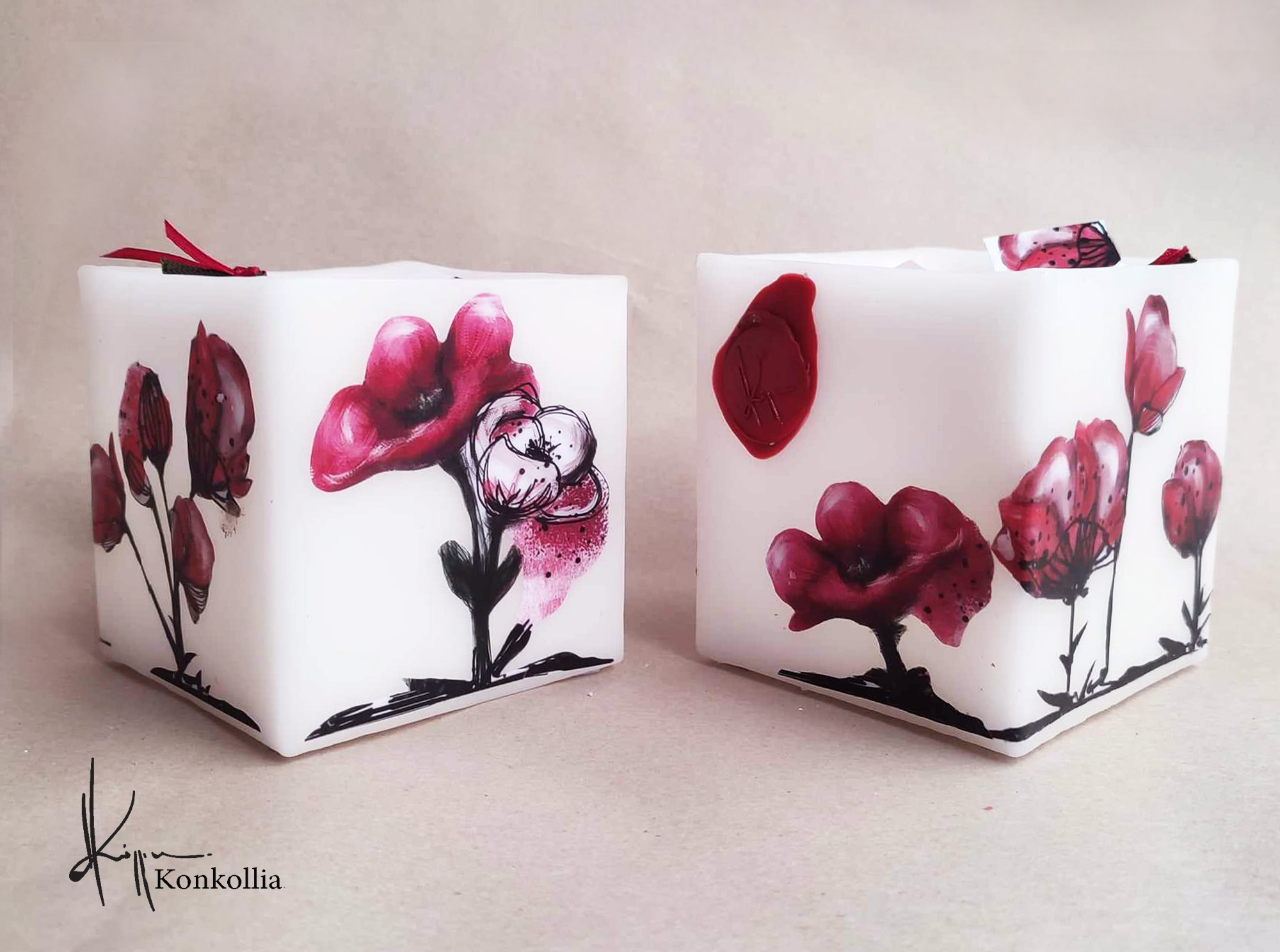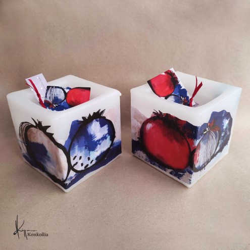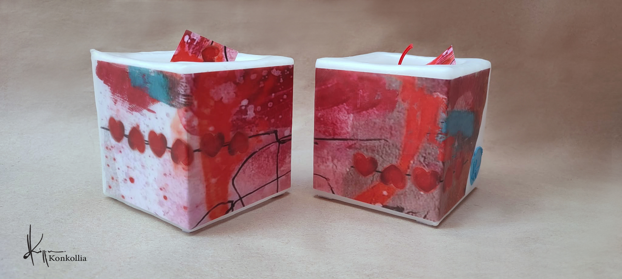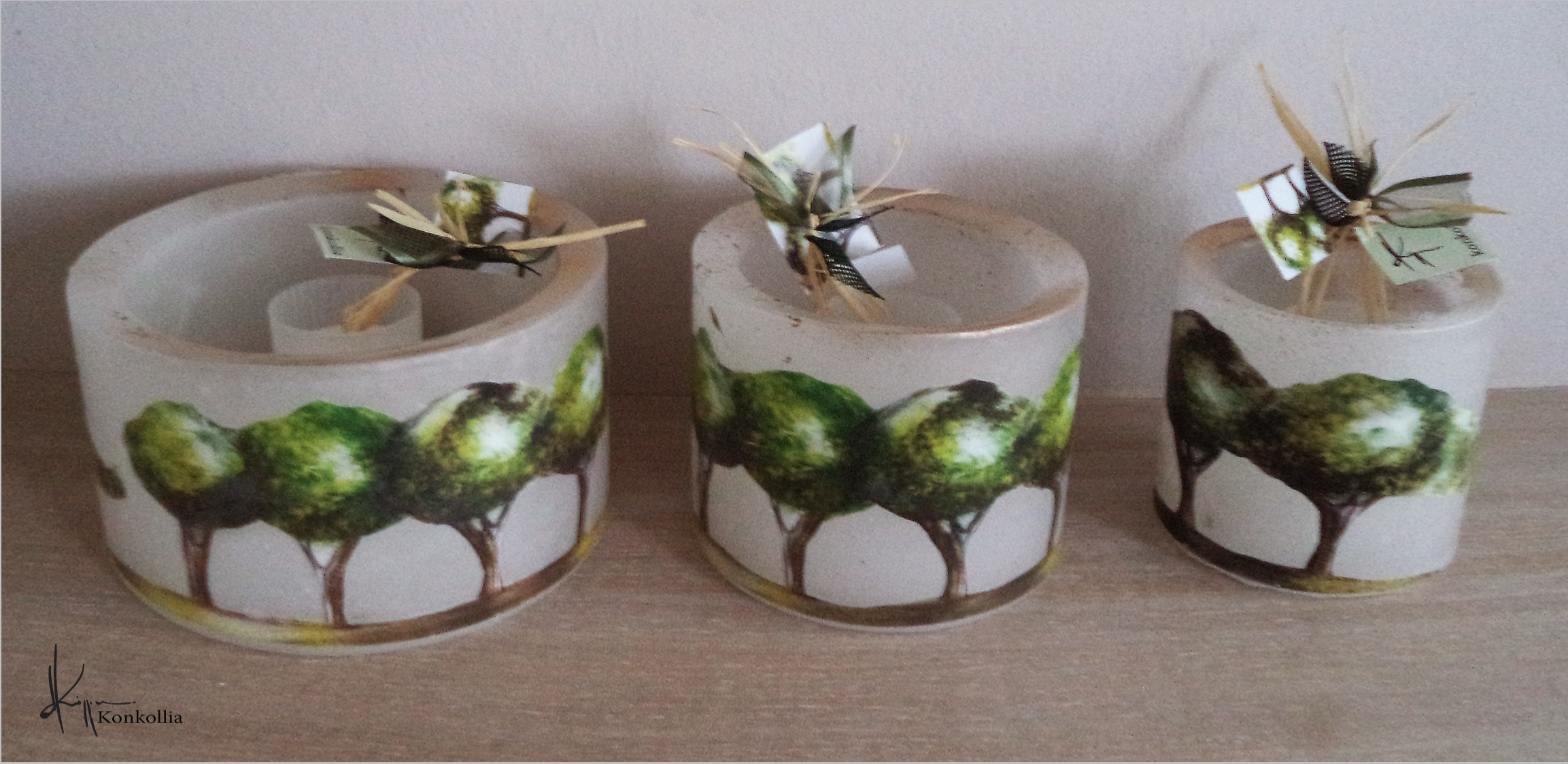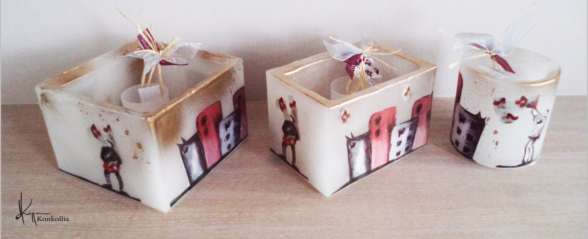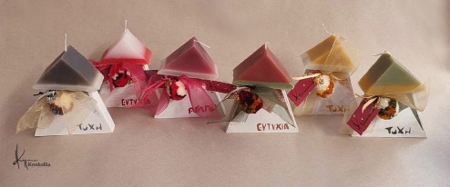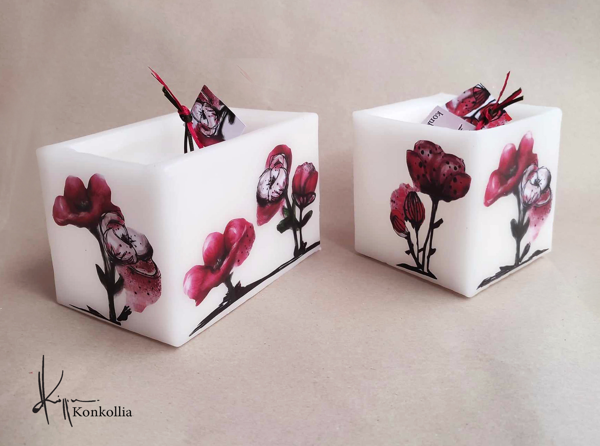 Τα κεριά της Κωνσταντίνας Κόλλια είναι χειροποίητα, κατασκευασμένα με πολύ καλή ποιότητα πρώτης ύλης (παραφίνη). Τα σχέδια τα οποία απεικονίζονται σε αυτές τις δύο κατηγορίες ειναι δικές της δημιουργίες ζωγραφικής σε ακουαρέλα ή άλλης τεχνικής τα οποία ενσωματώνονται μέσα στο κερί. Η συγκεκριμένη τεχνική που έχει επιλέξει η δημιουργός έχει σαν αποτέλεσμα την ευκρίνεια των λεπτομερειών και την καθαρότητα των χρωμάτων των σχεδίων.