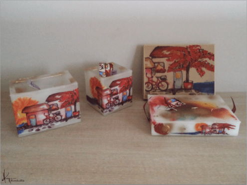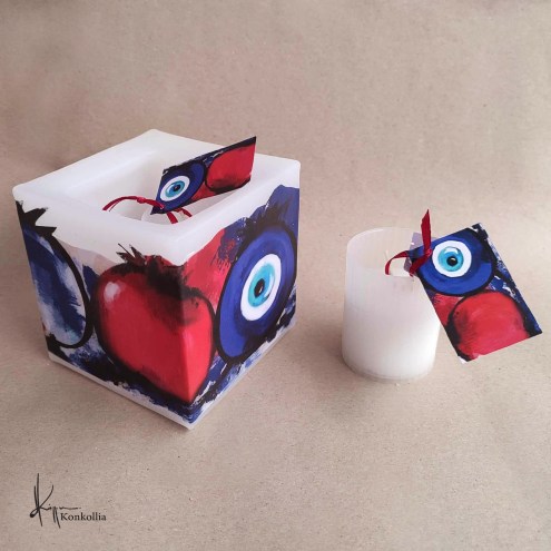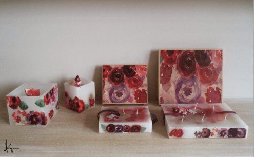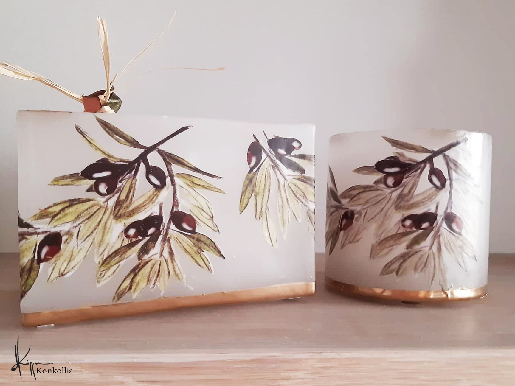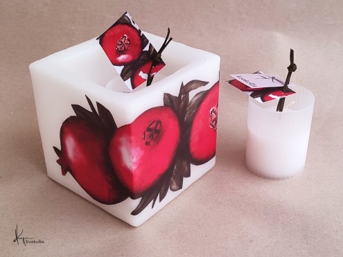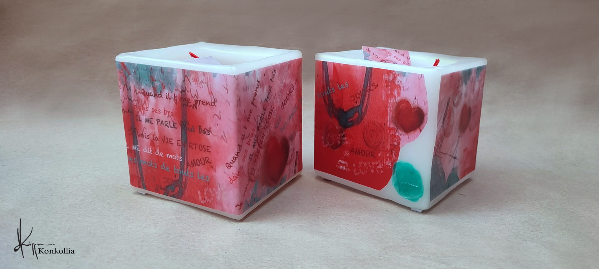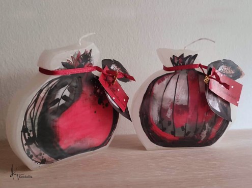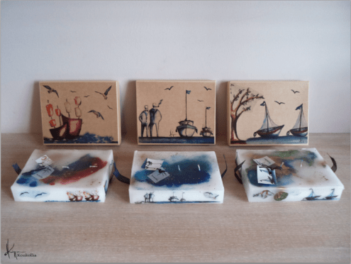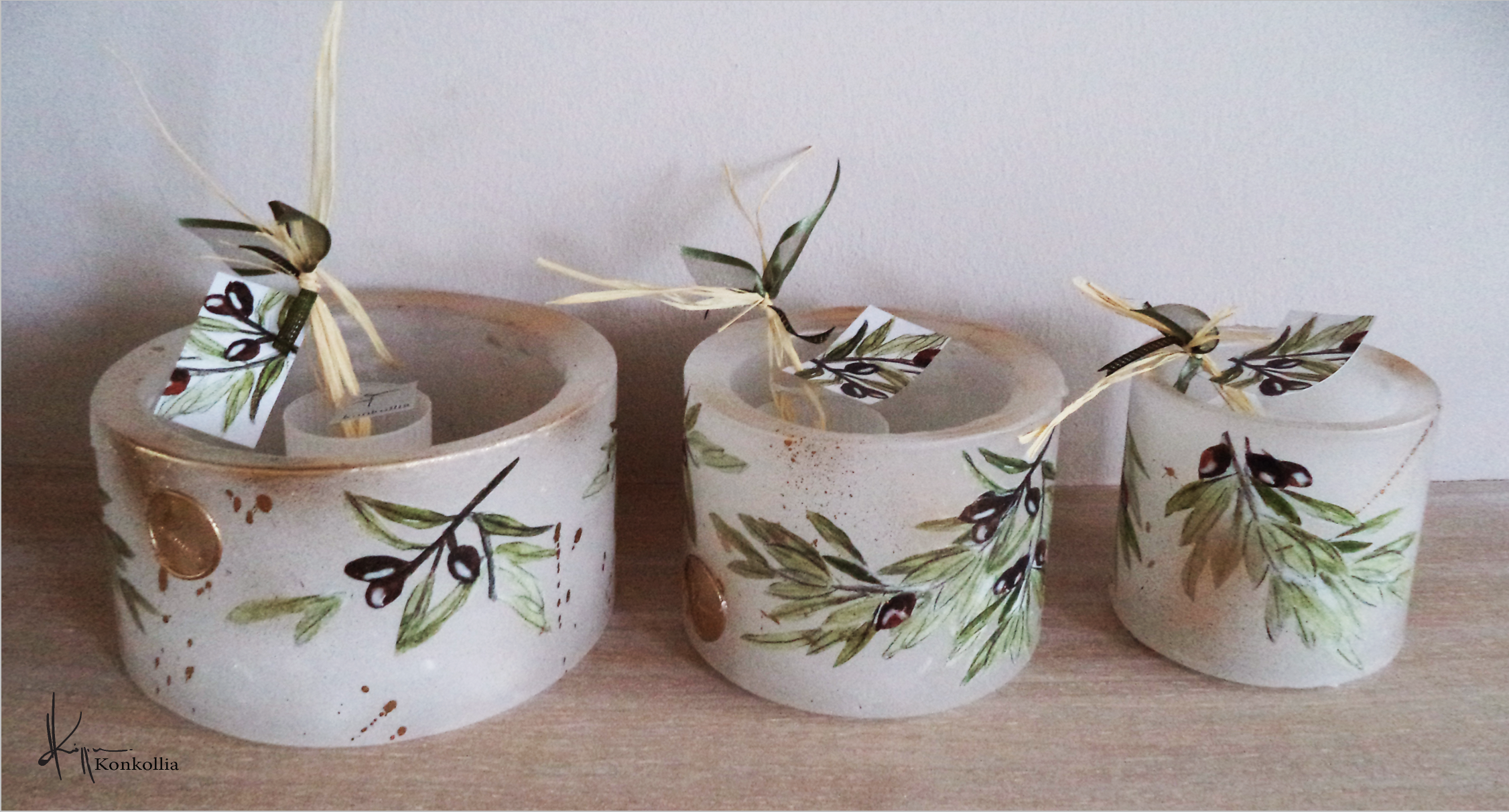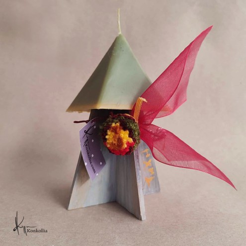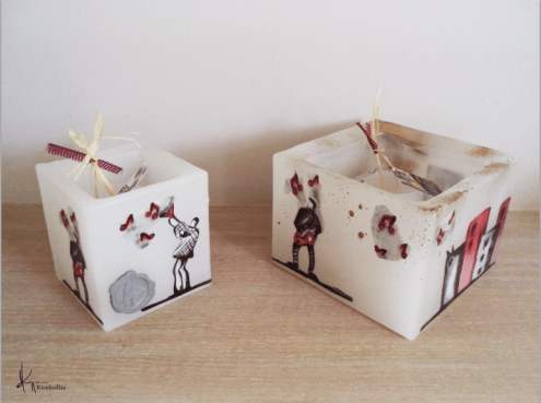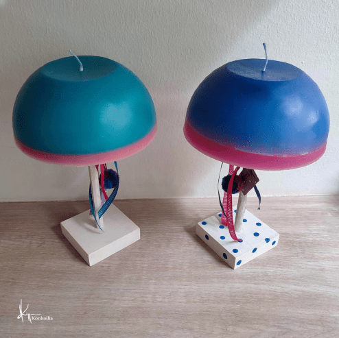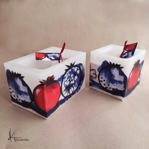 Τα κεριά της Κωνσταντίνας Κόλλια είναι χειροποίητα, κατασκευασμένα με πολύ καλή ποιότητα πρώτης ύλης (παραφίνη). Τα σχέδια τα οποία απεικονίζονται σε αυτές τις δύο κατηγορίες ειναι δικές της δημιουργίες ζωγραφικής σε ακουαρέλα ή άλλης τεχνικής τα οποία ενσωματώνονται μέσα στο κερί. Η συγκεκριμένη τεχνική που έχει επιλέξει η δημιουργός έχει σαν αποτέλεσμα την ευκρίνεια των λεπτομερειών και την καθαρότητα των χρωμάτων των σχεδίων.