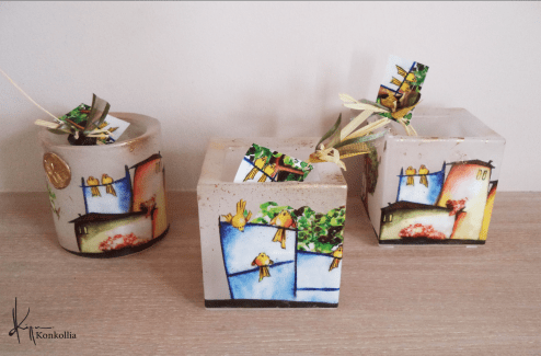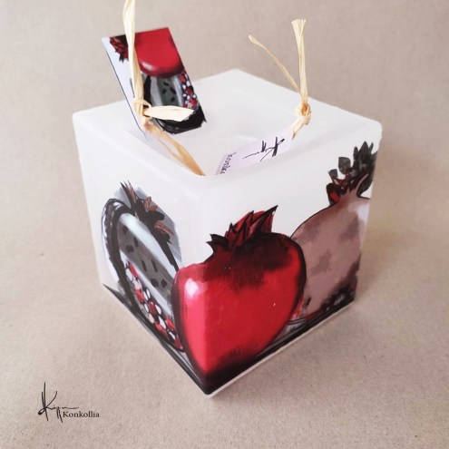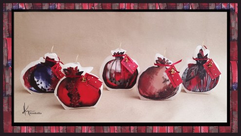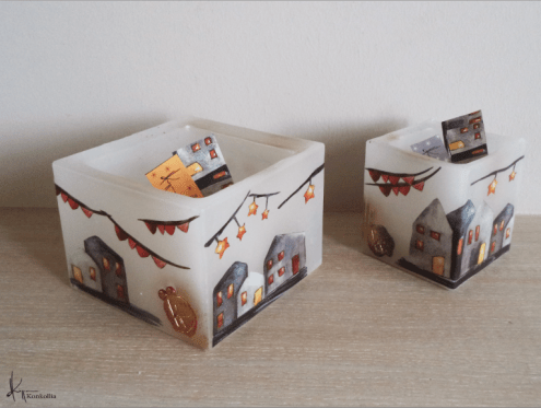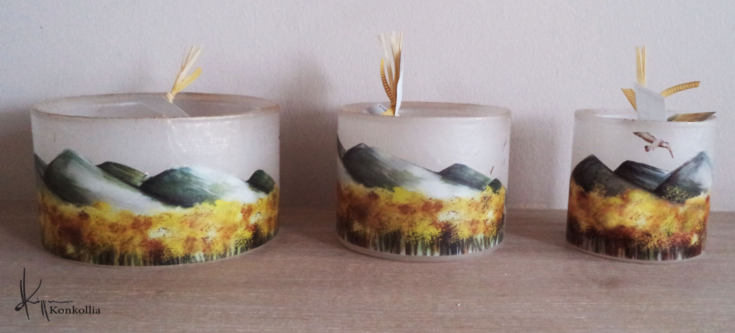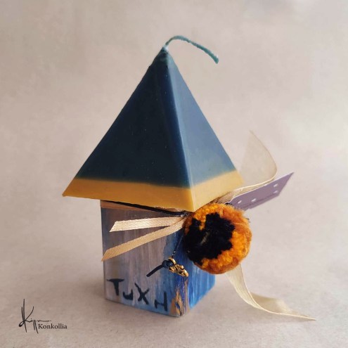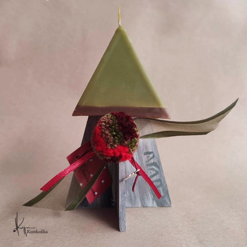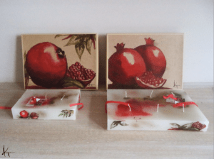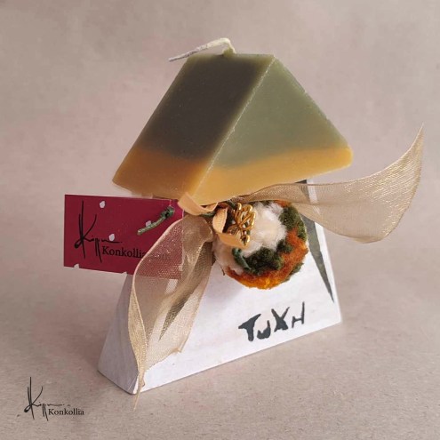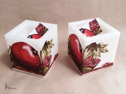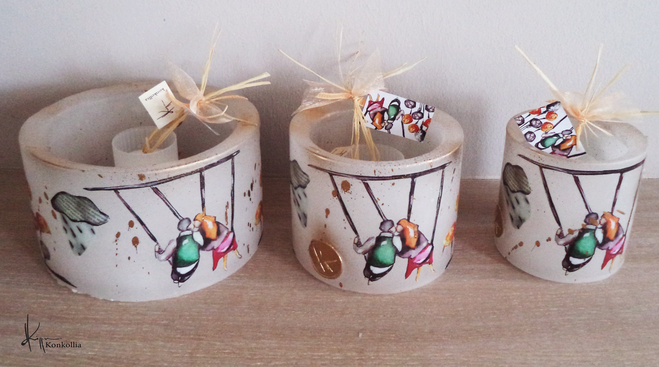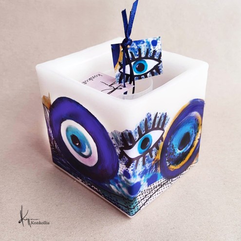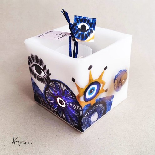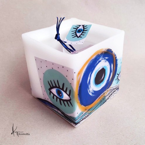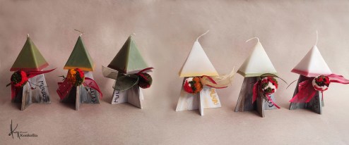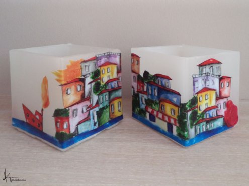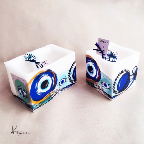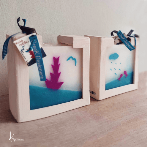 Τα κεριά της Κωνσταντίνας Κόλλια είναι χειροποίητα, κατασκευασμένα με πολύ καλή ποιότητα πρώτης ύλης (παραφίνη). Τα σχέδια τα οποία απεικονίζονται σε αυτές τις δύο κατηγορίες ειναι δικές της δημιουργίες ζωγραφικής σε ακουαρέλα ή άλλης τεχνικής τα οποία ενσωματώνονται μέσα στο κερί. Η συγκεκριμένη τεχνική που έχει επιλέξει η δημιουργός έχει σαν αποτέλεσμα την ευκρίνεια των λεπτομερειών και την καθαρότητα των χρωμάτων των σχεδίων.