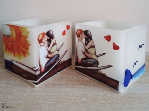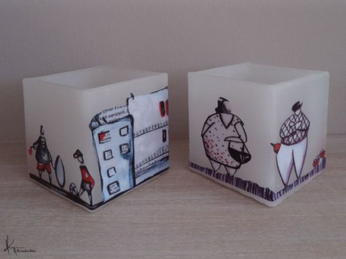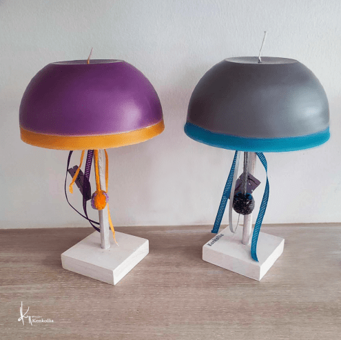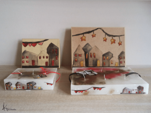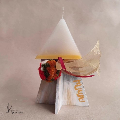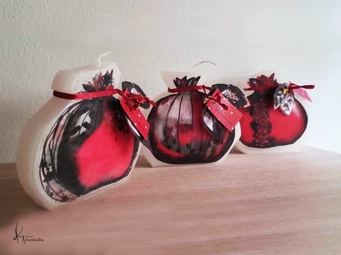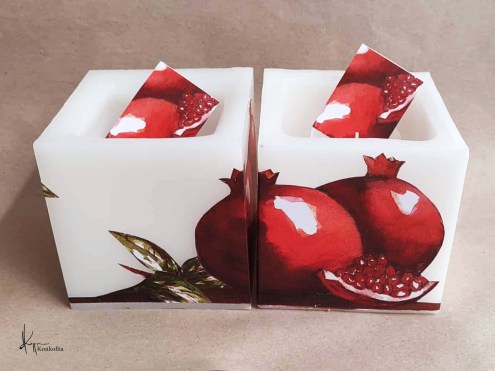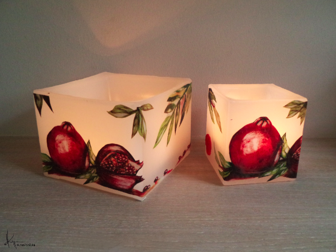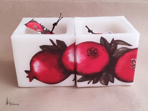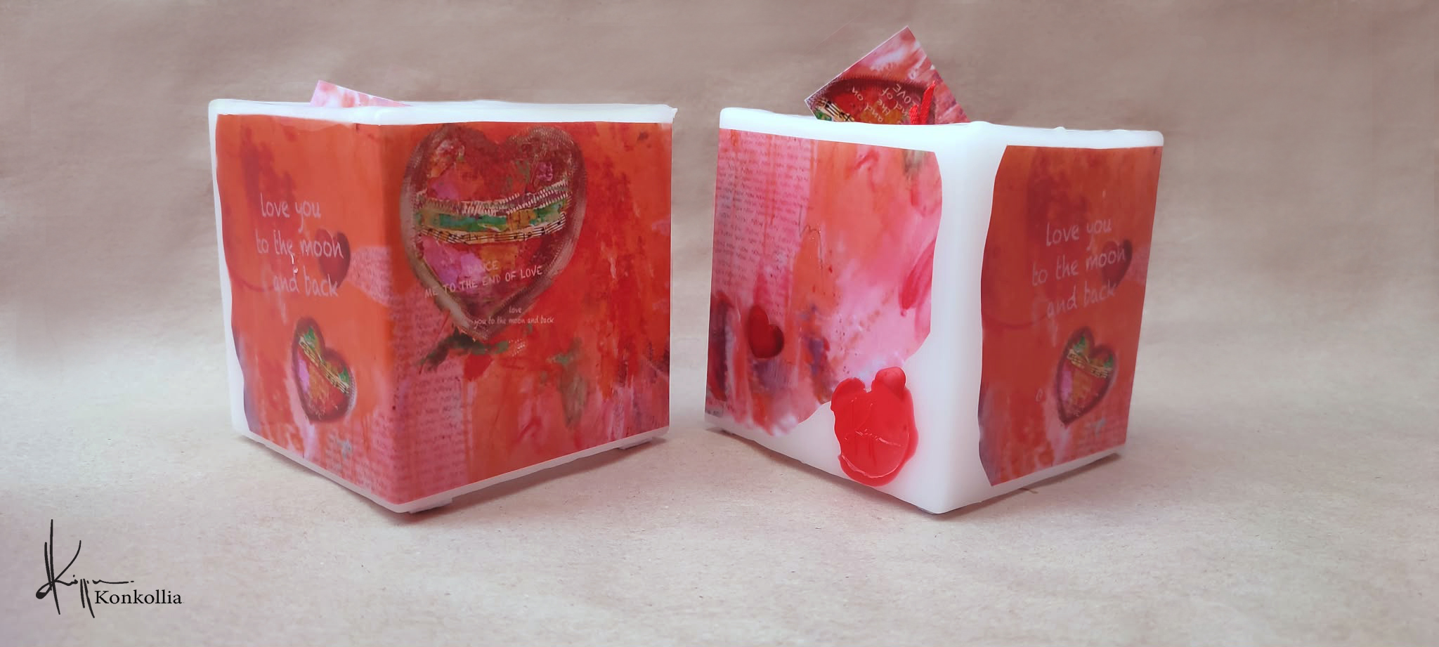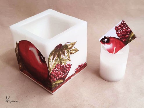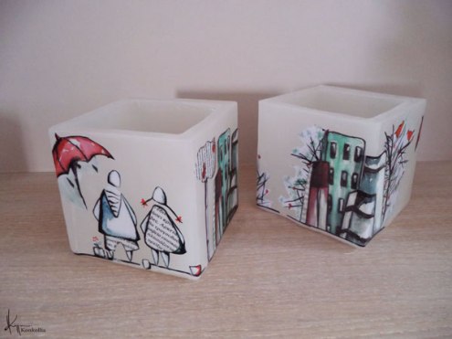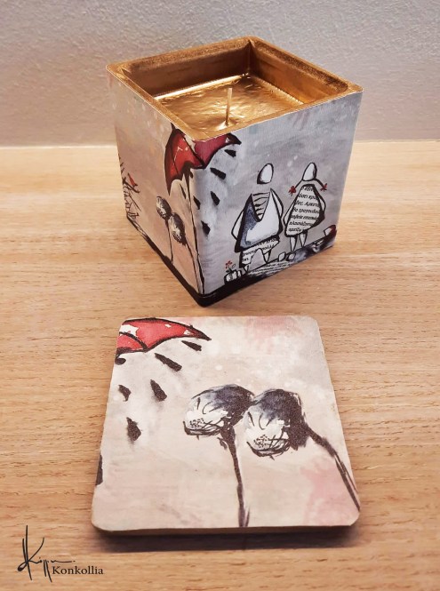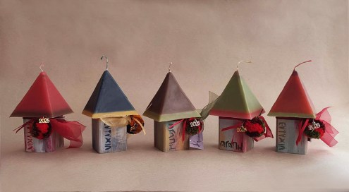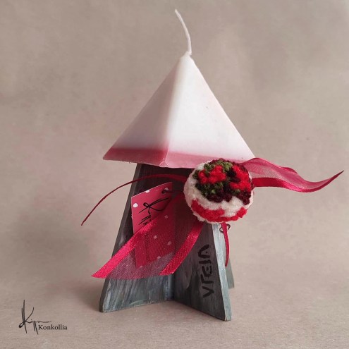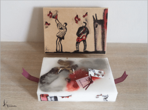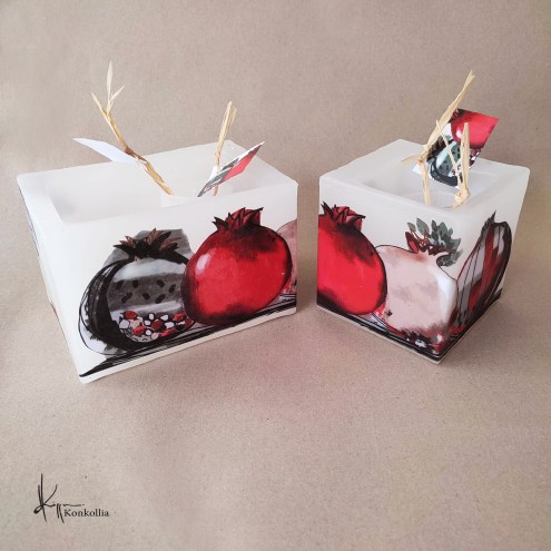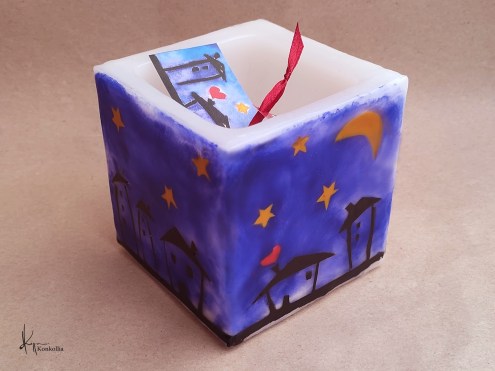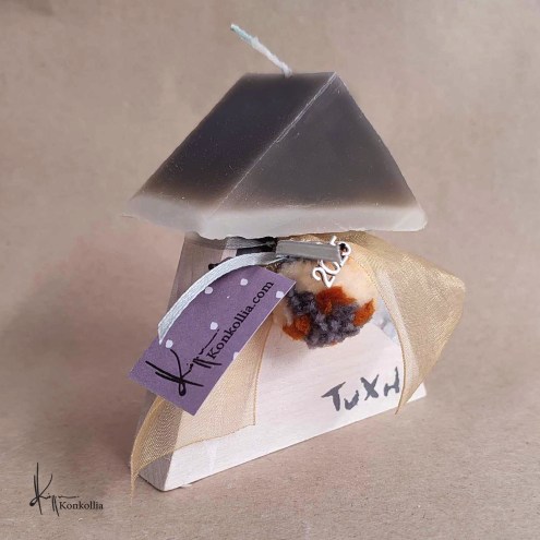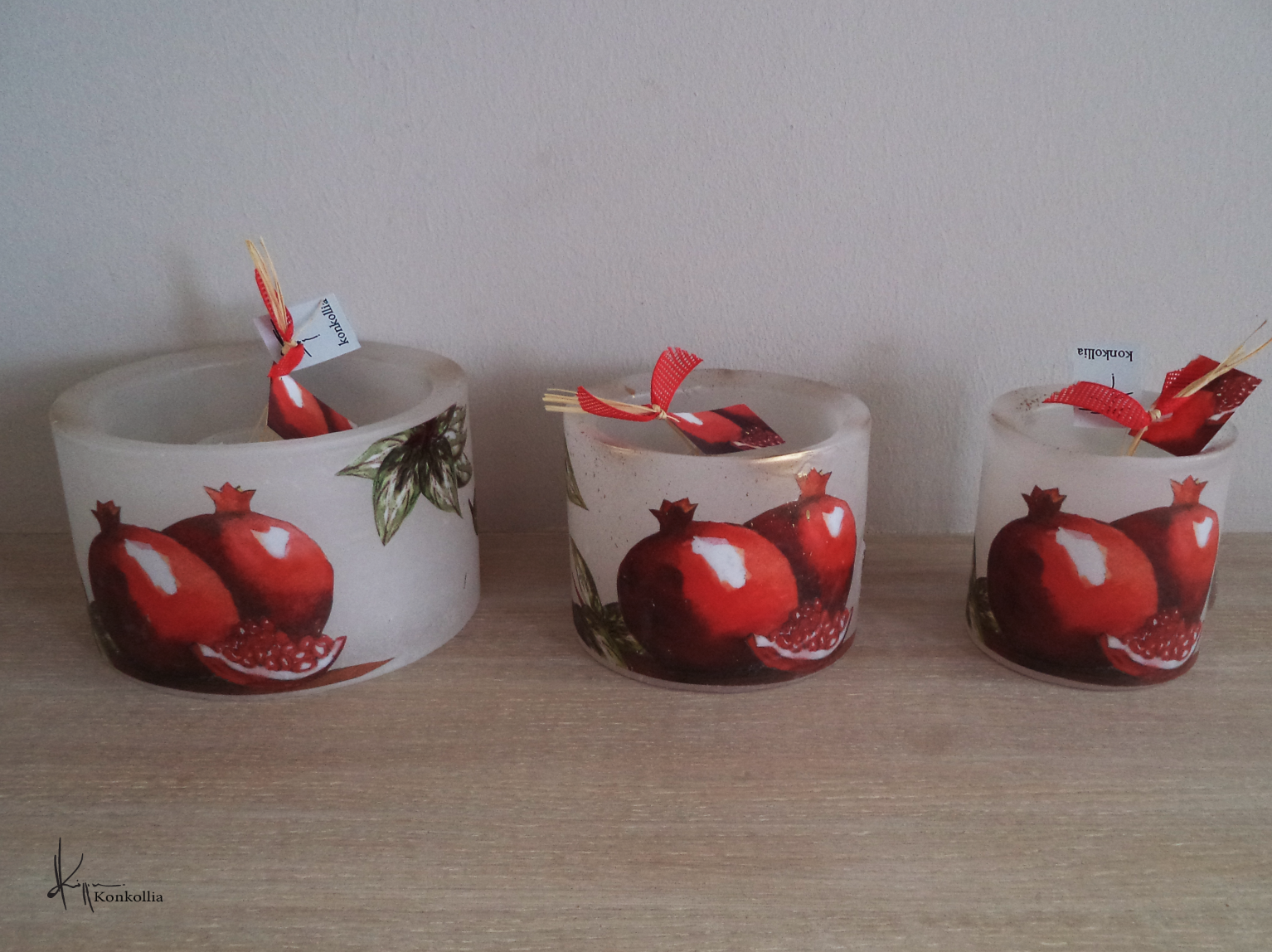 Τα κεριά της Κωνσταντίνας Κόλλια είναι χειροποίητα, κατασκευασμένα με πολύ καλή ποιότητα πρώτης ύλης (παραφίνη). Τα σχέδια τα οποία απεικονίζονται σε αυτές τις δύο κατηγορίες ειναι δικές της δημιουργίες ζωγραφικής σε ακουαρέλα ή άλλης τεχνικής τα οποία ενσωματώνονται μέσα στο κερί. Η συγκεκριμένη τεχνική που έχει επιλέξει η δημιουργός έχει σαν αποτέλεσμα την ευκρίνεια των λεπτομερειών και την καθαρότητα των χρωμάτων των σχεδίων.