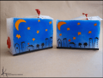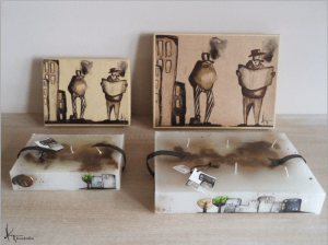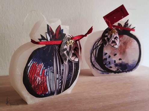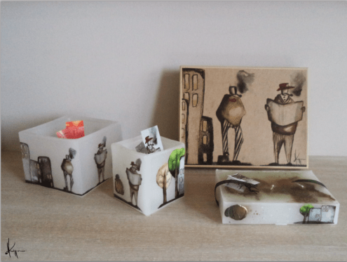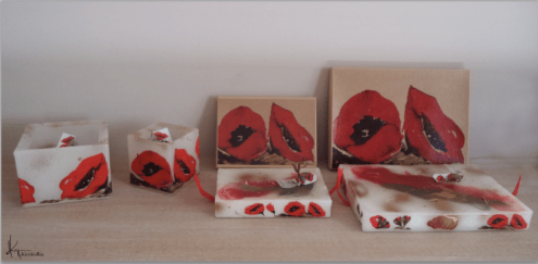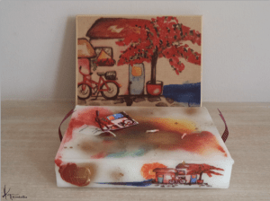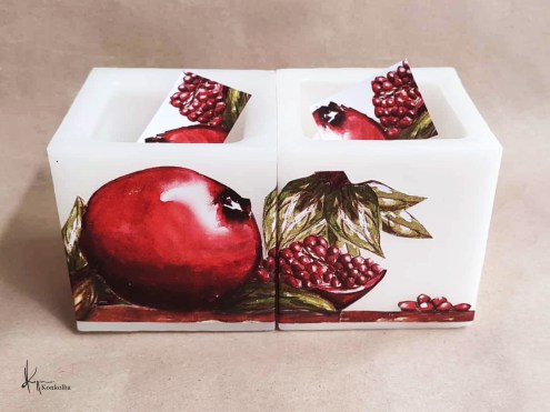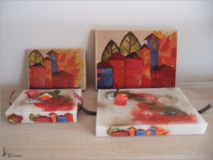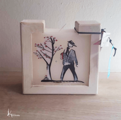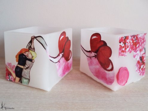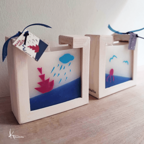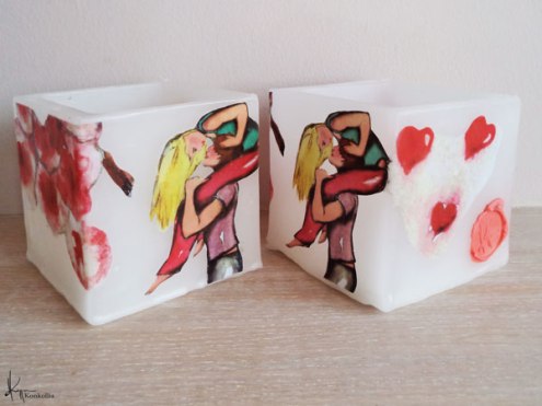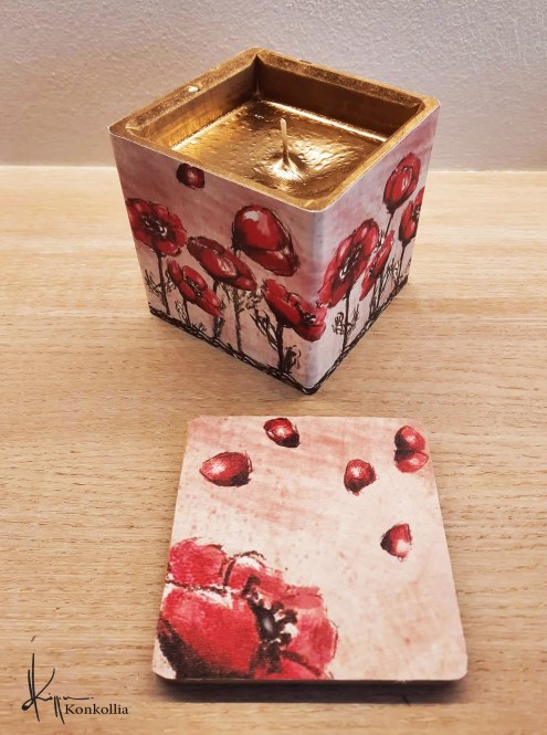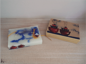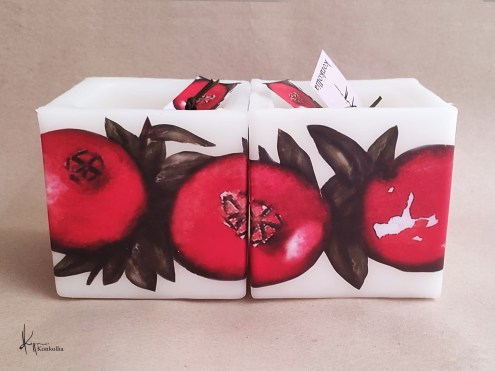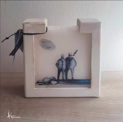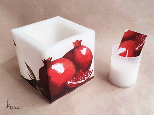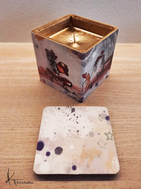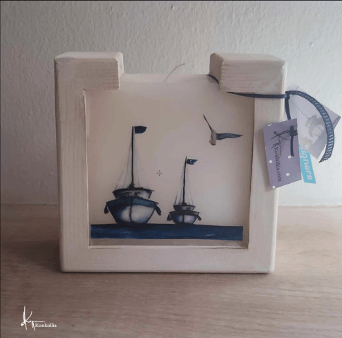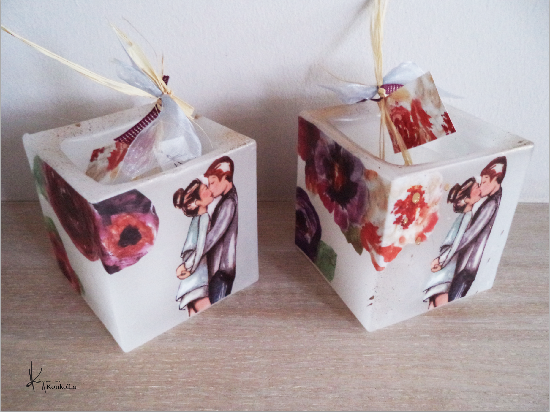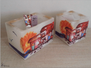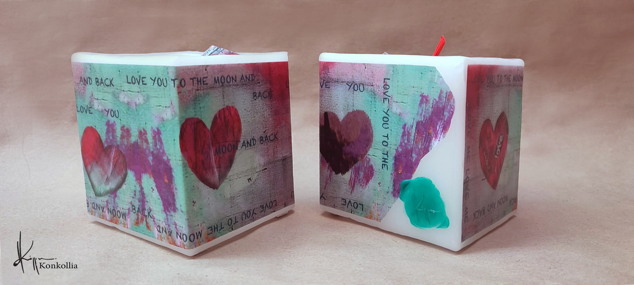 Τα κεριά της Κωνσταντίνας Κόλλια είναι χειροποίητα, κατασκευασμένα με πολύ καλή ποιότητα πρώτης ύλης (παραφίνη). Τα σχέδια τα οποία απεικονίζονται σε αυτές τις δύο κατηγορίες ειναι δικές της δημιουργίες ζωγραφικής σε ακουαρέλα ή άλλης τεχνικής τα οποία ενσωματώνονται μέσα στο κερί. Η συγκεκριμένη τεχνική που έχει επιλέξει η δημιουργός έχει σαν αποτέλεσμα την ευκρίνεια των λεπτομερειών και την καθαρότητα των χρωμάτων των σχεδίων.