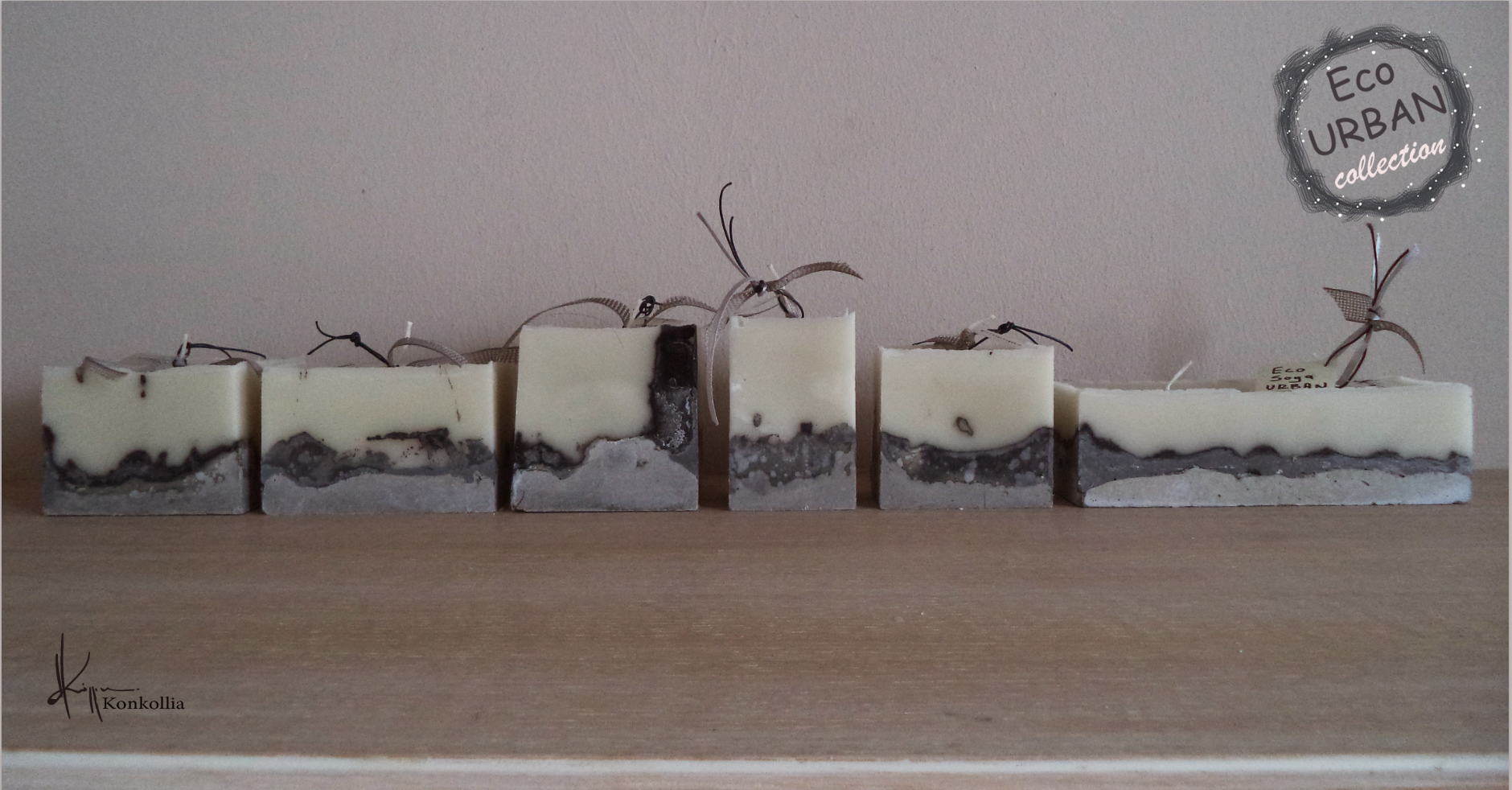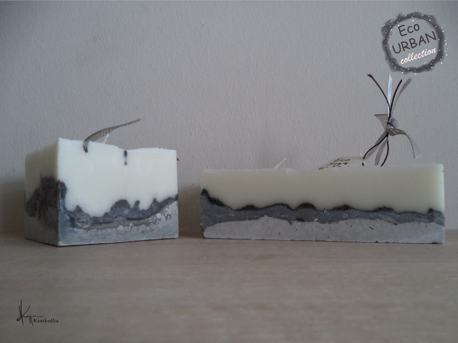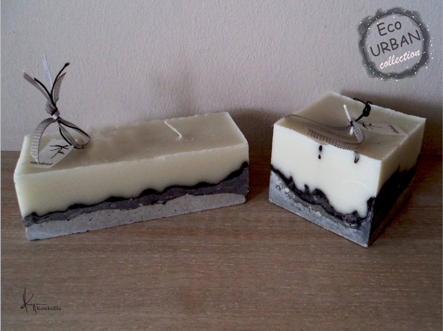 Η νέα σειρά οικολογικών χειροποίητων κεριών με όνομα ”Eco URBAN” αποτελείται από πρωτότυπα κεριά που συνδυάζουν 100% φυτικό κερί σόγιας με βιομηχανικό μπετόν και φυσικό φυτίλι βαμβακιού χωρίς νήμα μετάλλου από ψευδάργυρο ή μόλυβδο.